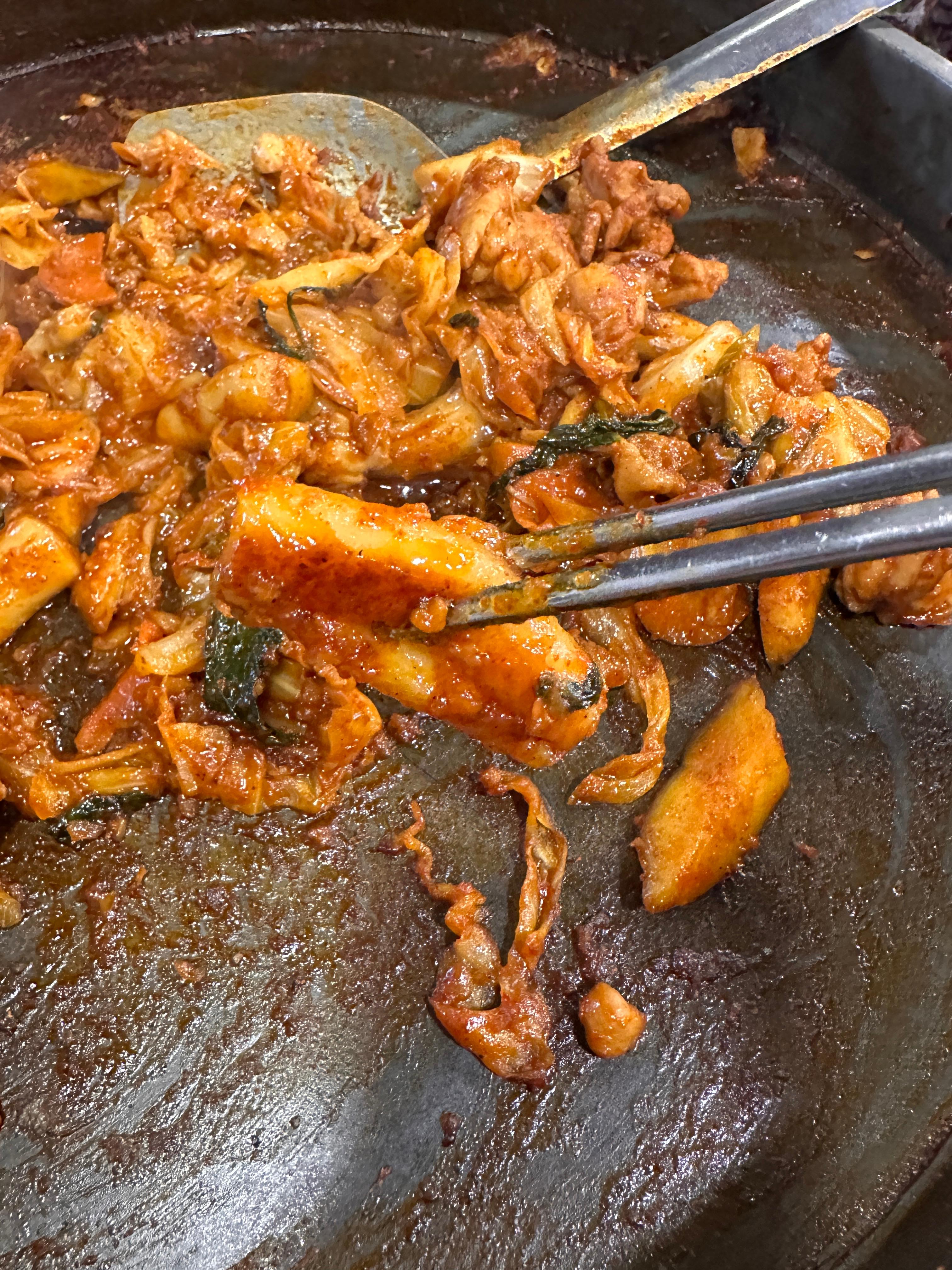 닭은 미리 삶아내지 않고 생고기를 바로 볶아 주시더라고요. 덕분에 육즙이 살아있고 부드러웠어요. 양념은 매콤하면서도 살짝 단맛이 도는 스타일이라 누구나 좋아할 맛! 그리고 채소가 정말 신선했어요. 큼직하게 썬 양배추와 대파, 고구마까지 풍성하게 들어 있어서 식감도 좋고 포만감도 든든했습니다.