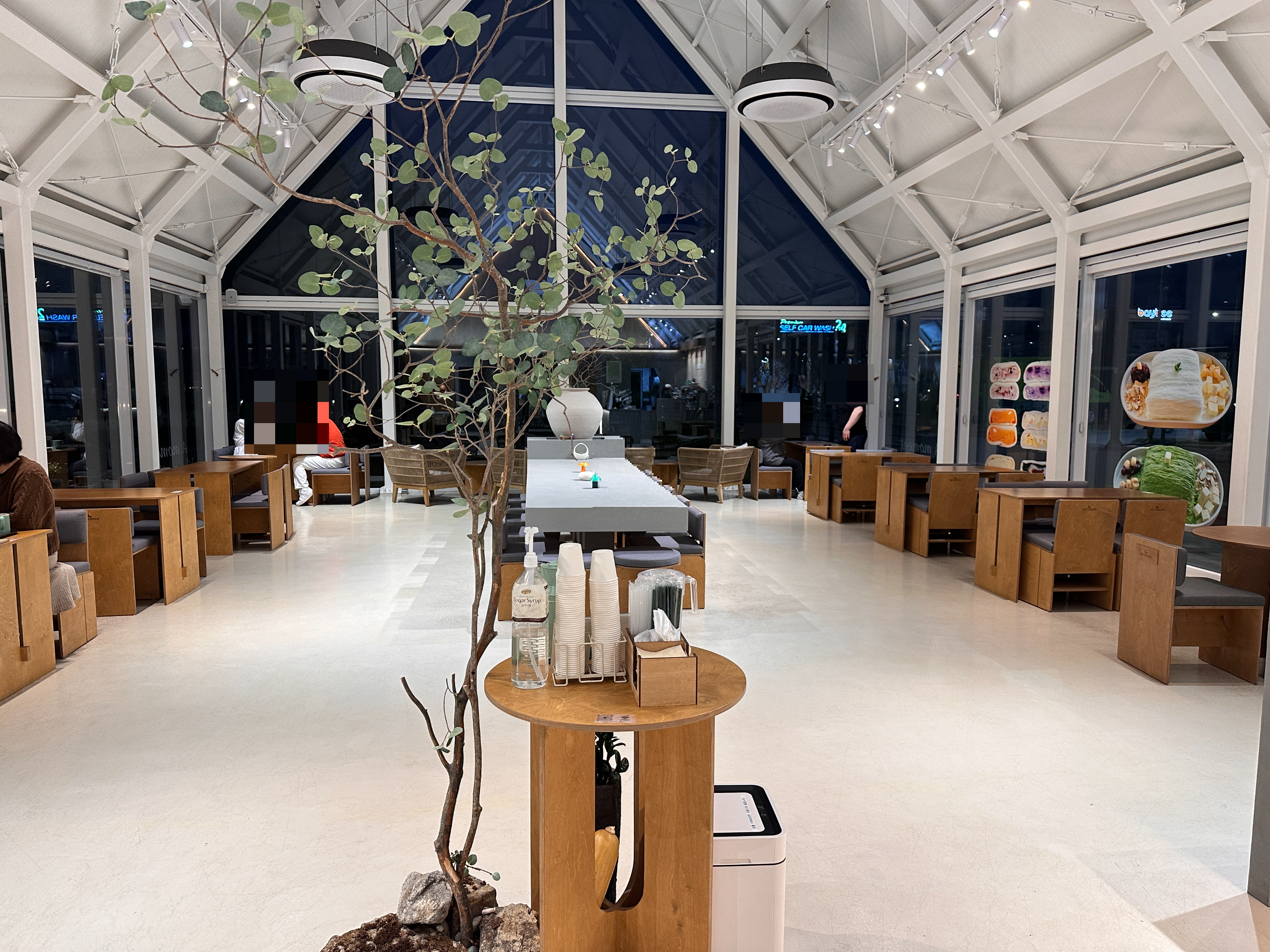 저녁 시간대가 되자, 부드러운 조명이 점차 켜지기 시작했는데, 형광등처럼 밝기만 한 것이 아니라 노란빛이 감도는 앰버 톤이라 따뜻함을 더해줬어요. 특히나 모찌빵이나 라떼 같은 먹거리를 테이블 위에 놓고 사진을 찍으니, 음식 색감까지 살아나는 기분이었죠. “분위기는 물론이고, SNS 업로드에도 좋다!”라는 게 저희 일행들의 공통된 의견이었습니다. - 편안한 좌석