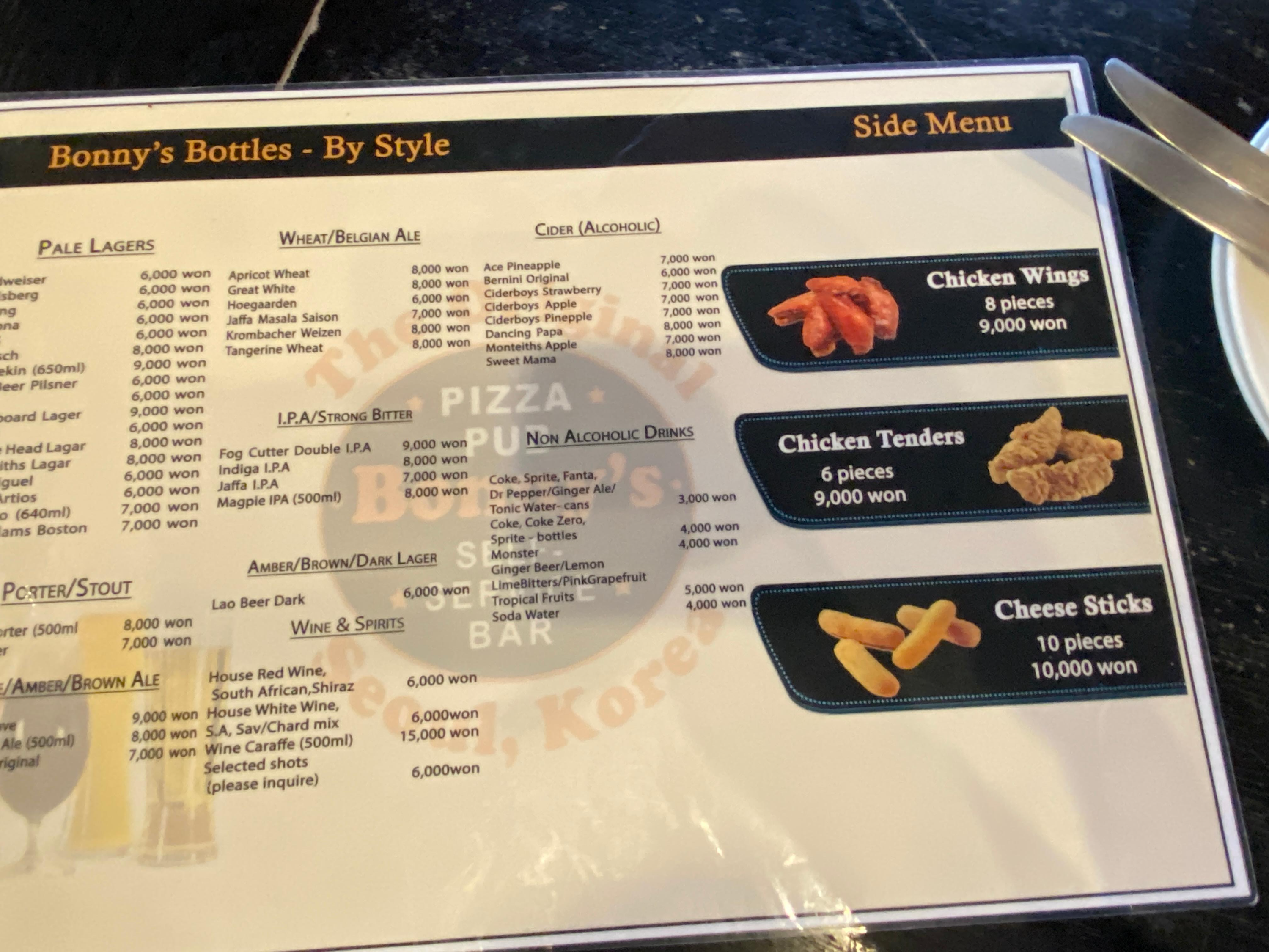 그래서 메뉴판을 살펴보다가, 사이드 메뉴로는 치킨윙, 감자튀김, 샐러드 등이 눈에 들어왔어요. 맥주를 한잔하면서 곁들이기 좋은 메뉴들이라, 단순히 피자를 즐기기보다는 가벼운 펍 분위기를 살릴 수 있게 구성이 되어 있었습니다. 이 점이 바로 해방촌 맛집으로 불리는 또 하나의 이유가 아닐까 싶어요. 예쁘고 감각적인 인테리어 속에서 피자와 맥주, 그리고 사이드까지 한 번에 해결되니 말이죠.