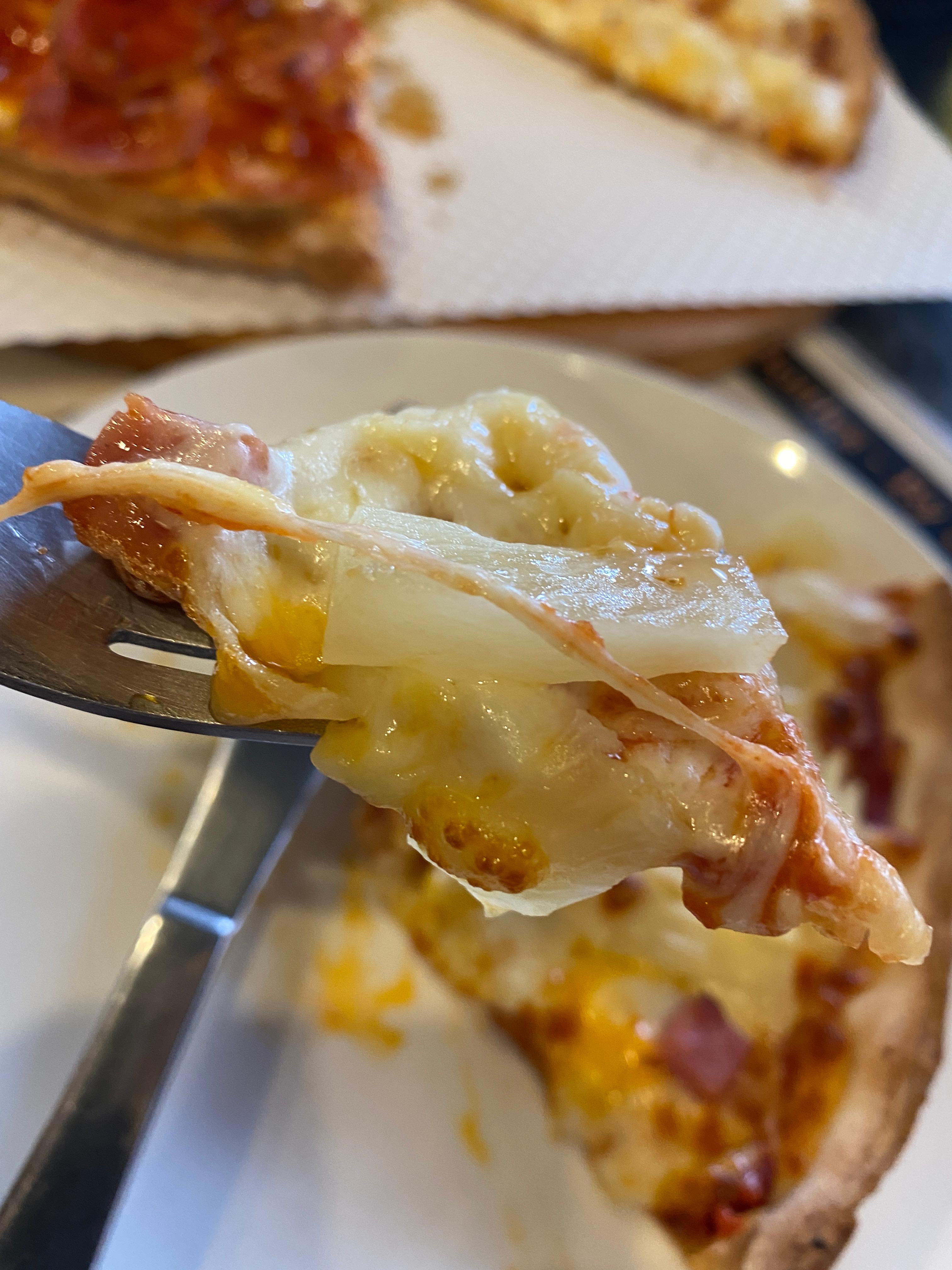 먼저 페퍼로니 쪽은 베이직한 만큼 짭조름한 페퍼로니와 진한 치즈가 입안에 꽉 차는 만족감을 주었고, 토마토소스도 강하지 않아 부담이 없었습니다. 하와이안 쪽은 파인애플 특유의 달콤하고 상큼한 맛이 기름진 치즈, 햄과 조화를 이루면서 오히려 마지막까지 느끼하지 않게 해주더군요. 한 조각씩 번갈아가며 먹다 보니 배가 꽤 빨리 불렀지만, 도우가 바삭하면서도 적당히 도톰해서 금방 질리지 않았습니다.