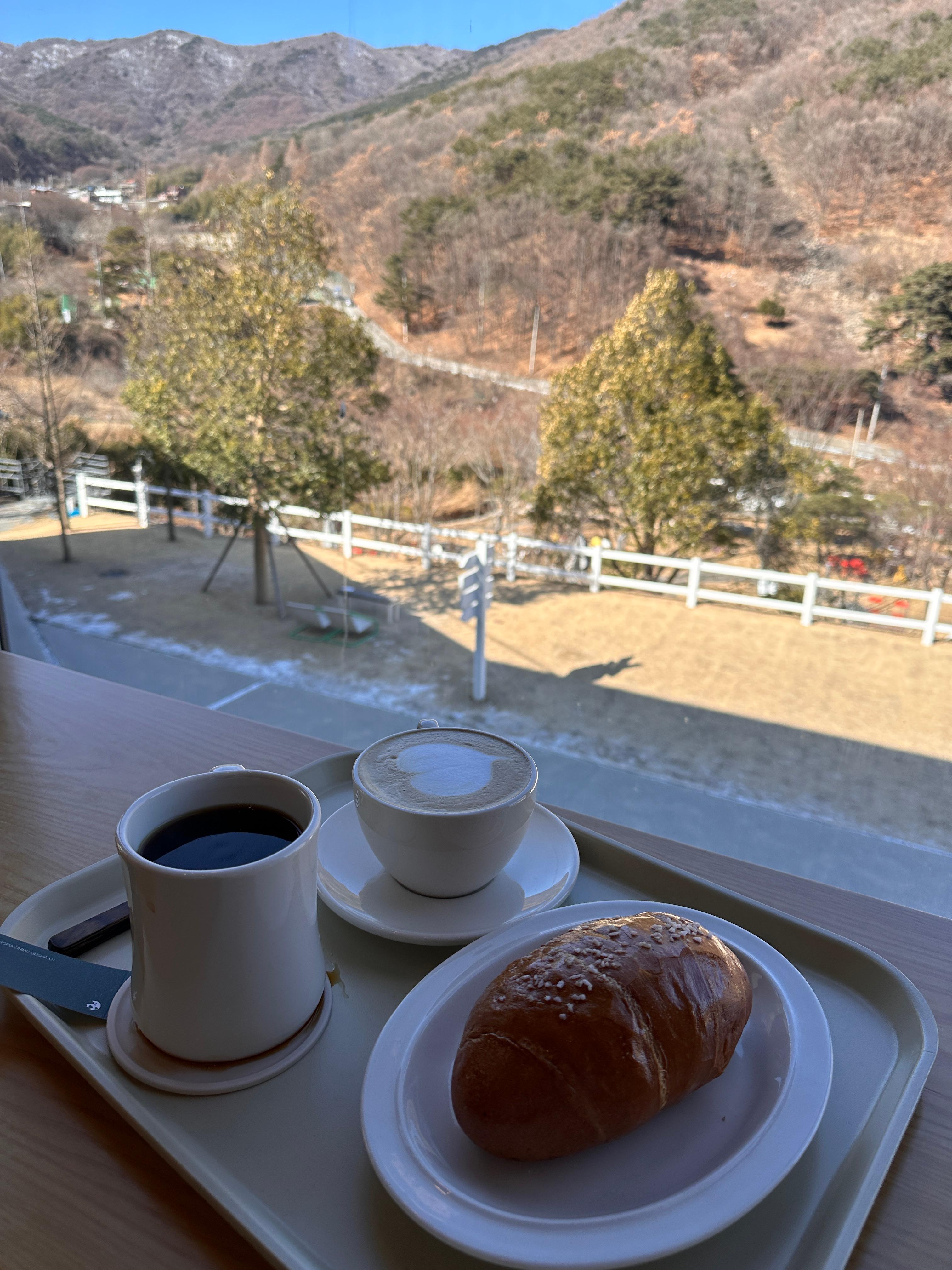 다음으로 중요한 메뉴 이야기를 해볼까 합니다. 제가 방문했을 당시에는 아메리카노, 라떼 등 기본적인 커피 메뉴가 잘 구비되어 있었고, 계절 한정 메뉴도 몇 가지 보였습니다. 대표적으로 자몽 에이드나 과일 차 같은 상큼한 음료가 인기가 많아 보였고, 무엇보다 빵이나 디저트 종류가 제법 다양했습니다. 저희는 소금빵과 아메리카노를 주문했는데, 빵은 짭쪼롬한 부드러운 식감이 꽤 좋았어요. 아메리카노도 적당히 진하면서 쓴맛과 신맛의 밸런스가 괜찮았습니다. 여기서 직접 베이킹을 하는 것인지, 은은한 빵 냄새가 카페를 가득 채워주어 식욕을 더욱 자극하더군요. 가창 카페 중에서도 자체 디저트를 제공하는 곳은 많지 않기에, 이 점이 큰 메리트가 될 것 같습니다. 가격대는 대체로 시내 카페들과 비슷하거나 약간 높은 편이었습니다. 하지만 시원한 풍경과 넓은 테이블, 다양한 메뉴를 고려하면 충분히 합리적인 수준이라 느껴졌습니다.