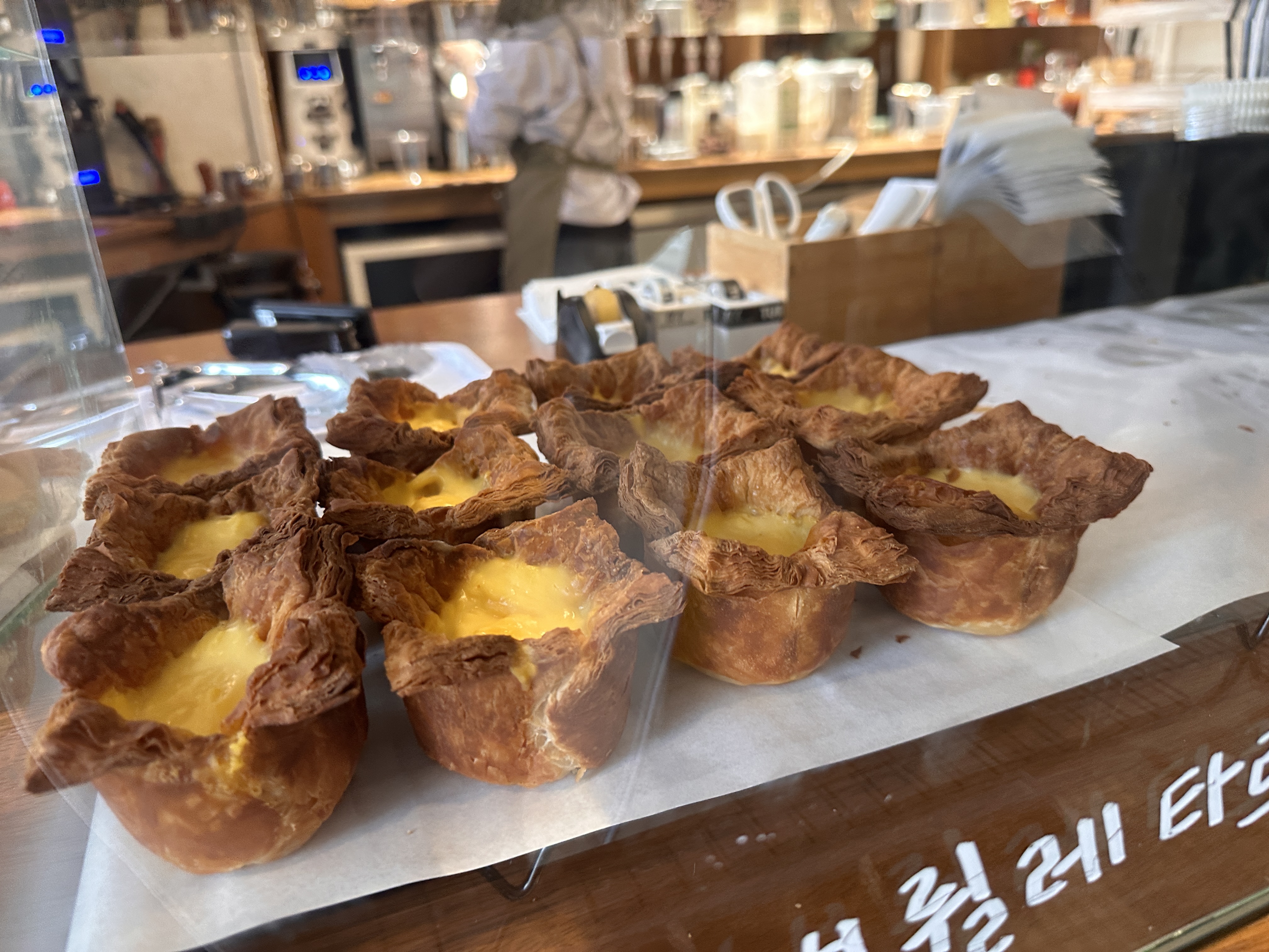이건 TTT라떼 위에 크림이 얹혀진 형태로, 한층 더 부드럽고 달콤한 풍미를 내더군요. 거품이나 휘핑 정도가 아닌, 묵직하면서도 가볍게 입안에서 퍼지는 크림이라, 한 모금 마실 때마다 입술에 살짝 묻을 정도로 진득했어요. 살짝 달콤하면서도 커피의 풍미는 놓치지 않아, 디저트를 곁들이지 않아도 이 음료 하나로 달콤함을 충족할 수 있을 것 같았습니다. 이걸 한 입 마시니, “이곳은 정말 대구 라떼 맛집로 불려도 손색이 없구나!”라는 생각이 절로 들더라고요. - 에그타르트
