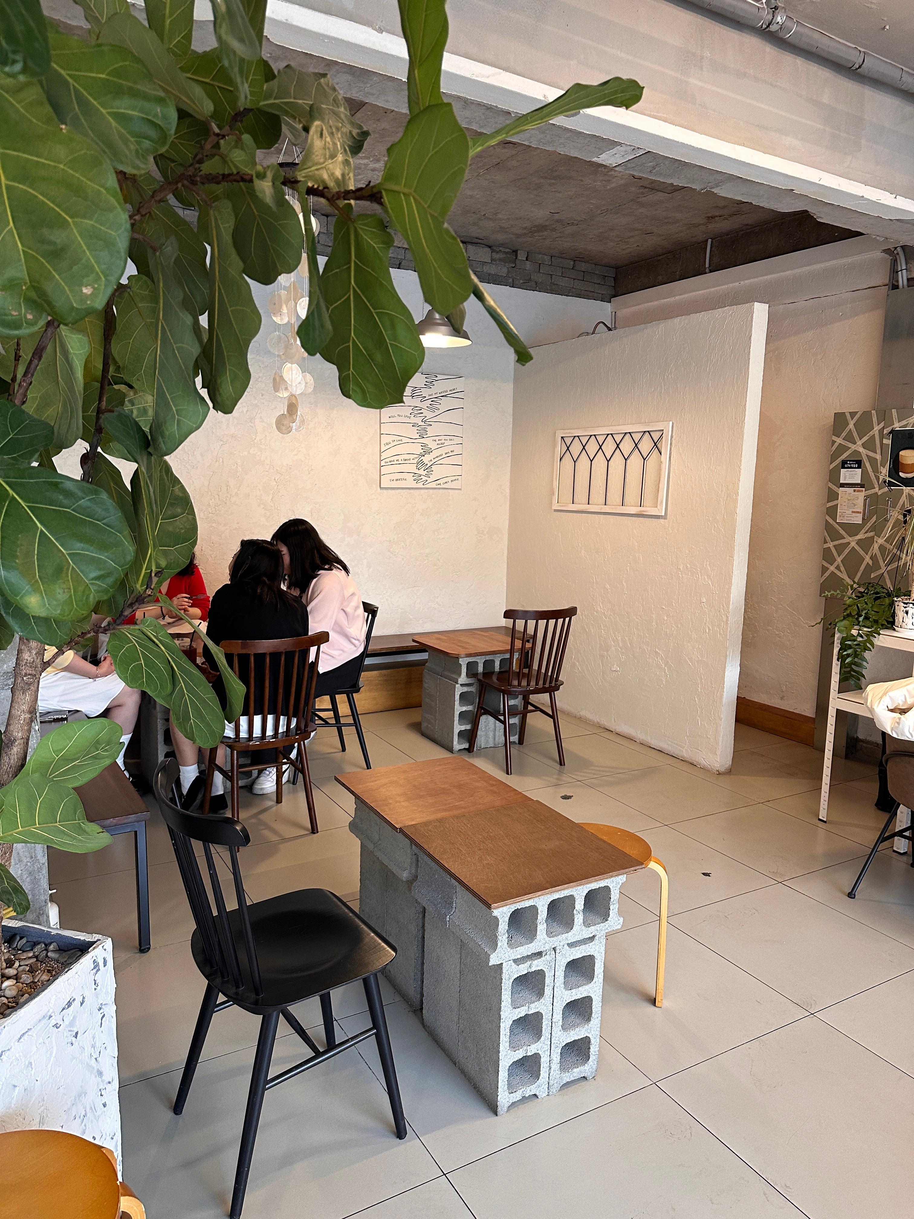 주문한 음료를 받아들고 자리를 잡으니, 내부 인테리어가 깔끔하고 은은하게 조명이 깔려 있어 차분한 느낌이 인상적이었어요. 원목 테이블과 의자들, 그리고 창가에 놓인 화분 등이 전체적으로 내추럴한 분위기를 자아내더군요. 사람이 많지 않아 북적이지 않았고, 한쪽에선 혼자 공부하거나 책을 읽는 분들도 몇 명 보였습니다.