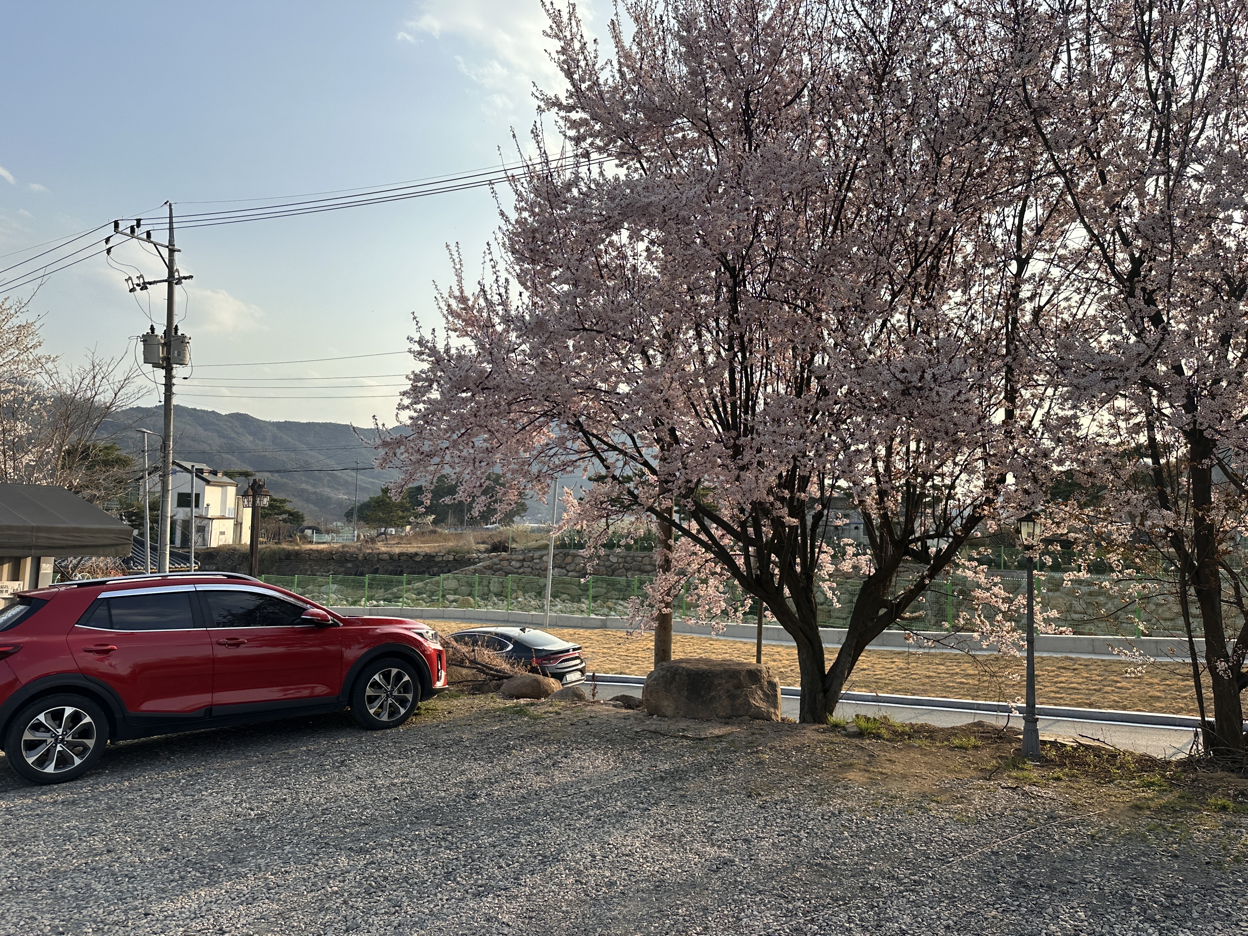 식당 앞 주차장 넓긴 하지만, 피크 타임엔 금방 찰 수 있으니 조금 일찍 도착하면 좋습니다. - 벚나무 구경