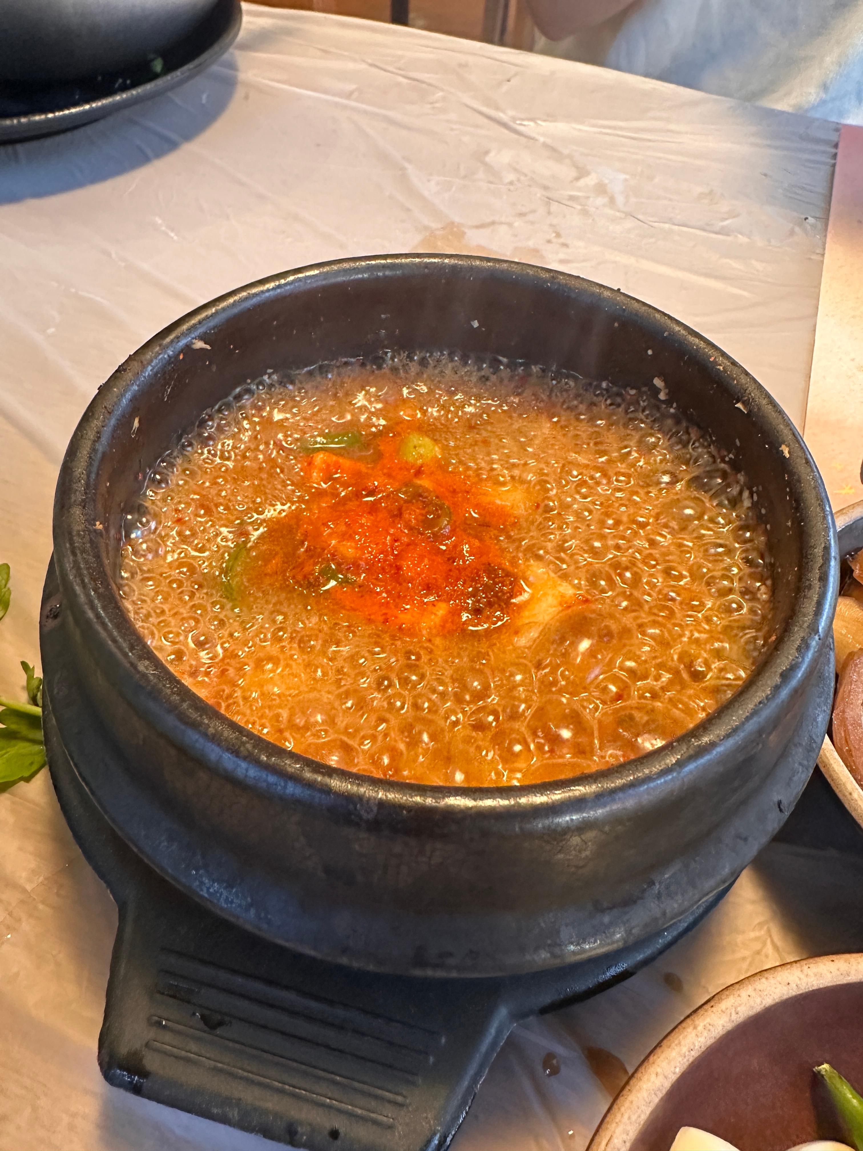 사실 삼겹살엔 된장찌개가 빠질 수 없죠. 적당한 칼칼함과 구수함이 밥도둑이었습니다. 한 숟갈 먹어보니, 안에 두부와 애호박, 양파 등이 푸짐하게 들어가서 깔끔하게 즐길 수 있었어요. 전체적으로 “대구 미나리 삼겹살 맛집답게, 곁들이 메뉴들도 빠짐없이 만족스럽다”는 느낌이 들었습니다.