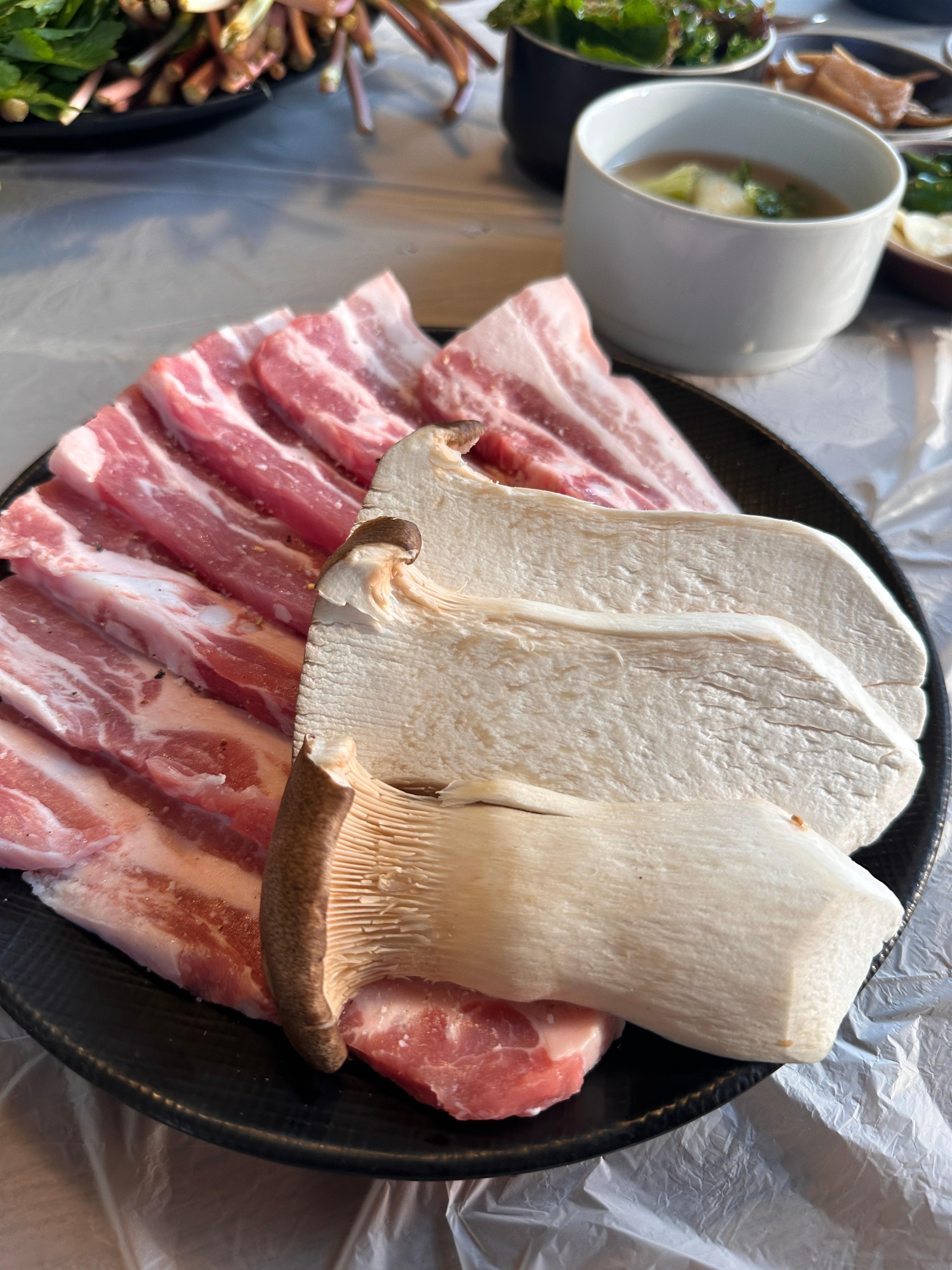 삼겹살이 노릇하게 익으면, 한입 크기로 잘라낸 뒤 미나리와 함께 싸먹어 봤어요. 이게 정말 신의 한 수였달까요. 미나리 특유의 향긋함과 아삭함이 기름진 삼겹살에 상큼함을 더해주니, 계속 손이 갔습니다. 보통 상추쌈이나 깻잎쌈을 떠올리는데, 미나리는 그와 또 다른 묘미가 있어요. “이러니 사람들이 봄에 이곳을 찾는구나!” 하고 납득이 됐어요. 대구 미나리 삼겹살 맛집이라는 칭호가 과장이 아니더라고요.