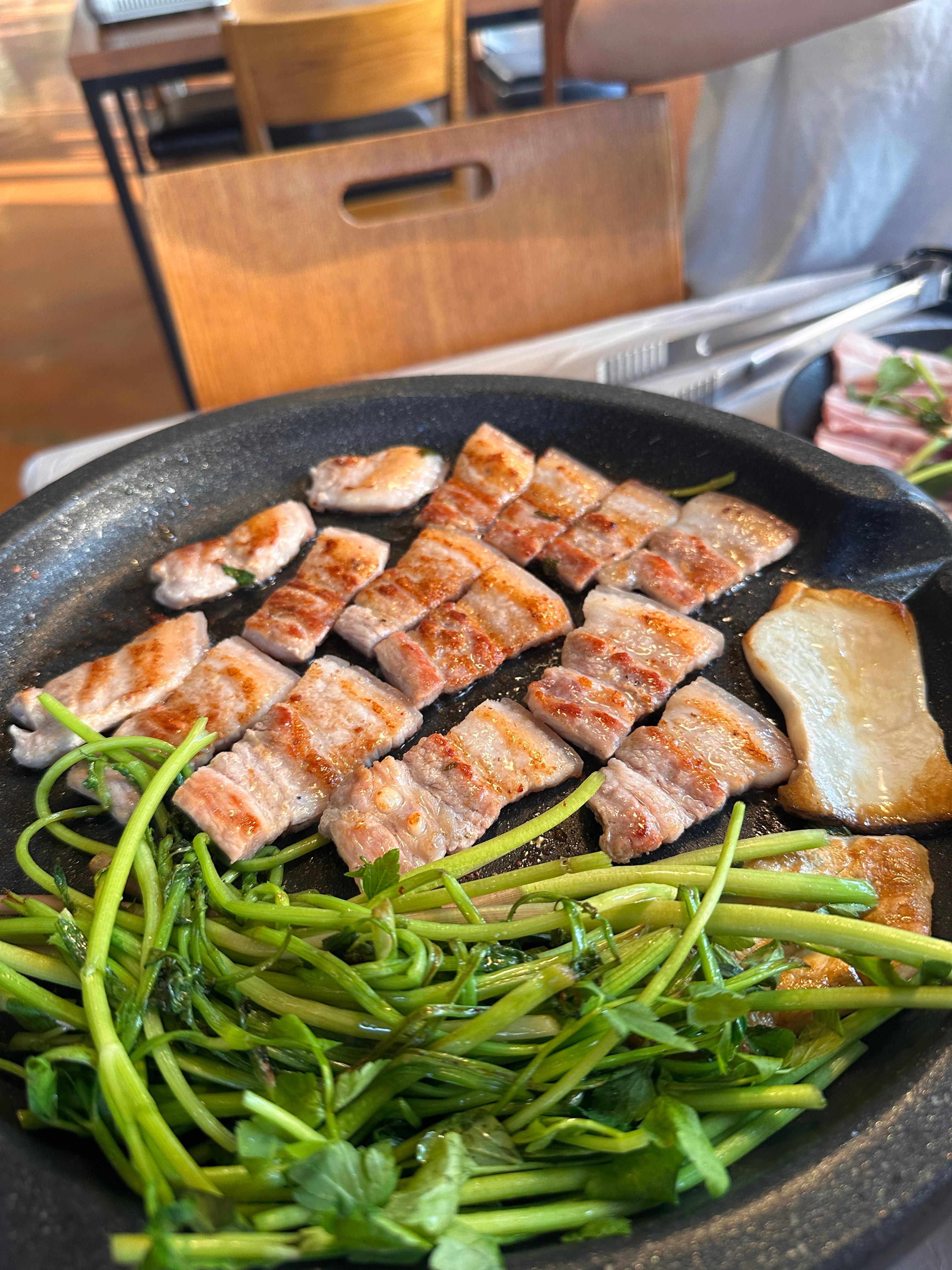 음식이 나오니, 윤기 나는 삼겹살과 신선한 미나리가 따로 담겨 있었어요. 미나리는 싱싱하고 초록빛이 도는 상태라, 보기만 해도 아삭할 것 같은 느낌이었죠. 고기를 구울 때 미나리를 같이 구워서 먹나 싶었는데, 직원분이 “삼겹살 다 구워서 한입 크기로 자른 뒤에 미나리를 싸서 드시면 됩니다”라고 알려주셨어요.