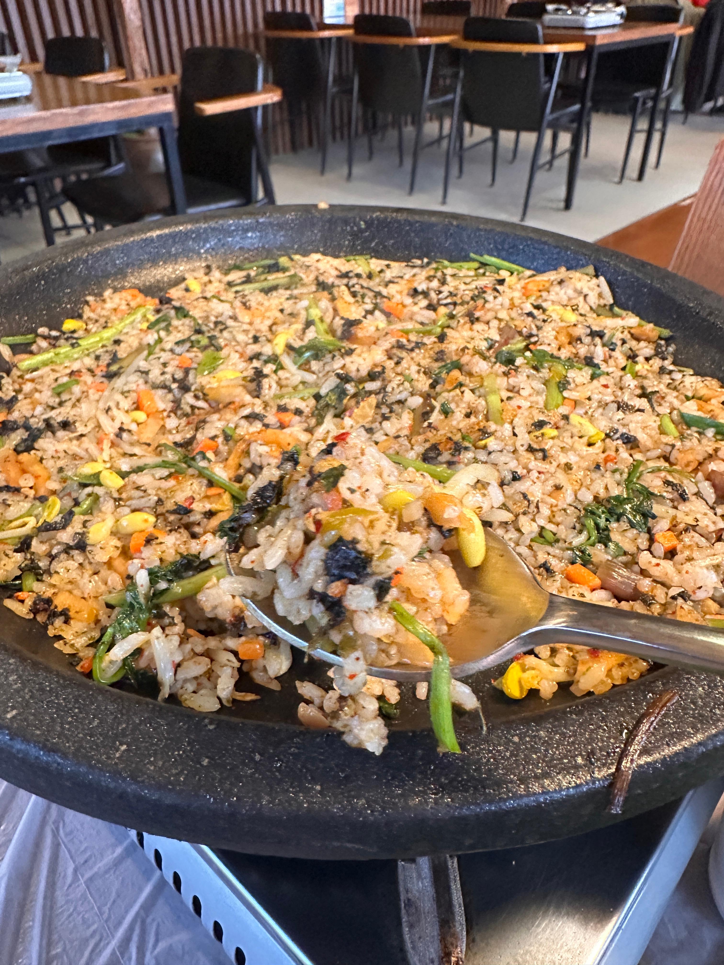 원래 이 집을 알아볼 때, 후기를 작성하면 시골촌두부와 볶음밥을 서비스로 제공하는 이벤트가 있다는 걸 알았어요. 그래서 테이블에 앉자마자 “혹시 리뷰 이벤트 아직 하시나요?” 하고 물어봤는데, 한다고 해서 참여하게 됐죠. 촌두부는 뽀얗고 부드러운 질감이 좋았고, 볶음밥은 고기를 먹고 난 뒤에 마무리로 먹으니 속이 든든했습니다.