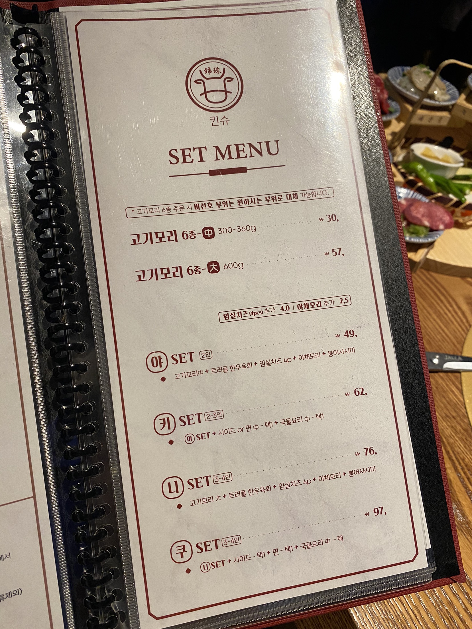 메뉴판을 보면 모둠 형태의 야키니쿠 세트가 있어 여러 부위를 한꺼번에 맛볼 수 있게 되어 있고, 사이드로 샐러드, 미소시루(된장국), 작은 주먹밥 등의 구성을 맞출 수 있습니다. 대구 야키니쿠 맛집의 진가를 보려면 역시 모둠 구이와 하이볼 콤보를 시도하는 게 정석이겠죠.