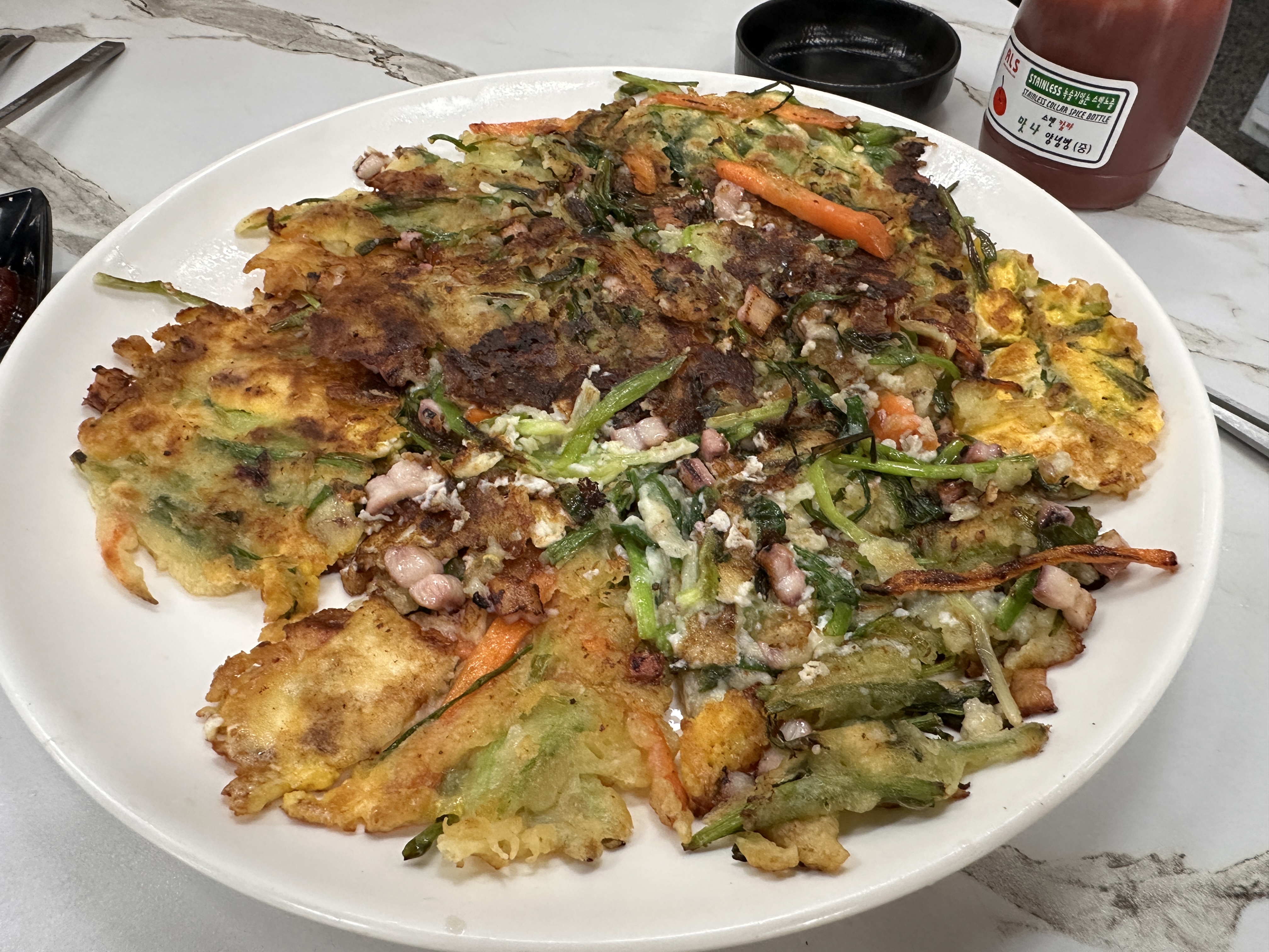 평소에 해물파전을 자주 먹긴 하지만, 부추해물전은 또 다른 매력이 있었습니다. 부추 특유의 향과 달콤함이 살아 있고, 해물도 제법 푸짐하게 들어가 있어 씹히는 맛이 다양했어요. 튀기듯이 구워낸 듯 바삭한 식감이 좋아, 식사 중간중간 하나씩 떼어 먹기 딱이었습니다. 개인적으로는 간장 양념장보다는 낙지볶음 양념에 살짝 찍어 먹어도 별미였다고 생각해요.