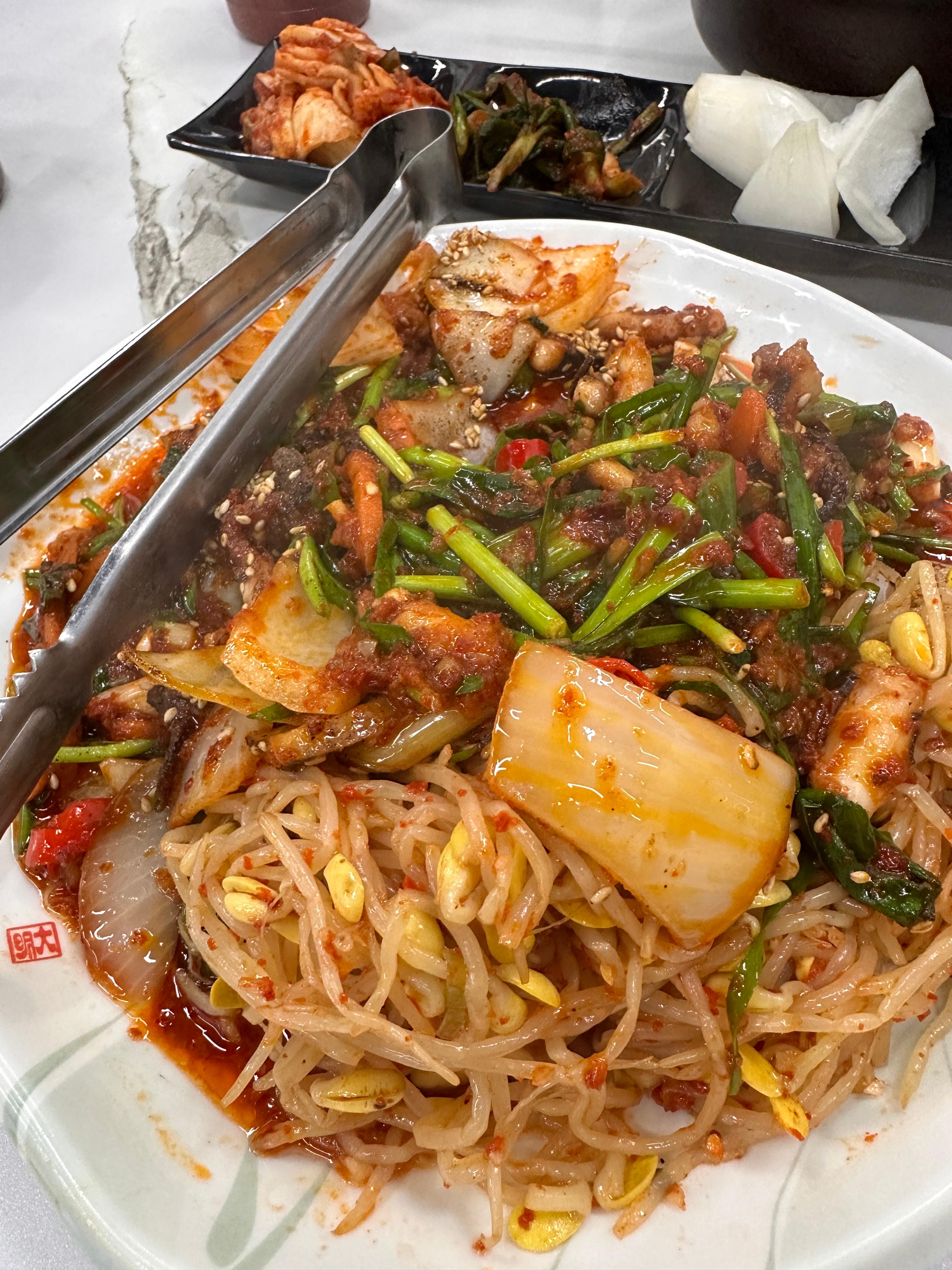 음식이 하나둘 나와서 먹기 시작하니, “아, 봄 나들이 코스로 왜 이곳이 유명한지 알겠다”라는 생각이 들었습니다. 아침에 벚꽃을 실컷 구경한 뒤, 배가 고파진 상태에서 매콤하고 시원한 음식을 먹으니 만족도가 두 배였죠. 저는 개인적으로 낙지볶음에 꽂혔고, 다른 친구들은 열무보리밥을 폭풍 흡입했어요.