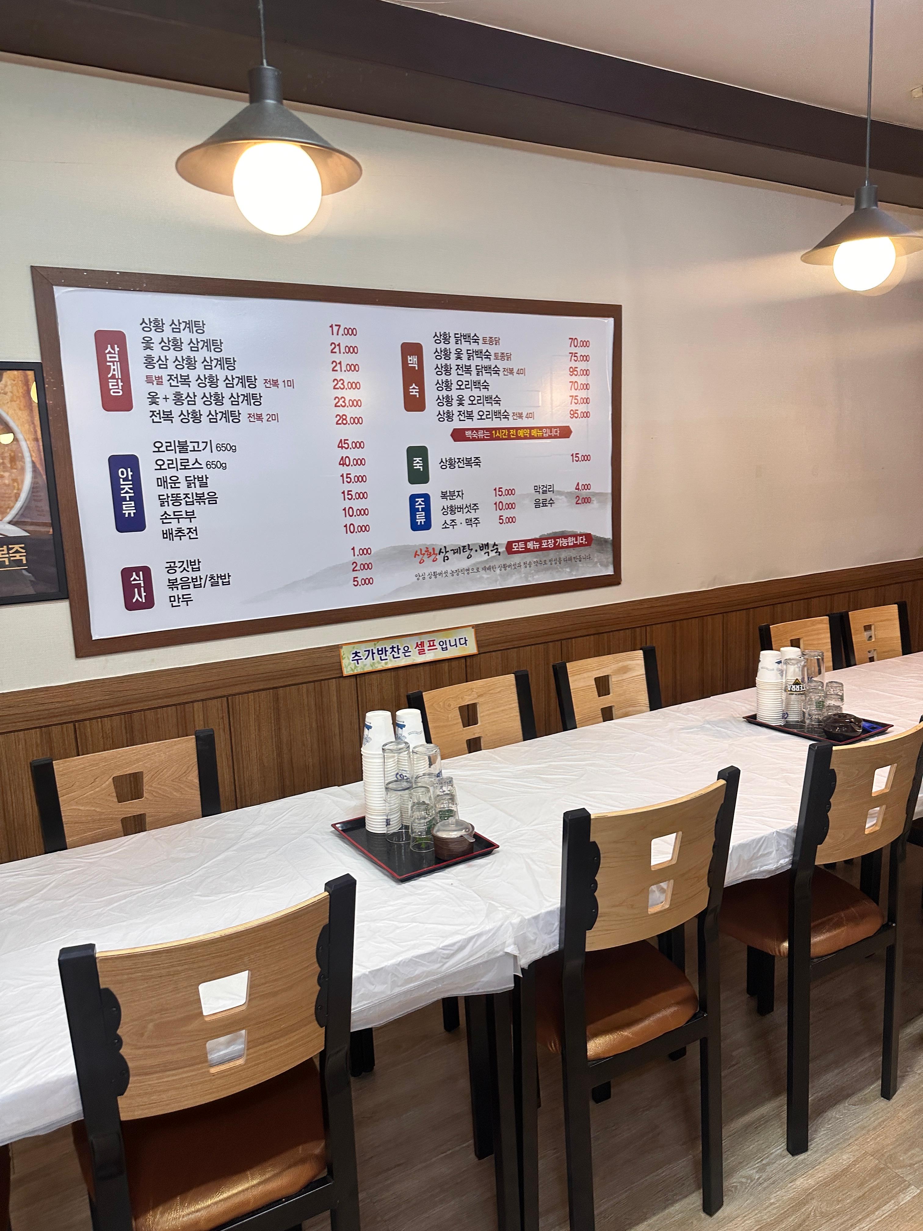 가격대는 삼계탕류는 17,000원~25,000원, 백숙류는 60,000원~80,000원 정도였습니다. 가격 대비 재료의 질과 양을 고려했을 때 합리적이라는 생각이 들었습니다. 대구 칠곡 맛집답게 다양한 보양식 선택지가 있어 가족 외식이나 모임 장소로도 좋겠다는 인상을 받았습니다.