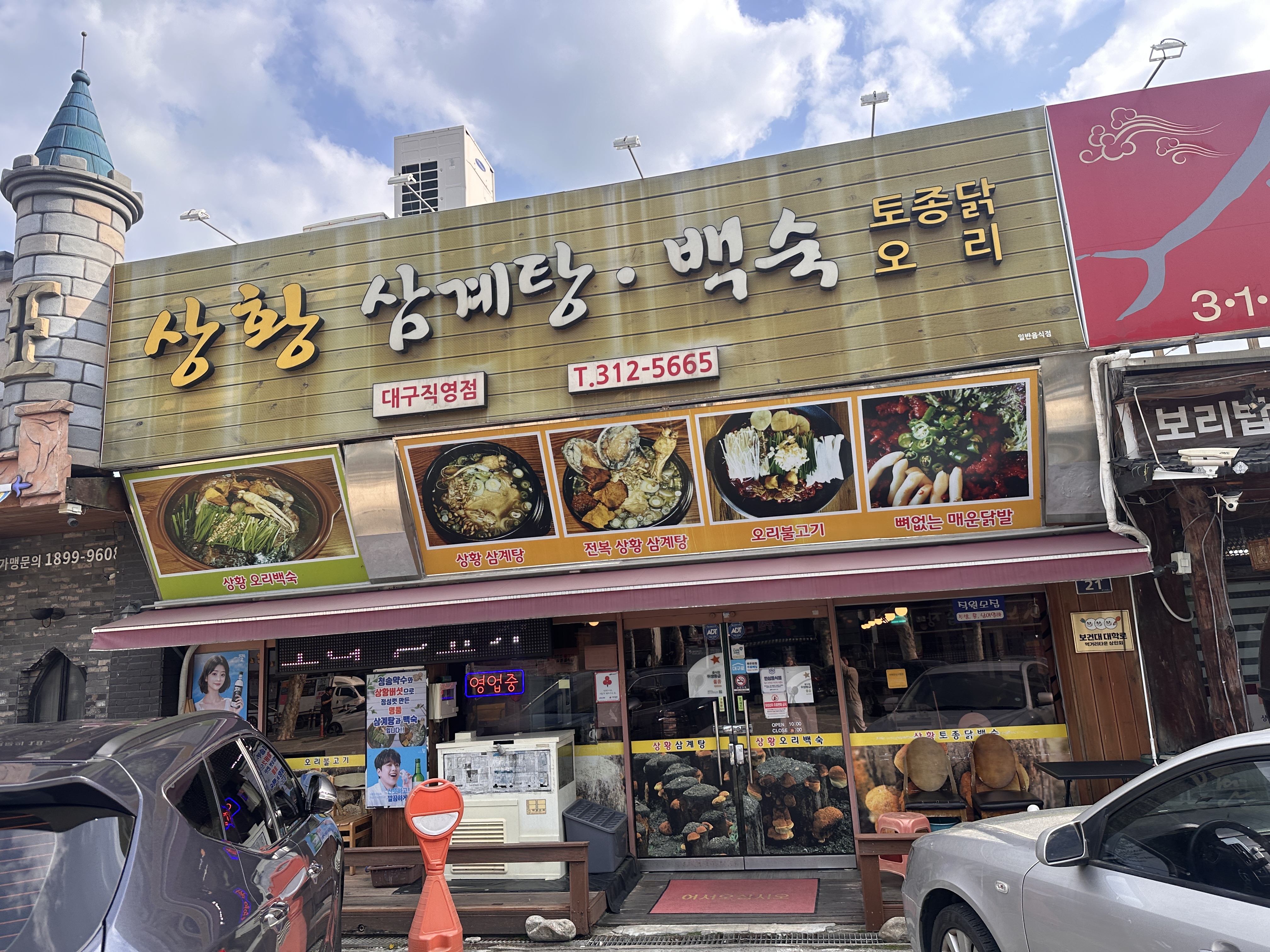 상황삼계탕백숙은 대구 북구 칠곡지구 중심부에 위치해 있어 접근성이 뛰어납니다. 큰길가에 바로 자리하고 있어 내비게이션을 따라 오면 쉽게 찾을 수 있었고, 도로변에 위치한 만큼 처음 오는 사람도 헤매지 않고 도착할 수 있습니다.