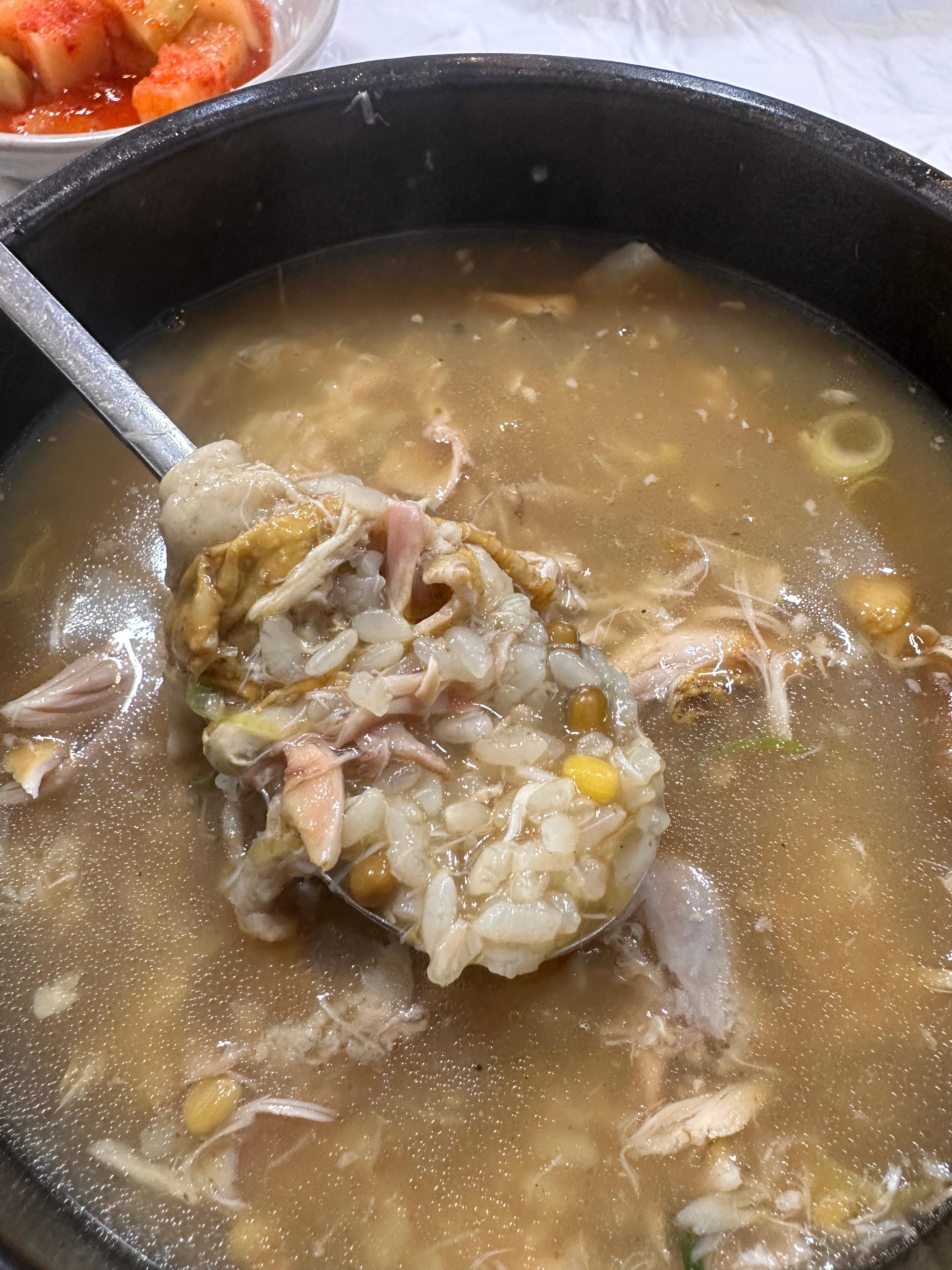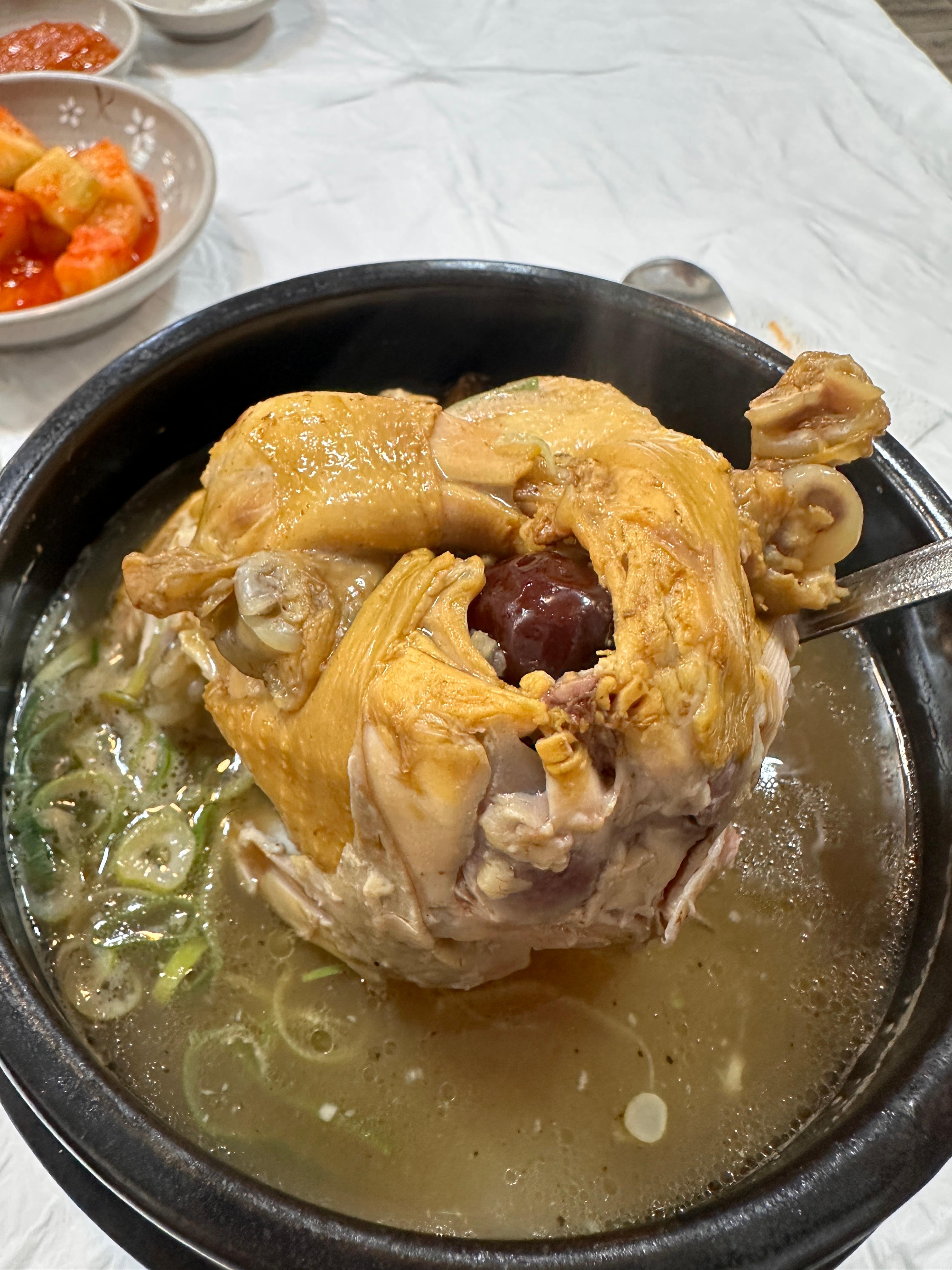 닭고기도 훌륭했습니다. 부드럽게 잘 삶아져서 별다른 힘을 들이지 않고도 쉽게 발라 먹을 수 있었고, 살코기는 촉촉하고 담백했습니다. 속을 가득 채운 찹쌀밥에는 대추, 밤, 인삼 조각이 함께 들어 있어 삼계탕의 본질적인 맛을 풍성하게 해주었습니다.
