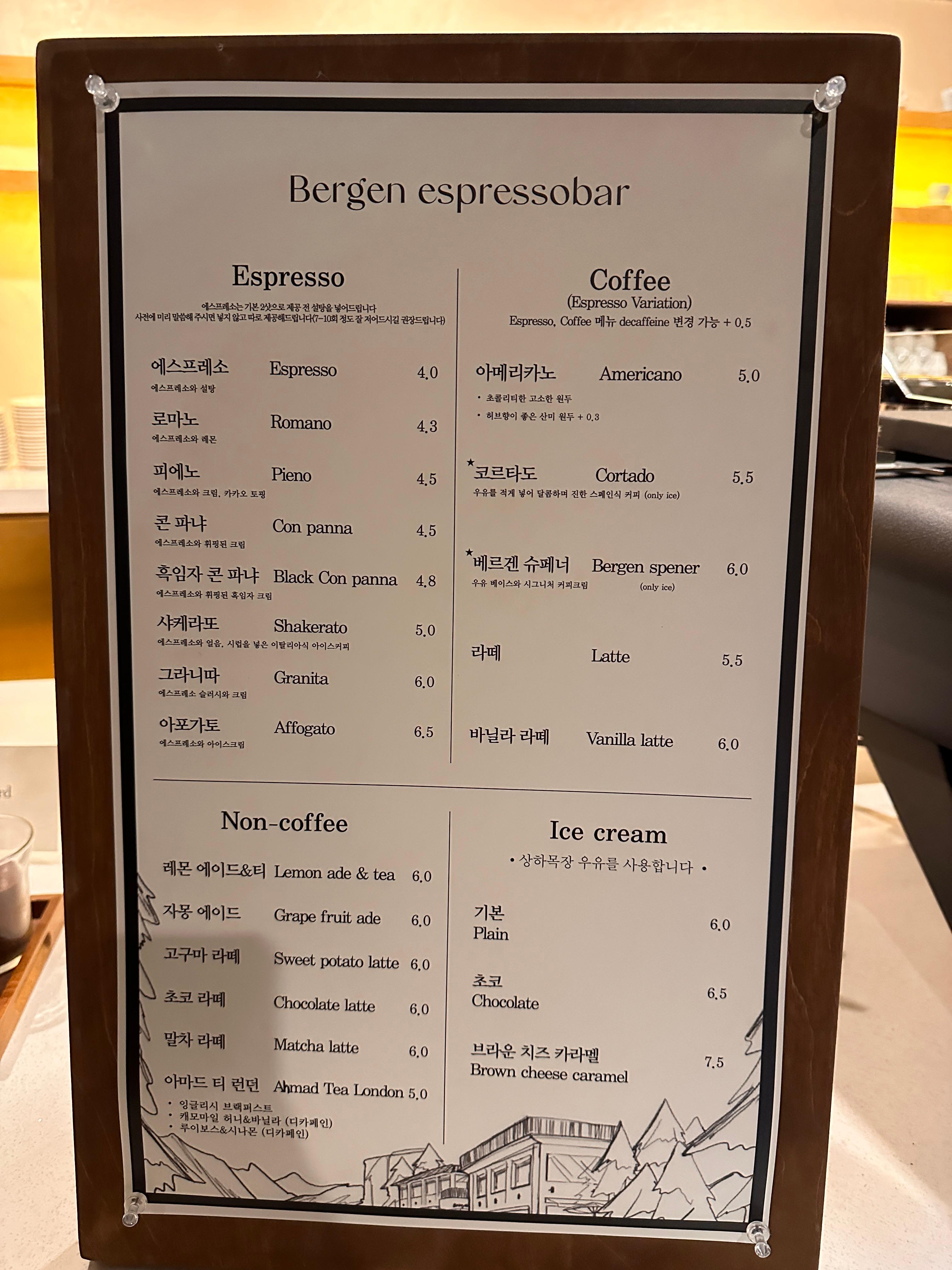 메뉴판을 살펴보니 다양한 커피 음료와 함께 디저트, 그리고 몇 가지 논카페인 음료도 마련되어 있었습니다. 에스프레소바라는 이름답게 에스프레소 기반 메뉴들이 잘 준비되어 있었고, 라떼나 모카 등 우리가 흔히 아는 기본 메뉴에 충실하면서도, 계절마다 바뀌는 스페셜 음료가 있다고 해요. 저는 늦은 밤이라 카페인이 강한 음료는 조금 부담스러웠지만, 여기까지 온 김에 시그니처 메뉴로 보이는 베르겐 슈페너를 시도해 보기로 했습니다.