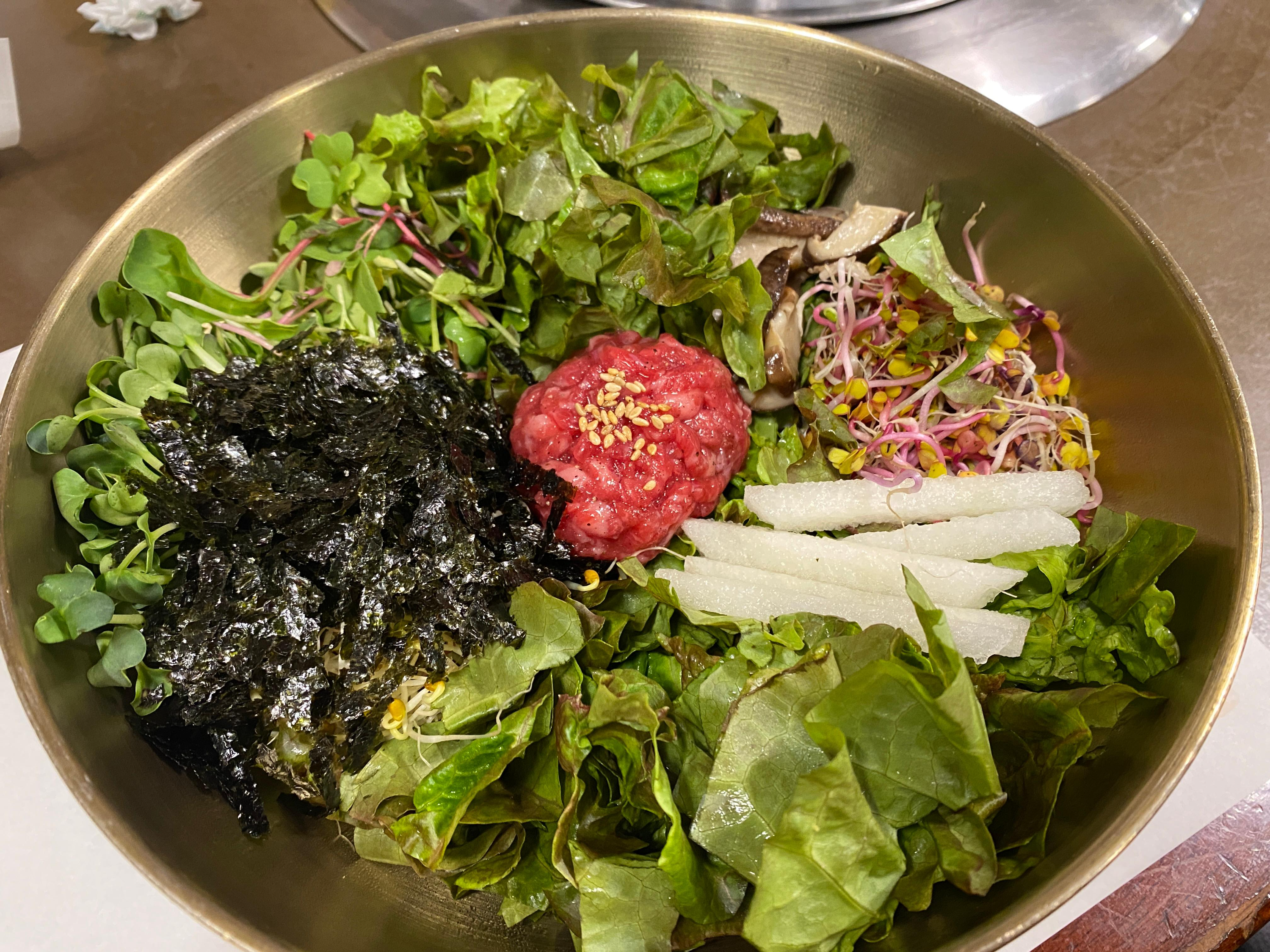이번 방문의 핵심, 바로 육회비빔밥 후기입니다. 먼저, 기본 상차림으로 나오는 반찬이 깔리는 동안 살짝 설레더군요. 직원분이 “육회는 주문 즉시 바로 준비하기 때문에 조금만 기다려 달라”고 친절히 안내해주셔서, 신선함을 기대하게 되었습니다.