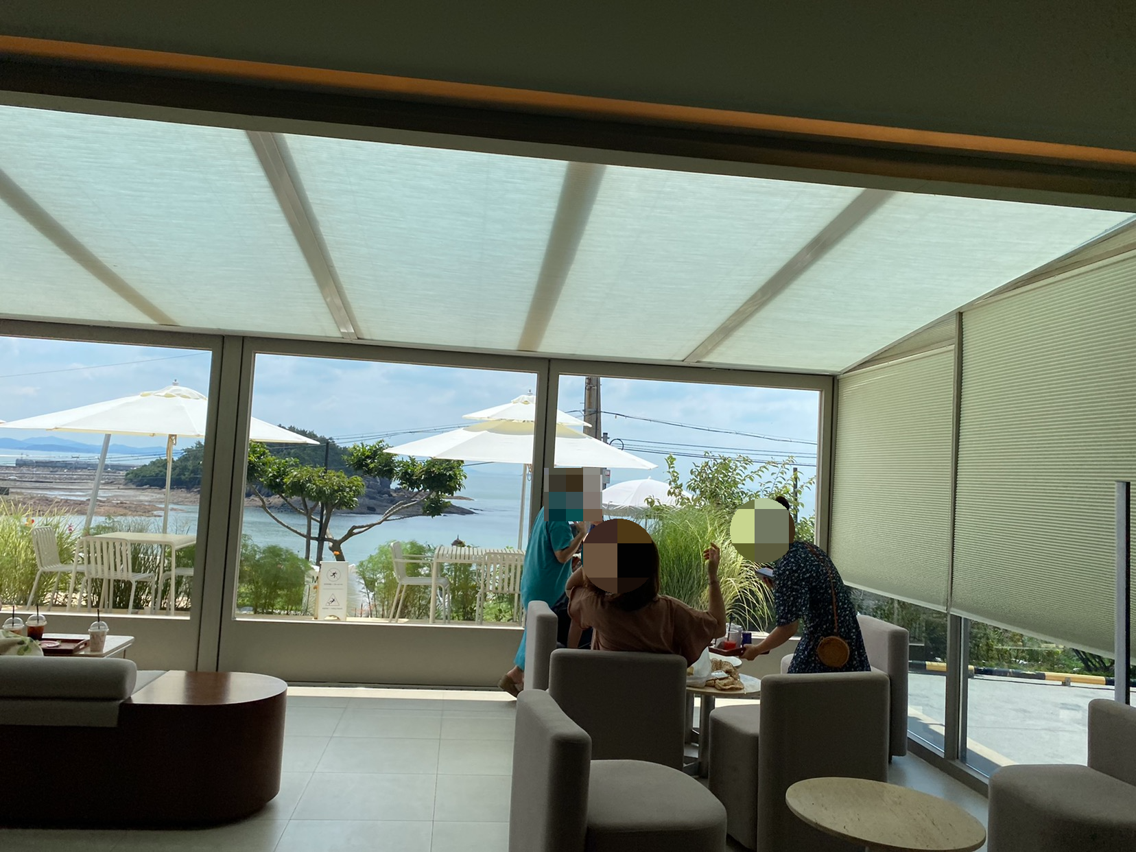 창문을 통해 들어오는 햇살과 바다 풍경이 어우러지니, 커피 한 잔으로 모든 스트레스가 씻겨 나가는 기분이 들었습니다. 사실 날이 조금 더워서 바깥 경치 구경도 길게 하진 못했지만, 실내에서 바다를 감상하니 오히려 편안했어요. “부안 오션뷰 카페(5)”를 표방하는 이곳에서 오션뷰라는 건 단순히 컨셉이 아니라, 실제로 파도와 하늘이 만드는 푸른빛이 예술처럼 펼쳐지는 게 굉장히 매력적이었습니다.