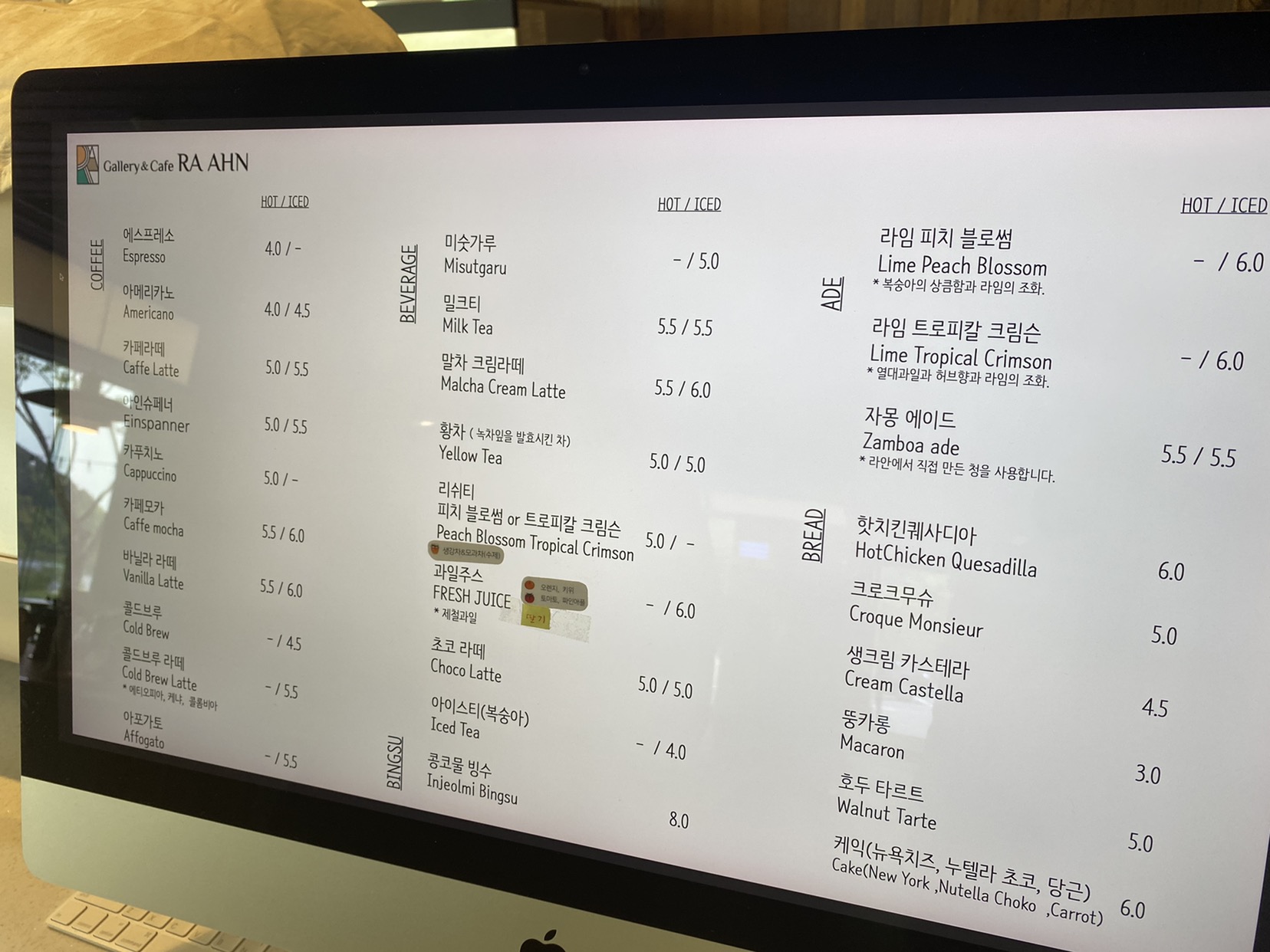 카페 이름에서 ‘갤러리’라는 단어가 붙은 만큼, 커피 외에도 예술 작품이나 소품을 구경할 수 있는 공간이라는 인상을 받았습니다. 메뉴판을 살펴보니, 아메리카노·라떼·카푸치노 등 기본 커피 메뉴부터 각종 차(허브티·과일티 등)도 준비돼 있었습니다. 디저트류는 케이크, 쿠키 정도 보였는데, 당일 상황에 따라 달라질 수도 있겠더군요.