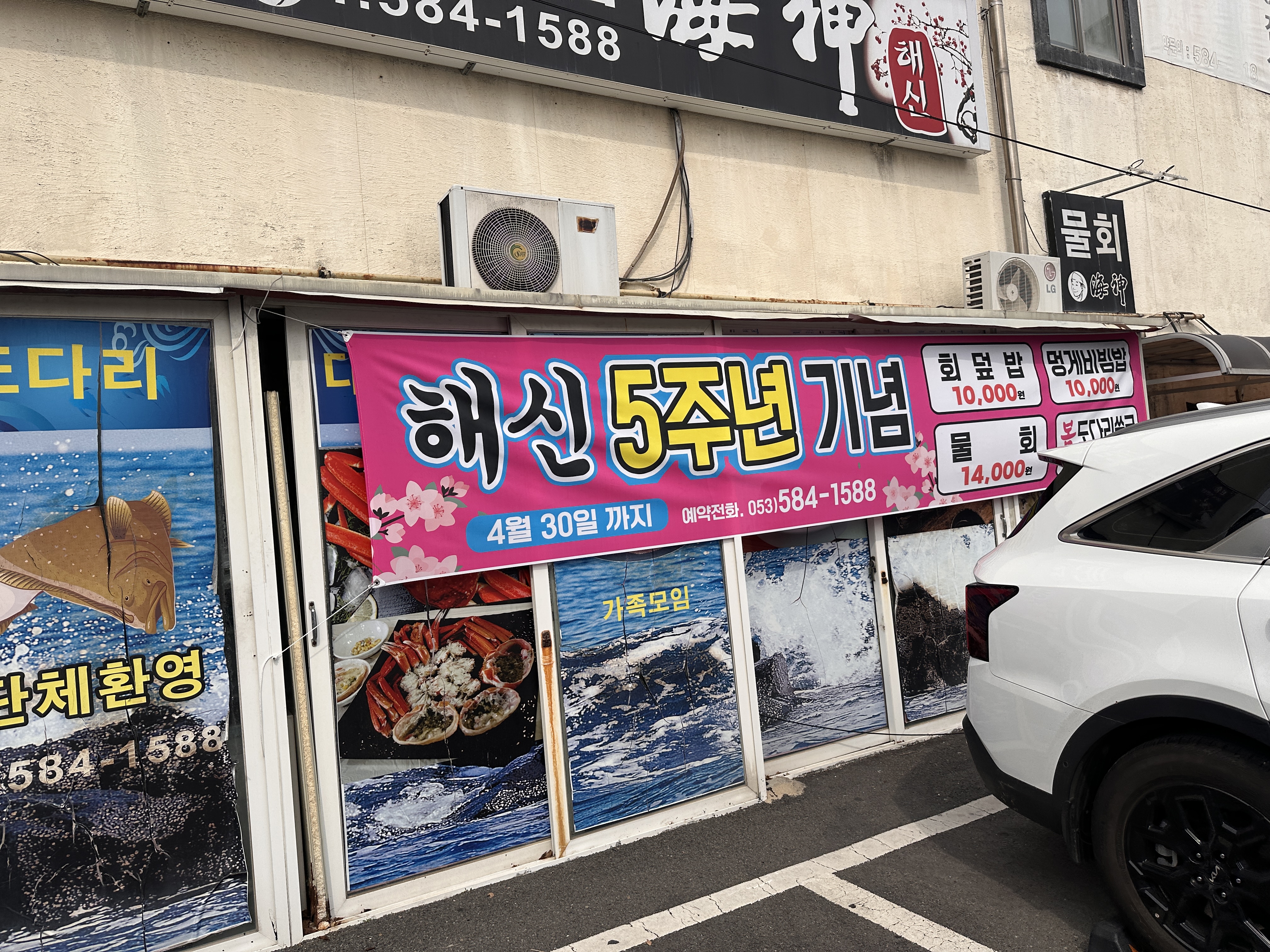해신은 모다아울렛에서 차로 5분 남짓 거리에 위치해 있습니다. 내비게이션에 ‘해신 대구 성서’ 정도만 입력해도 안내를 쉽게 받아갈 수 있고, 건물 앞이나 주변에 주차 공간이 제법 있어, 주말 점심시간에도 크게 어려움 없이 세울 수 있었어요. 다만, 식사 피크 시간(12~1시, 6~7시)엔 차가 많아 조금 일찍 도착하는 걸 권장합니다.