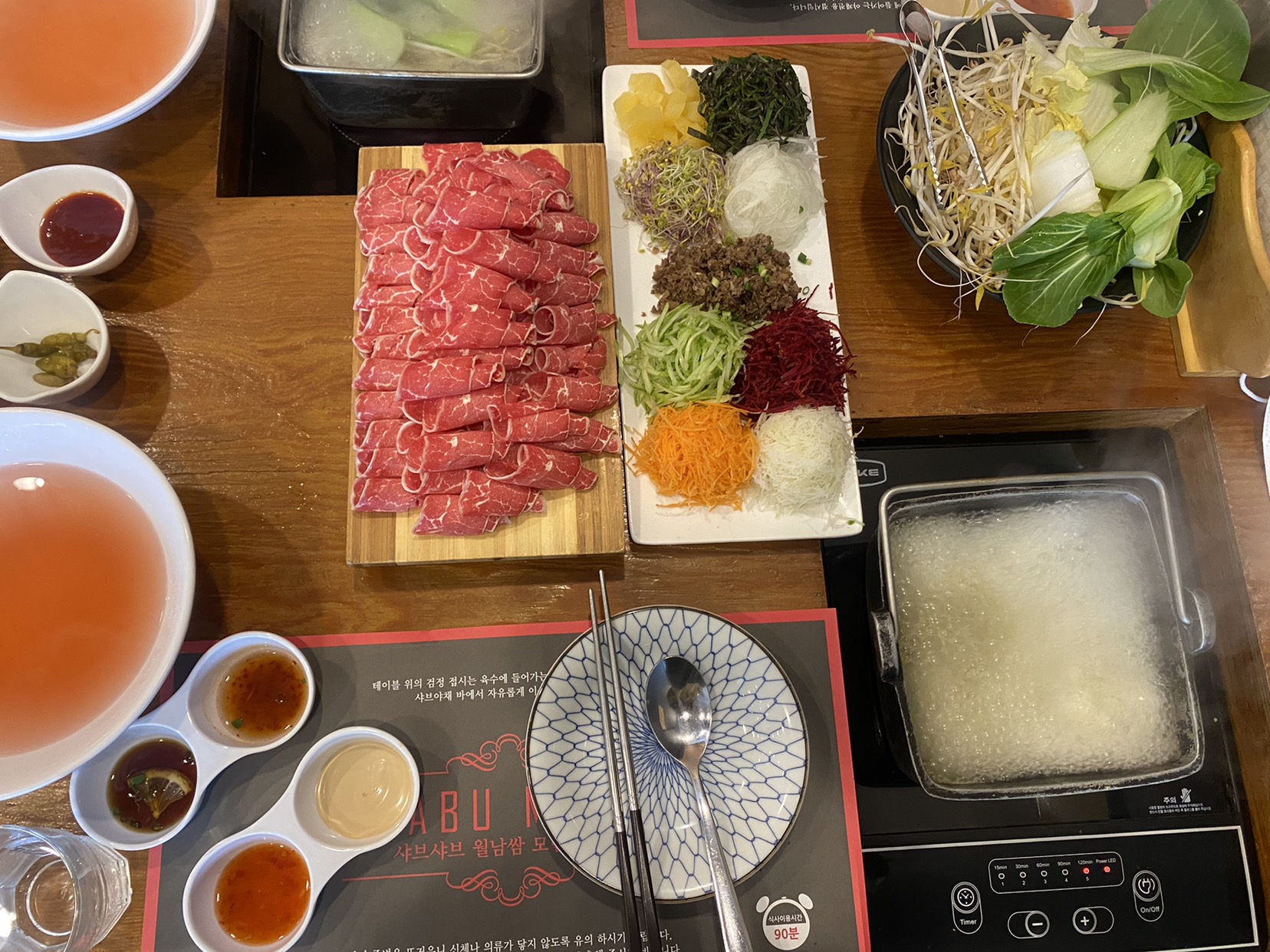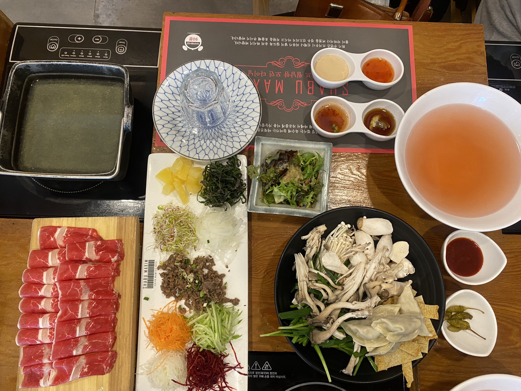 곧이어 샤브샤브 냄비가 불판 위에 세팅되고, 맑은 육수를 부어 끓이기 시작했는데, 직원분이 '어떤 소스나 맛 조절을 원하는지' 가볍게 물어보시더군요. 저는 베이식한 '맑은 육수'가 좋다고 답했고, 필요하다면 중간에 칼칼한 양념을 약간 추가할 수도 있다고 안내를 받았습니다. 우선 기본 육수를 맛봐야지 싶어 그대로 진행했습니다.