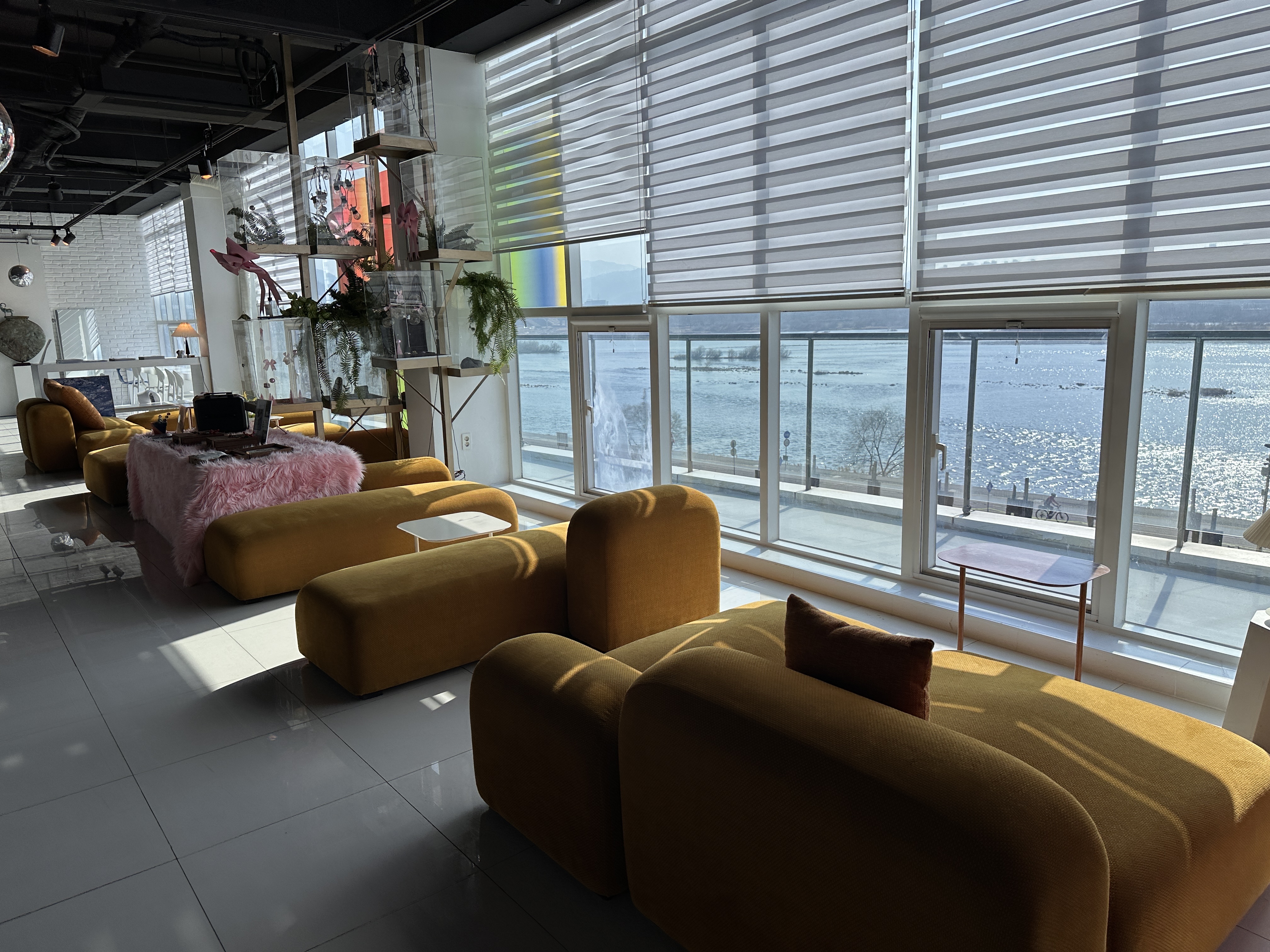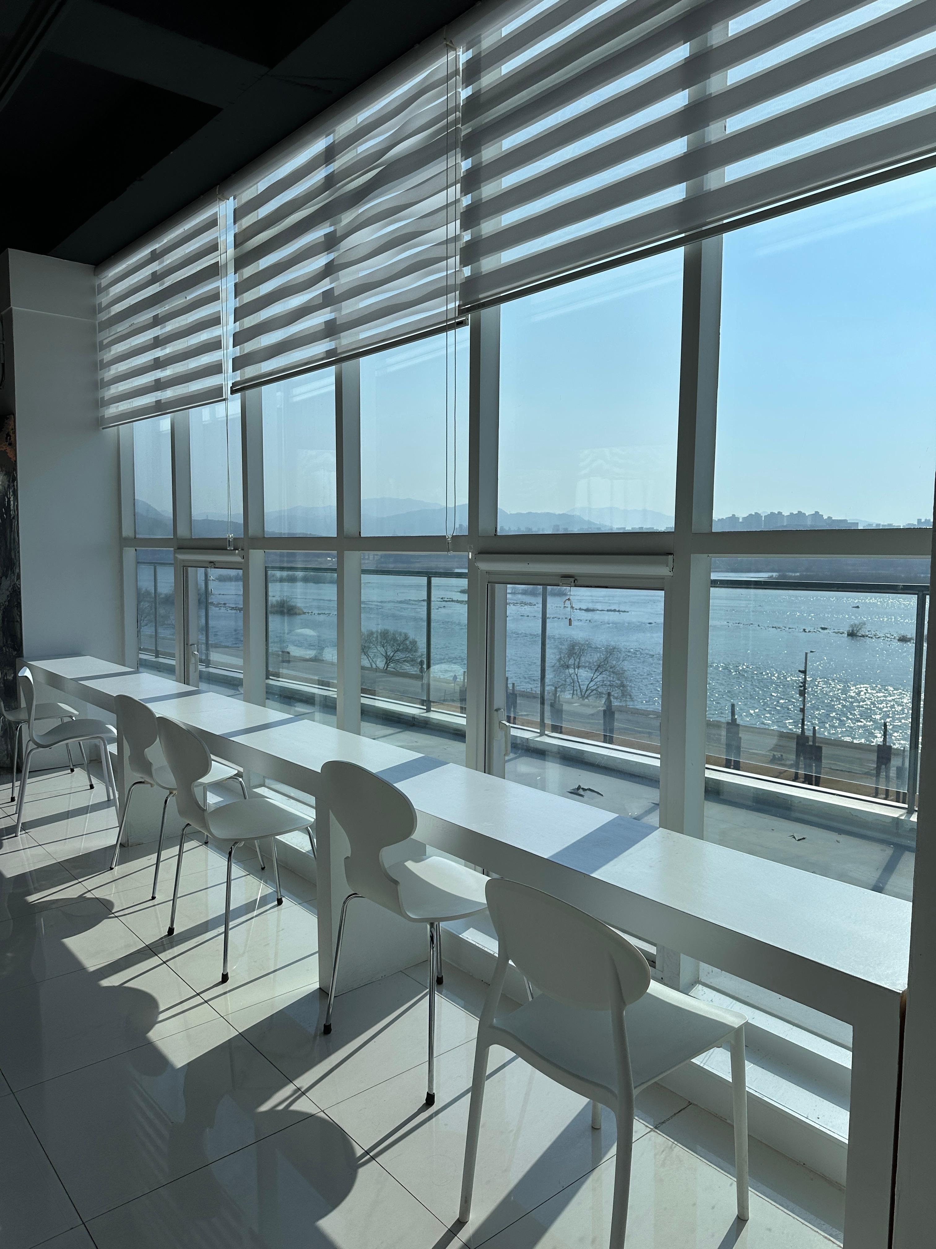 카페 내부가 넓은 편이라 테이블 간격도 여유가 있었고, 대형 창문으로 들어오는 햇살 덕분에 분위기가 더욱 밝게 느껴졌습니다. 어디에 앉아도 기본적으로 한강의 유유자적한 풍경이 보이긴 했지만, 창가 자리가 가장 인기가 많으니 참고하세요. 특히 사진이나 영상을 찍고 싶으신 분들은 창가 쪽이 훨씬 예쁜 장면을 연출해 줍니다.