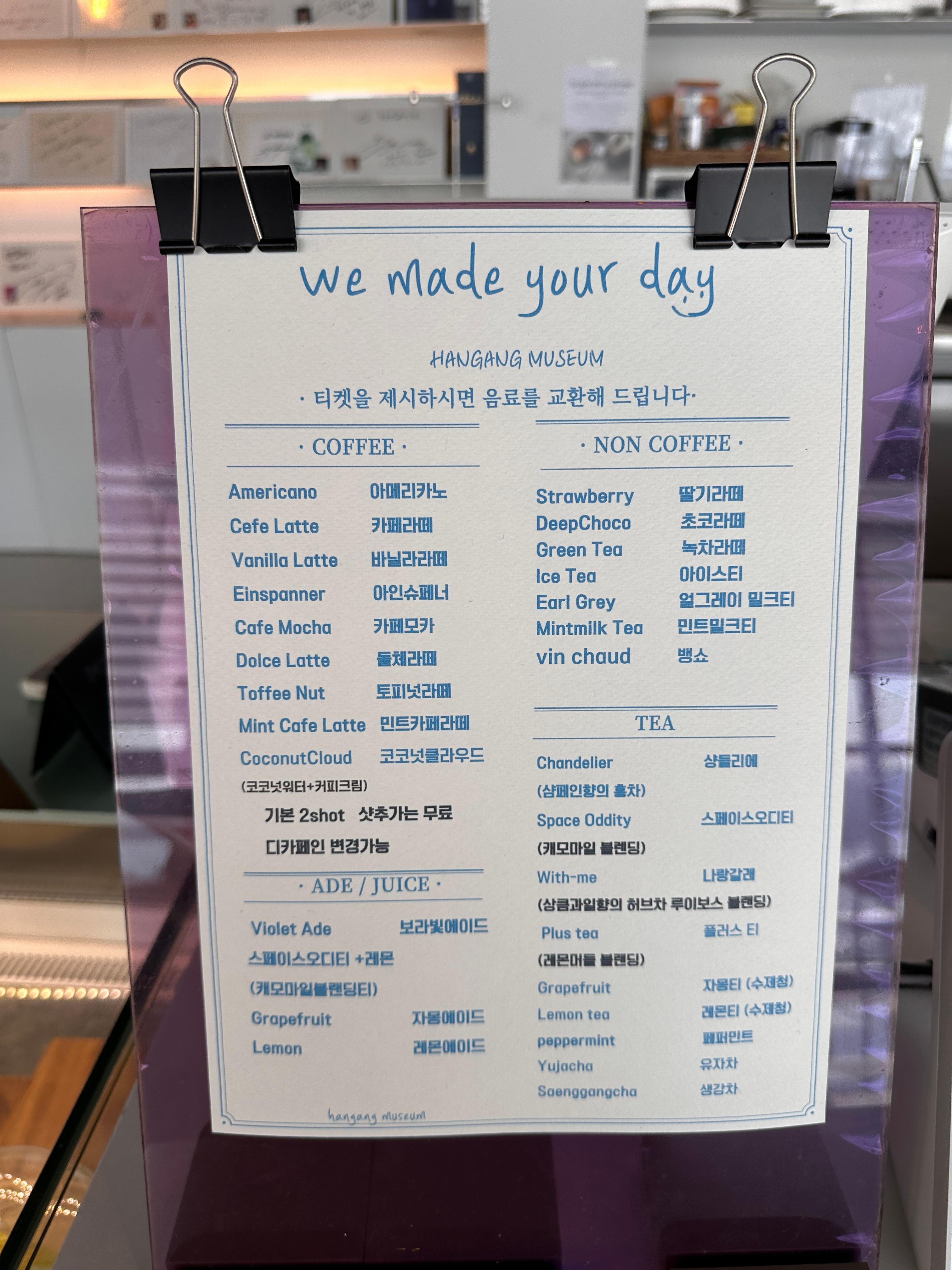 한강뮤지엄 내부에 위치한 카페로 이동하니, 마치 또 다른 예술 공간을 보는 듯한 분위기가 물씬 풍겼습니다. 전체적으로 화이트 톤과 우드 인테리어가 조화롭게 어우러져, 밝고 세련된 느낌이었어요. 자리를 고를 때 가장 신경 썼던 건 역시 한강이 잘 내려다보이는 창가 석이었는데, 운 좋게도 창가 근처가 비어 있어서 그곳에 자리 잡을 수 있었습니다.