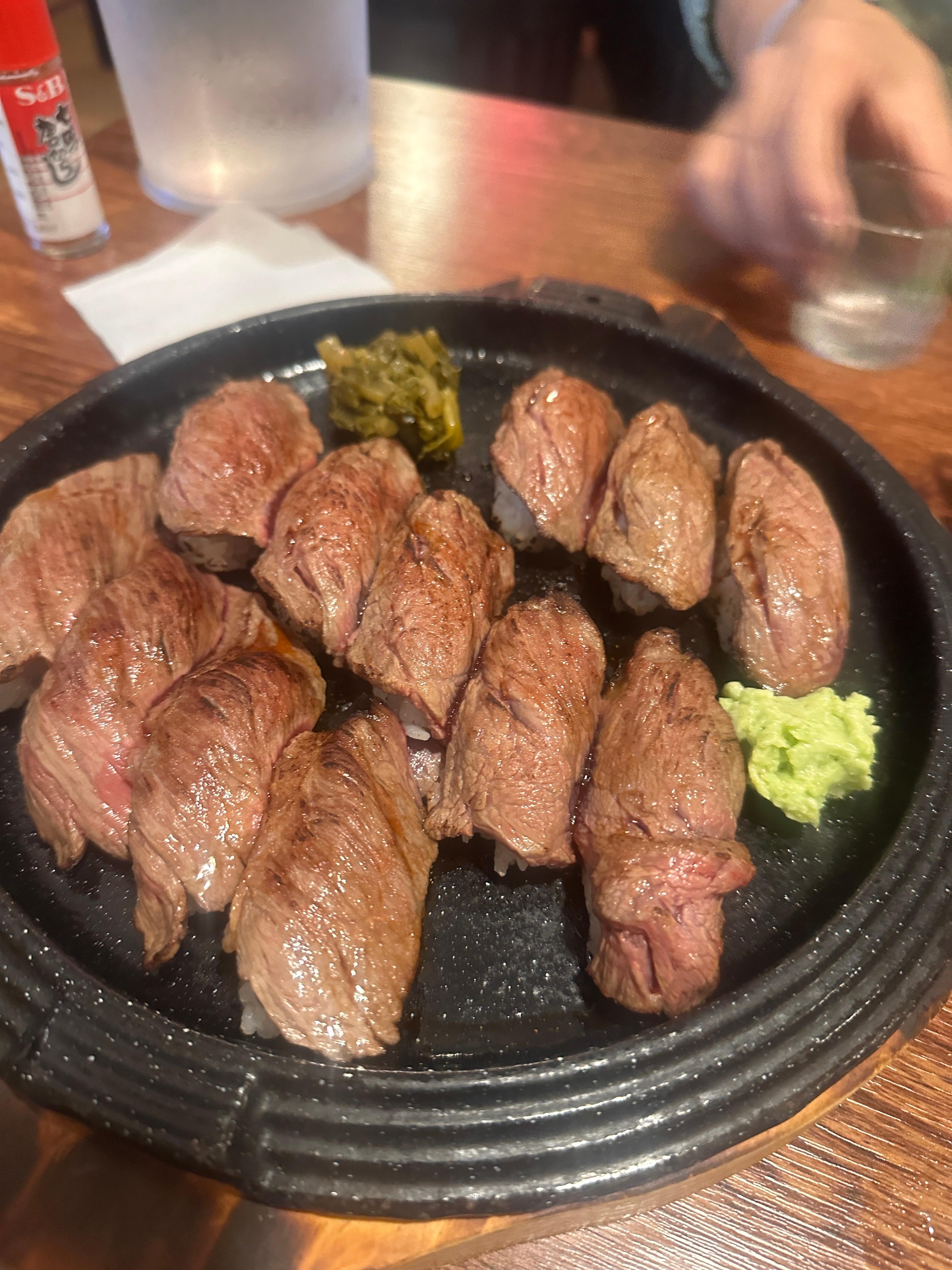 이날의 주인공은 단연 와규불초밥이었습니다. 일단 메뉴판을 펼치자마자 눈에 띄는 이름이기도 하고, 지인분들이 극찬을 아끼지 않았던 메뉴이기도 했거든요. 그래서 “처음부터 이거 안 시키면 섭섭하지!”라는 마음으로 바로 주문을 넣었죠.