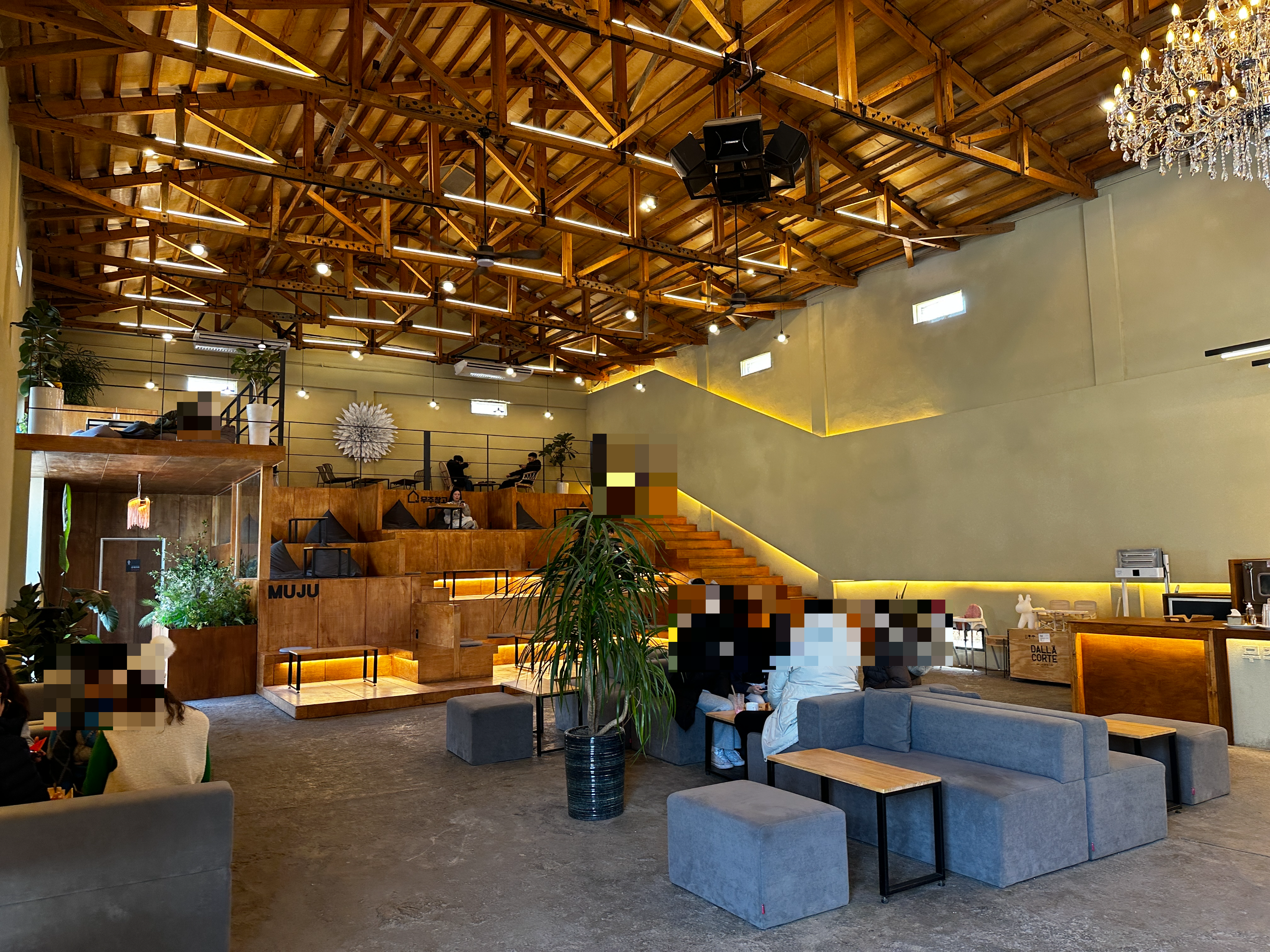 주문한 음료들이 나오길 기다리면서, 매장 내부 곳곳을 둘러봤습니다. 창고를 개조한 인테리어라 천장이 높고, 벽면에는 거친 질감이 살아 있어요. 은은한 조명이 더해져, 빈티지한 감성과 세련됨이 동시에 느껴지는 분위기가 형성됩니다. 무주 카페 중에서도 이런 톡톡 튀는 공간은 흔치 않겠다는 생각이 들더군요.
