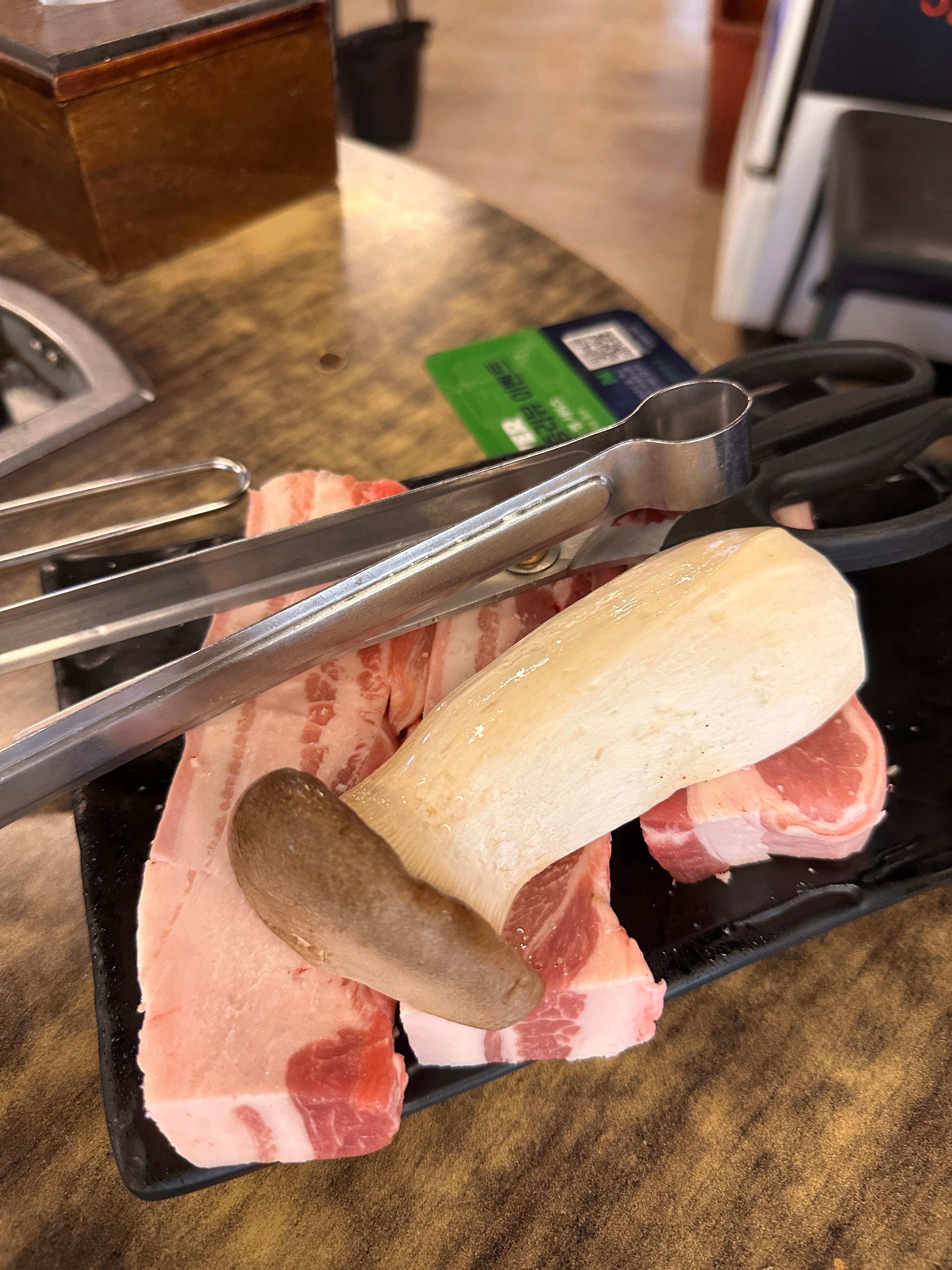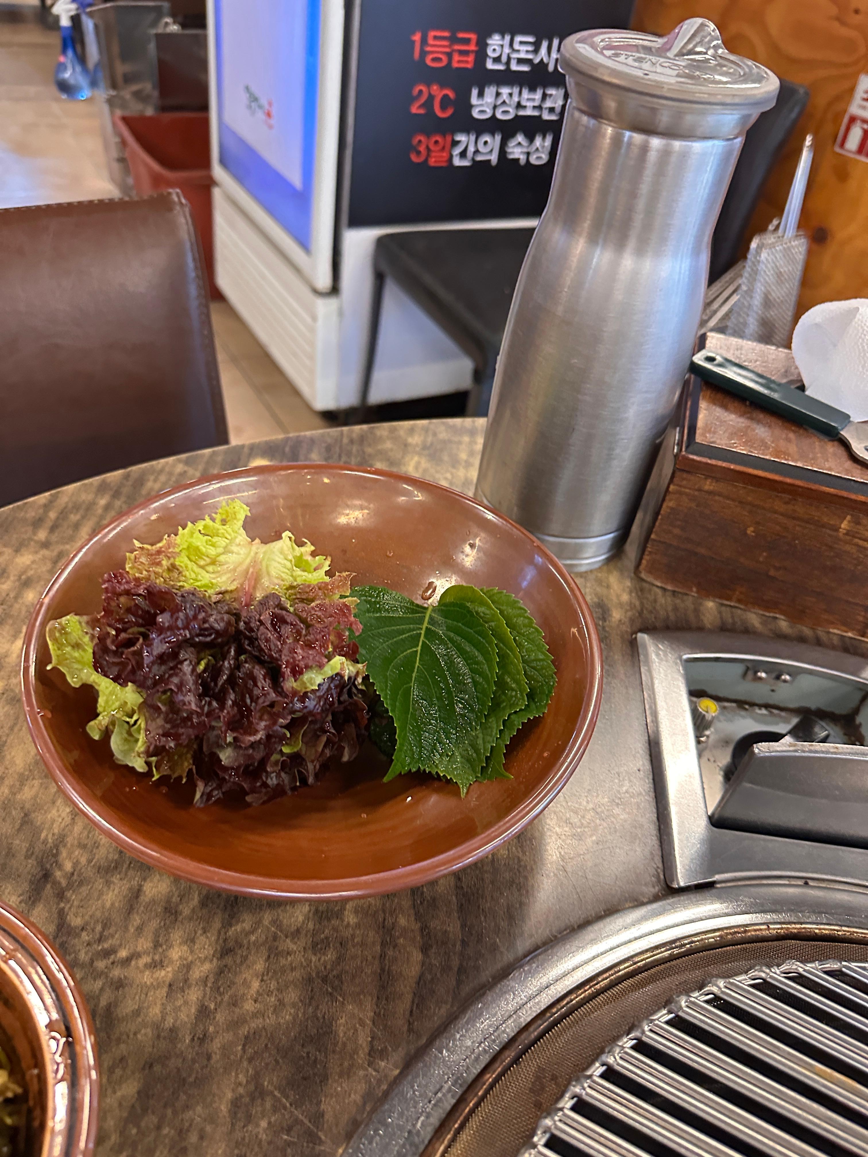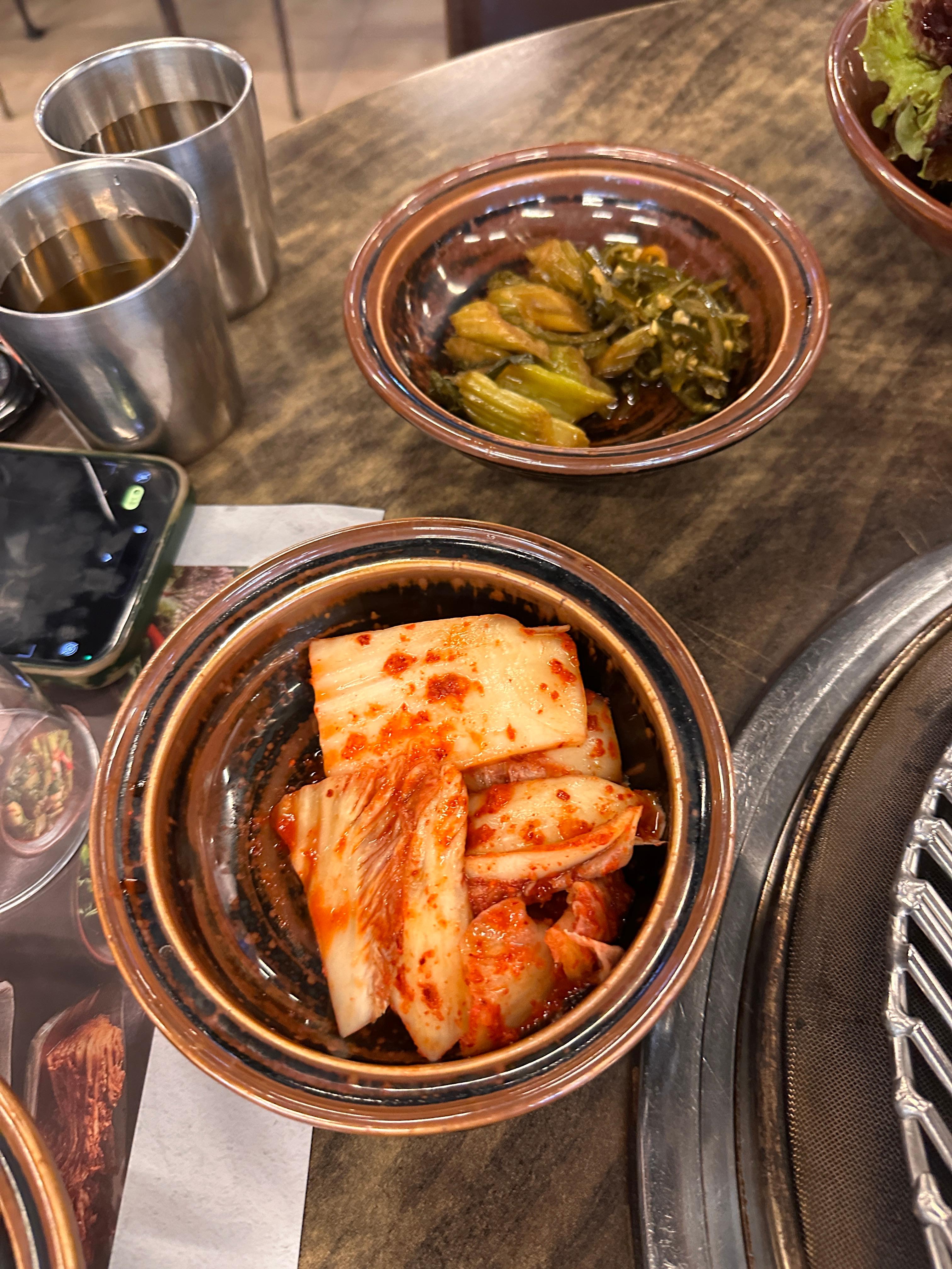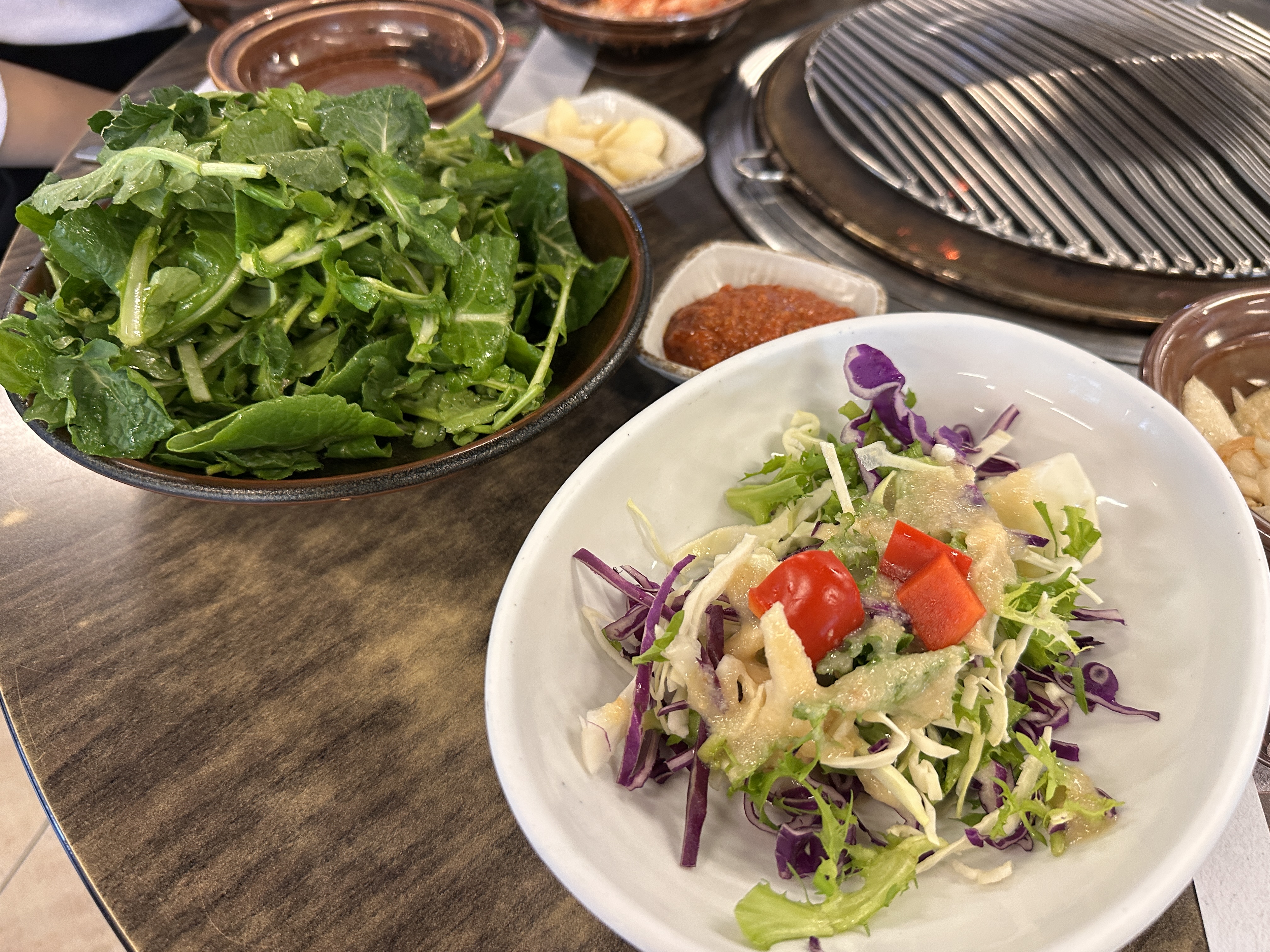 삼겹살을 쌈에 싸 먹을 때, 파절임이나 마늘, 고추, 쌈장 등 기본적인 구성은 물론이고, 열무김치도 함께 얹어 먹을 수 있다는 점이 재미있었어요. 특히 열무김치가 아주 새콤한 편은 아니라 부담 없이 고기와도 잘 어울렸습니다. 중간중간에 제공되는 미소된장국도 국물이 깔끔해서 좋았고, 필요한 반찬이 있으면 직원분이나 셀프 코너를 통해 쉽게 리필할 수 있었어요.