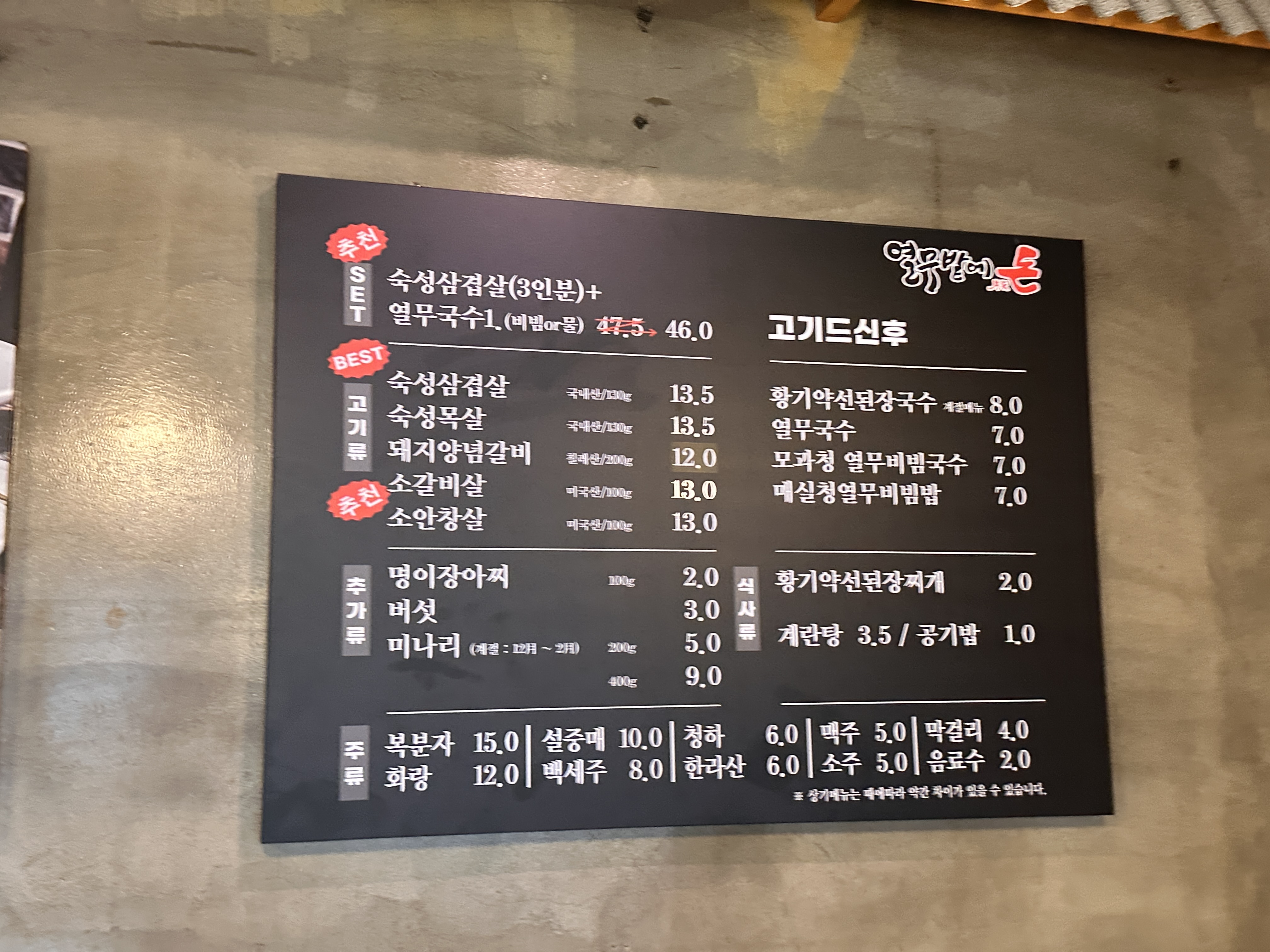 열무밭에돈에는 단품 메뉴도 다양하게 있지만, 제가 제일 눈여겨봤던 건 바로 세트메뉴였어요. 특히 숙성삼겹살과 열무국수가 함께 나오는 구성이 있다는 걸 듣고 “아, 이건 꼭 먹어봐야겠다” 싶었습니다. 평소에도 삼겹살을 먹고 나면 국수류나 찌개로 마무리를 해주는 편인데, 여기는 애초에 그런 메뉴가 한 세트로 나와 편하더라고요.