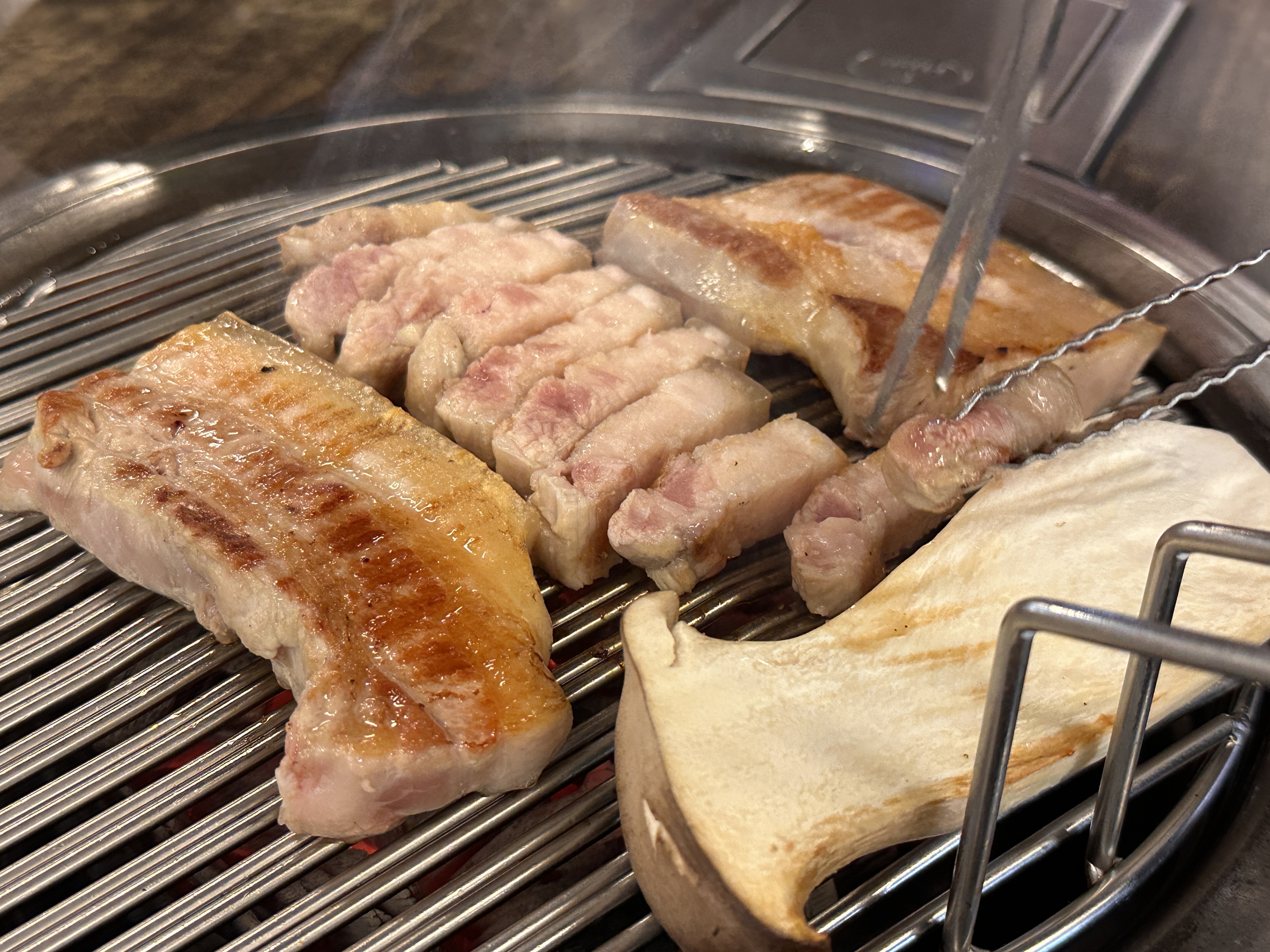 드디어 메인이 나왔습니다. 숙성삼겹살 3인분이라 그런지 양이 꽤 많았고, 두툼하게 썰린 비주얼이 침샘을 자극하더군요. 숯불 판 위에 삼겹살을 올려놓고 타닥타닥 소리가 퍼지기 시작하는 순간, 벌써부터 고소한 냄새가 식욕을 돋웠습니다.