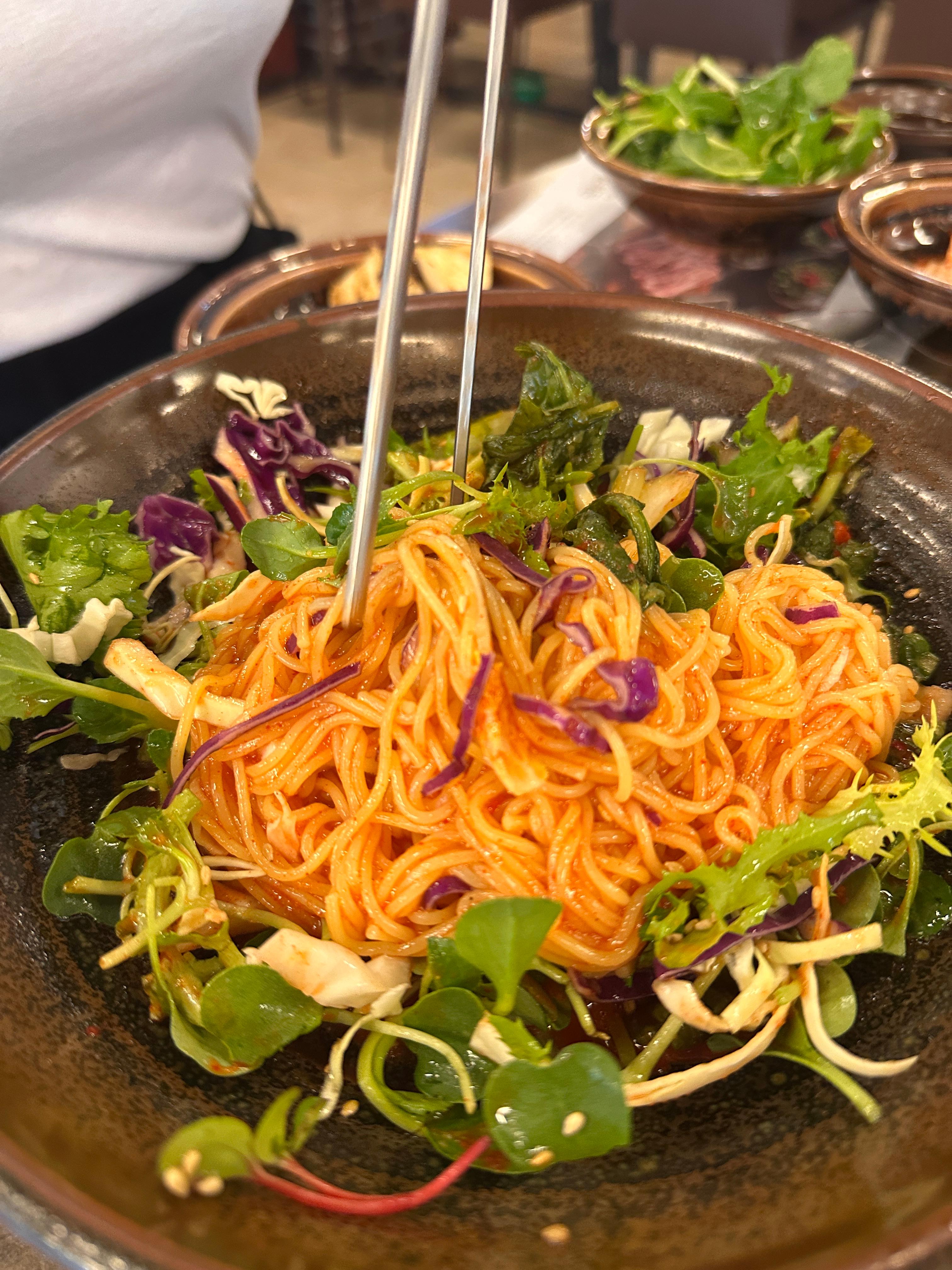 고기를 어느 정도 먹다가 살짝 느끼하다 싶을 때쯤 열무국수를 한 젓가락 들어봤어요. 새콤하면서도 시원한 국물 덕분에 입안이 깔끔하게 정리되는 기분이 들었고, 비벼진 면발도 잘 삶아져서 탱글탱글했어요. 개인적으로는 열무김치의 아삭한 식감이 국수에 잘 어울려서, 고기와 번갈아 먹으니 맛이 서로 조화를 이루더라고요. 저는 살짝 더 새콤한 걸 좋아해서 식초를 약간 추가했는데, 그 맛이 제 입맛엔 딱이었어요.