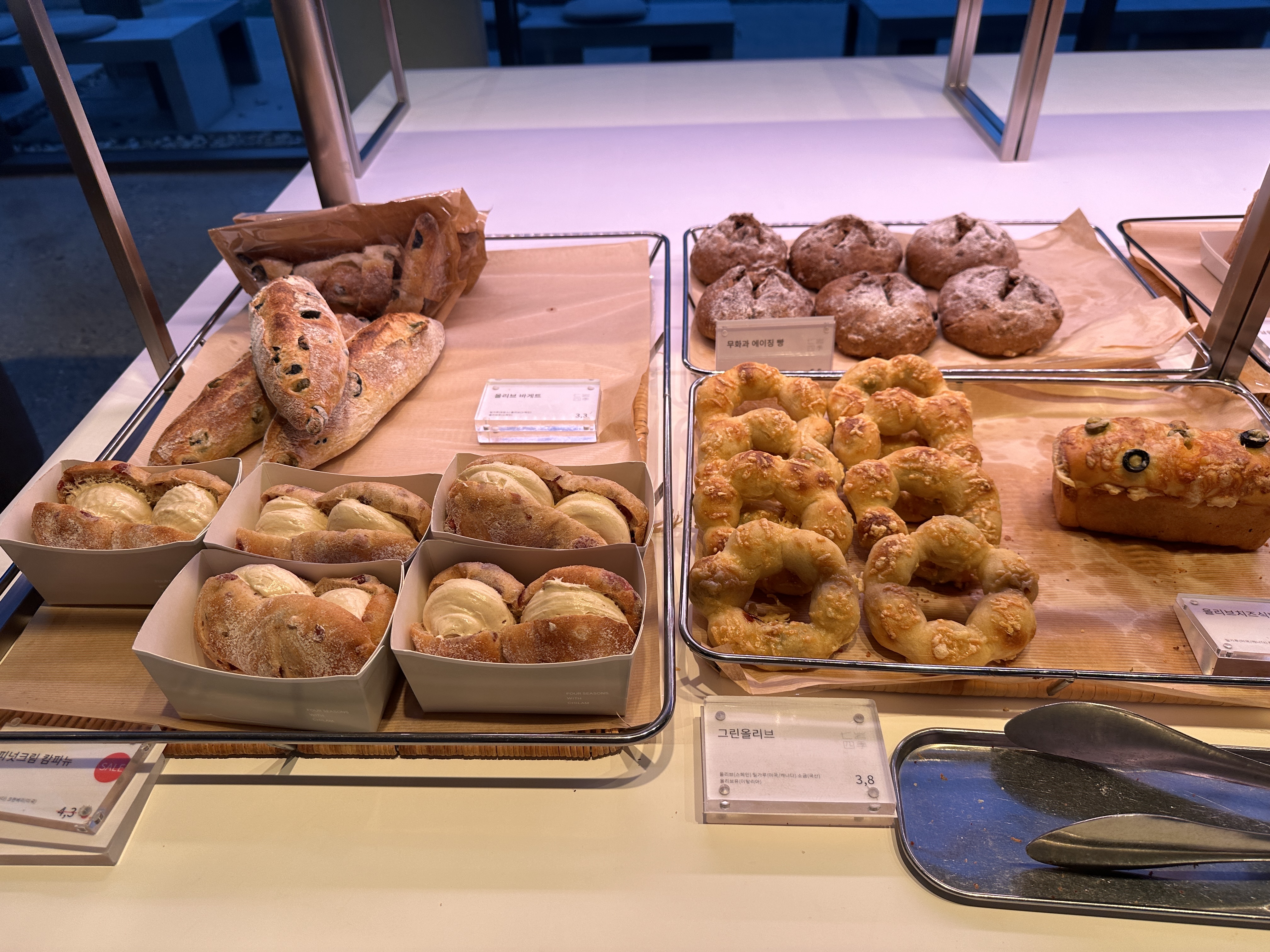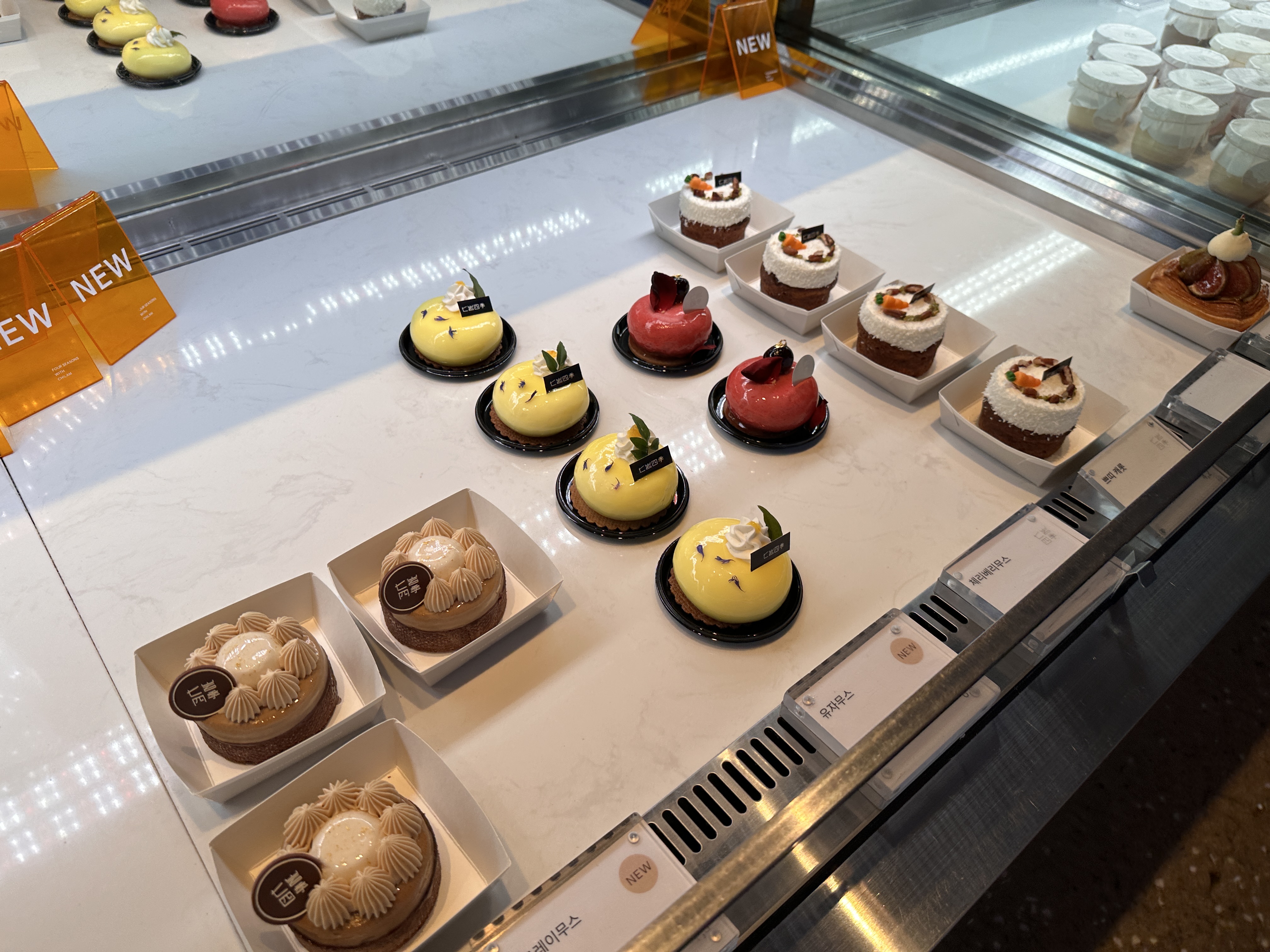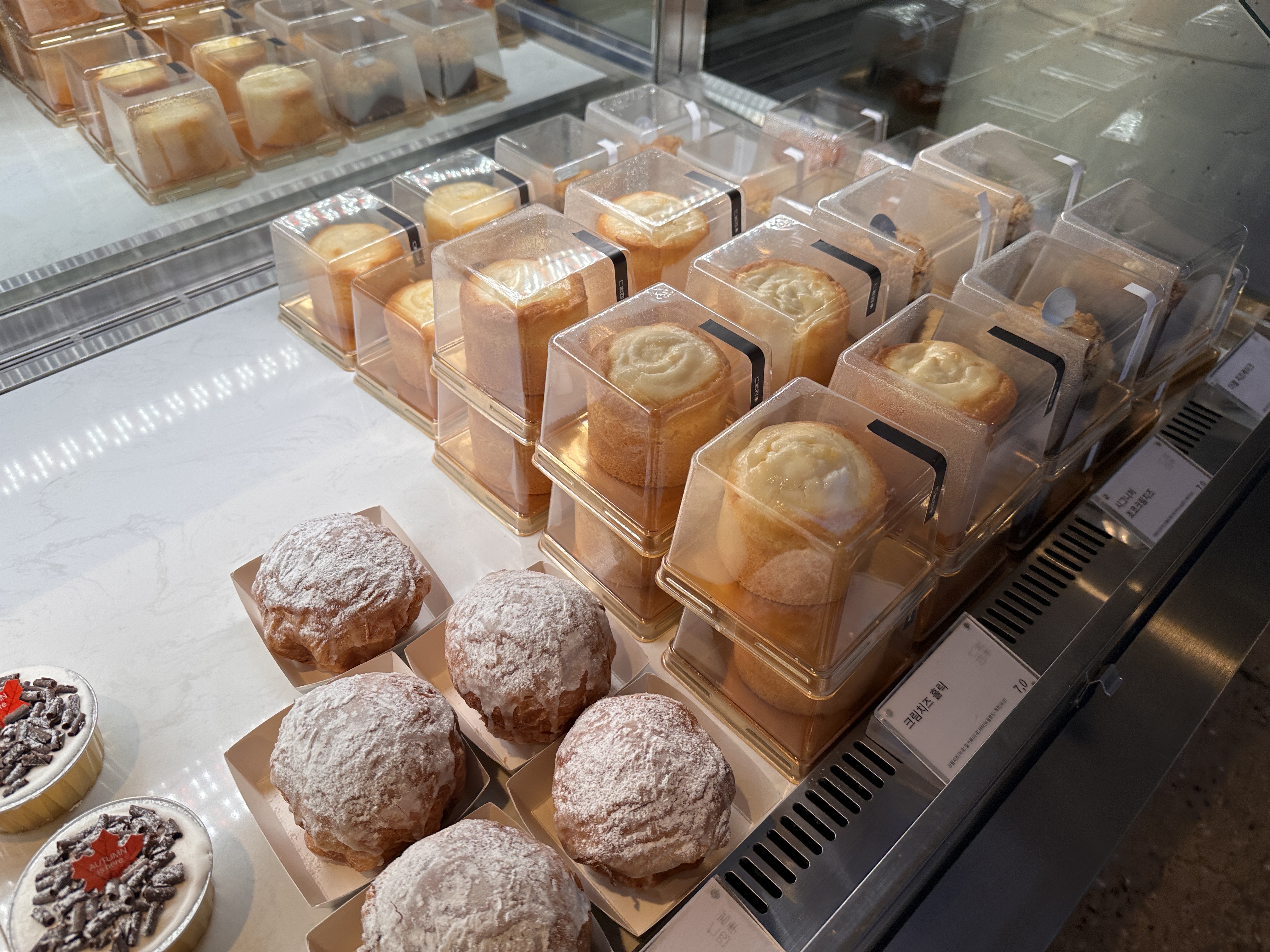 카운터 앞을 살펴보다 보니 베이커리 진열대가 빵으로 가득 차 있었습니다. 마카롱, 크루아상, 식빵, 조각 케이크까지 선택지가 너무 많아서 뭘 골라야 할지 한참 고민했어요. 결국 고소함과 달콤함이 공존하는 크루아상을 하나, 그리고 촉촉해 보이는 조각 케이크를 하나 골랐습니다.