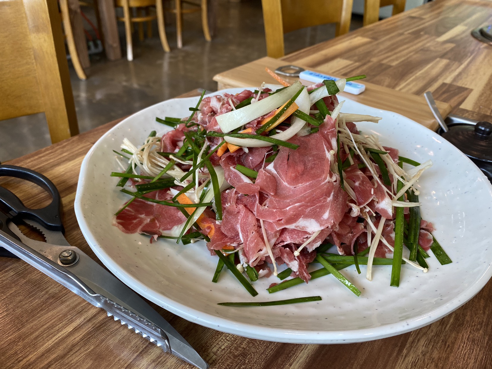 주문을 마치고 잠시 기다리니, 큼직한 불판 위에 야채와 오리고기가 푸짐하게 올려진 채로 등장했습니다. 얼핏 보면 '이걸 다 먹을 수 있을까' 싶을 정도의 양이었는데, 일행과 함께라면 전혀 문제없겠죠. 다진 마늘, 양파, 고추, 파, 양배추 등 여러 채소가 어우러진 모습이 색감부터 식욕을 돋우더군요.