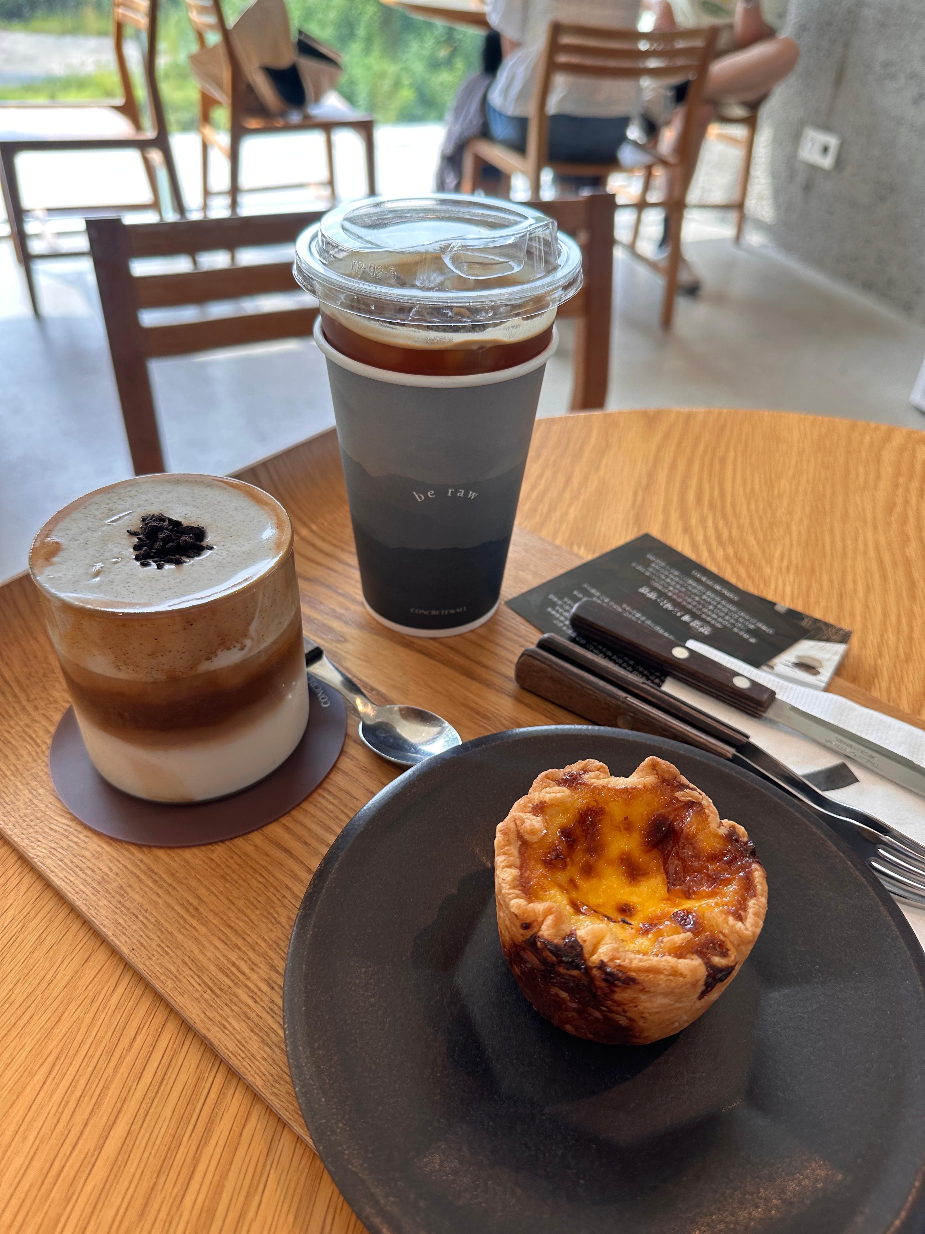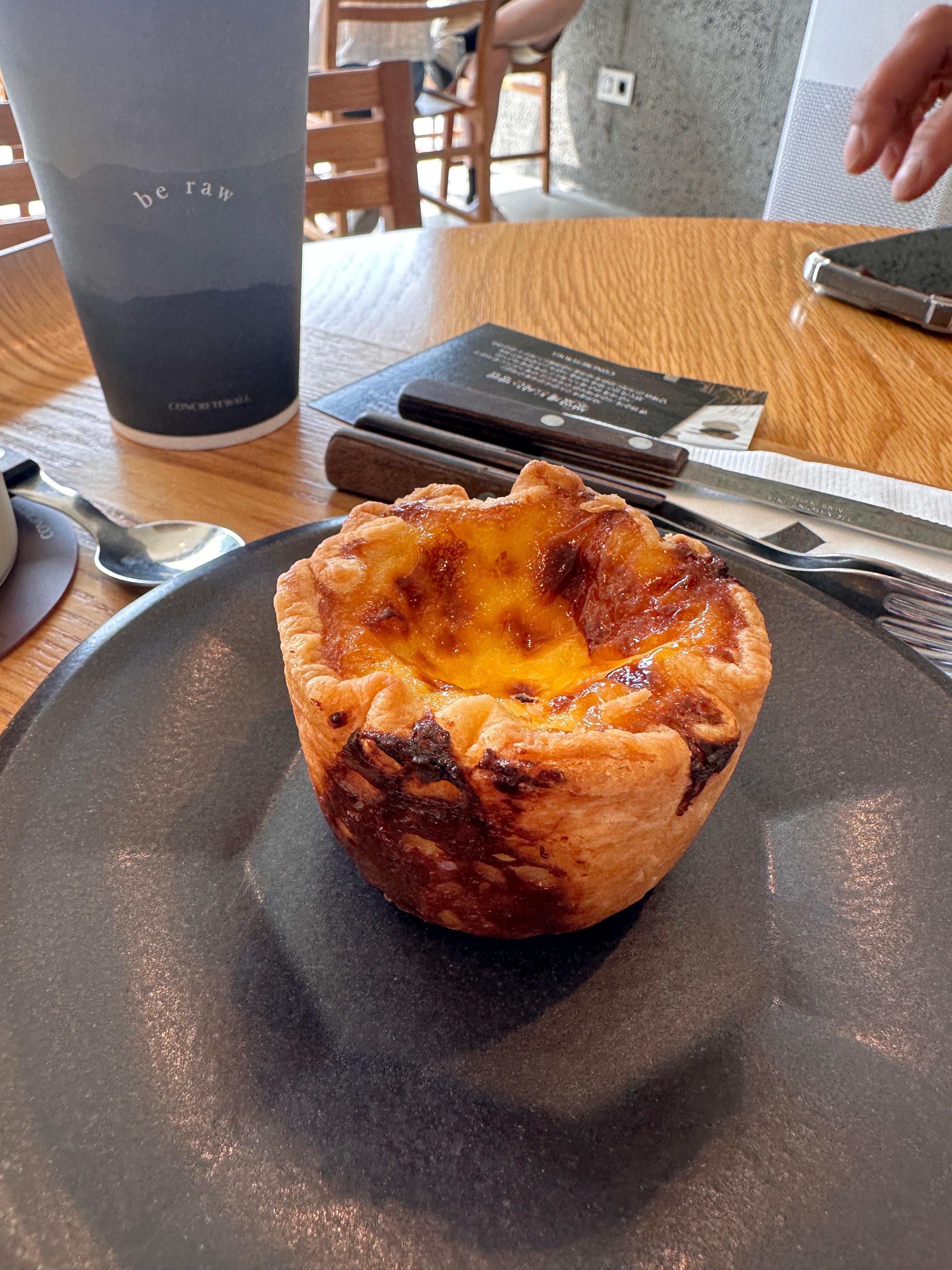 그리고 에그타르트. 사실 평소에도 달콤한 디저트를 좋아하는 편이라, 에그타르트 전문점에서 파는 그것과 얼마나 다른가가 궁금했는데요. 한 입 베어무니 바삭하고 얇은 페이스트리 층 사이로 달콤한 커스터드 크림이 촉촉하게 채워져 있어, 입안 가득 부드러운 향이 퍼졌습니다. 계란 베이스의 부드러운 필링이 부담 없이 넘어가고, 너무 달지 않아 커피와 궁합이 상당히 좋더라고요.