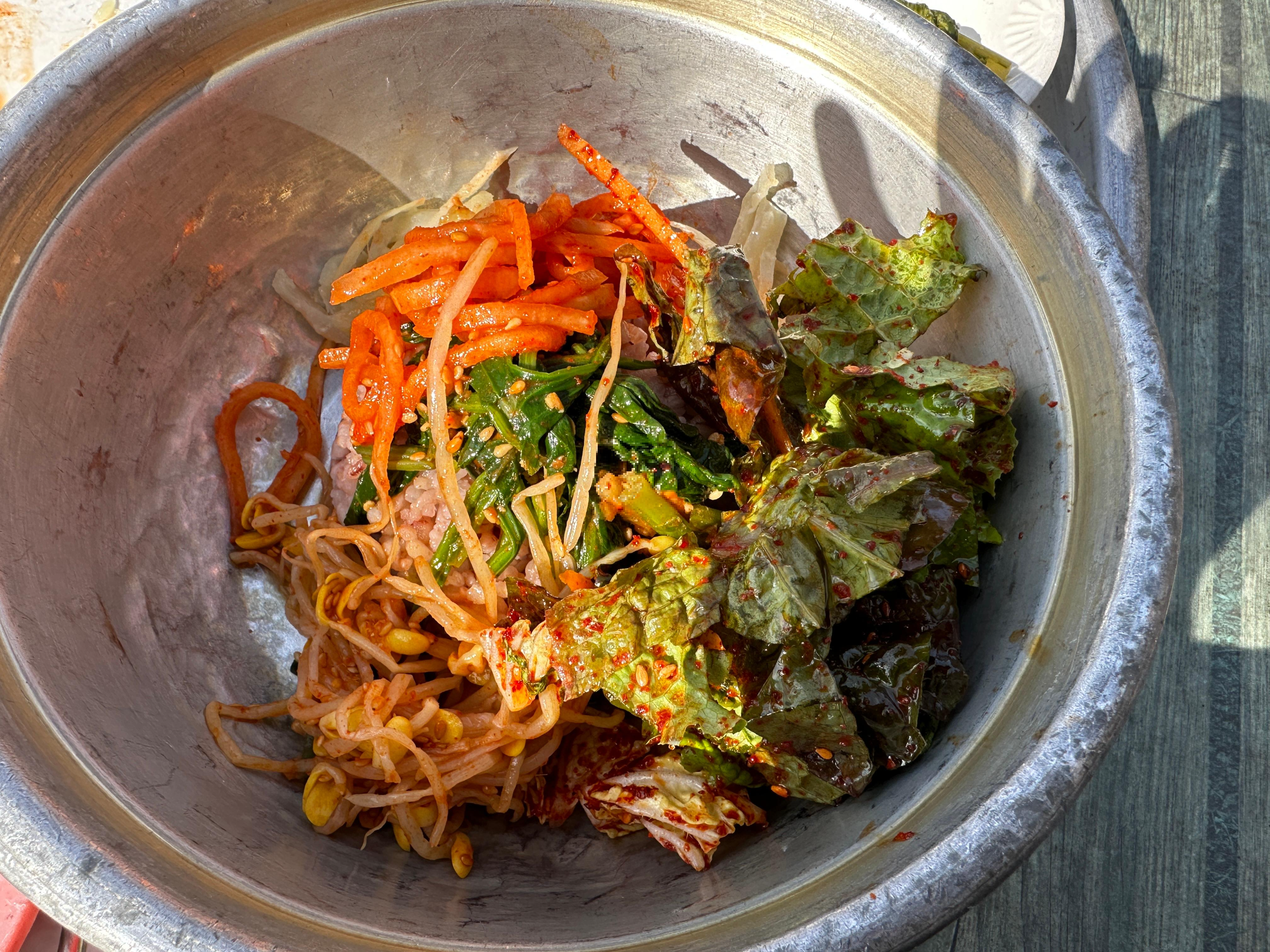 우선 밥을 숟가락으로 살살 풀어주면서, 양념장과 나물, 반찬을 적절히 섞었습니다. 이때 기름진 고추장 양념을 과하게 넣지 않아도 충분히 맛이 좋더군요. 양푼에 비벼내는 방식이라, 양념이 고르게 퍼져 한 입 베어물 때마다 밸런스가 잘 맞았습니다. 특히 풋풋한 상추나 깻잎, 열무김치까지 함께 들어가니 계속 손이 가더라고요.