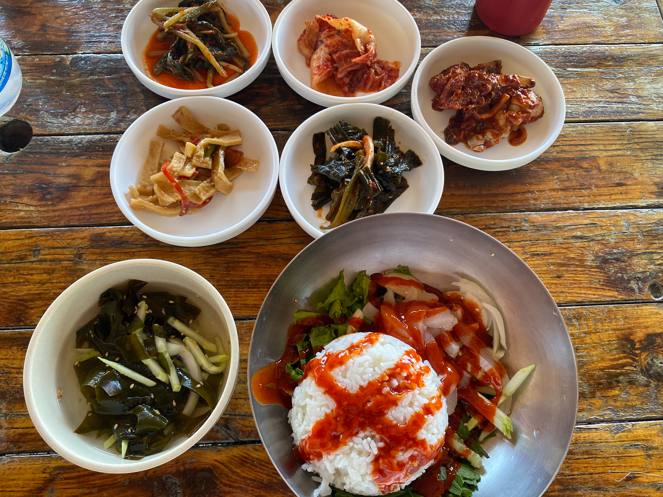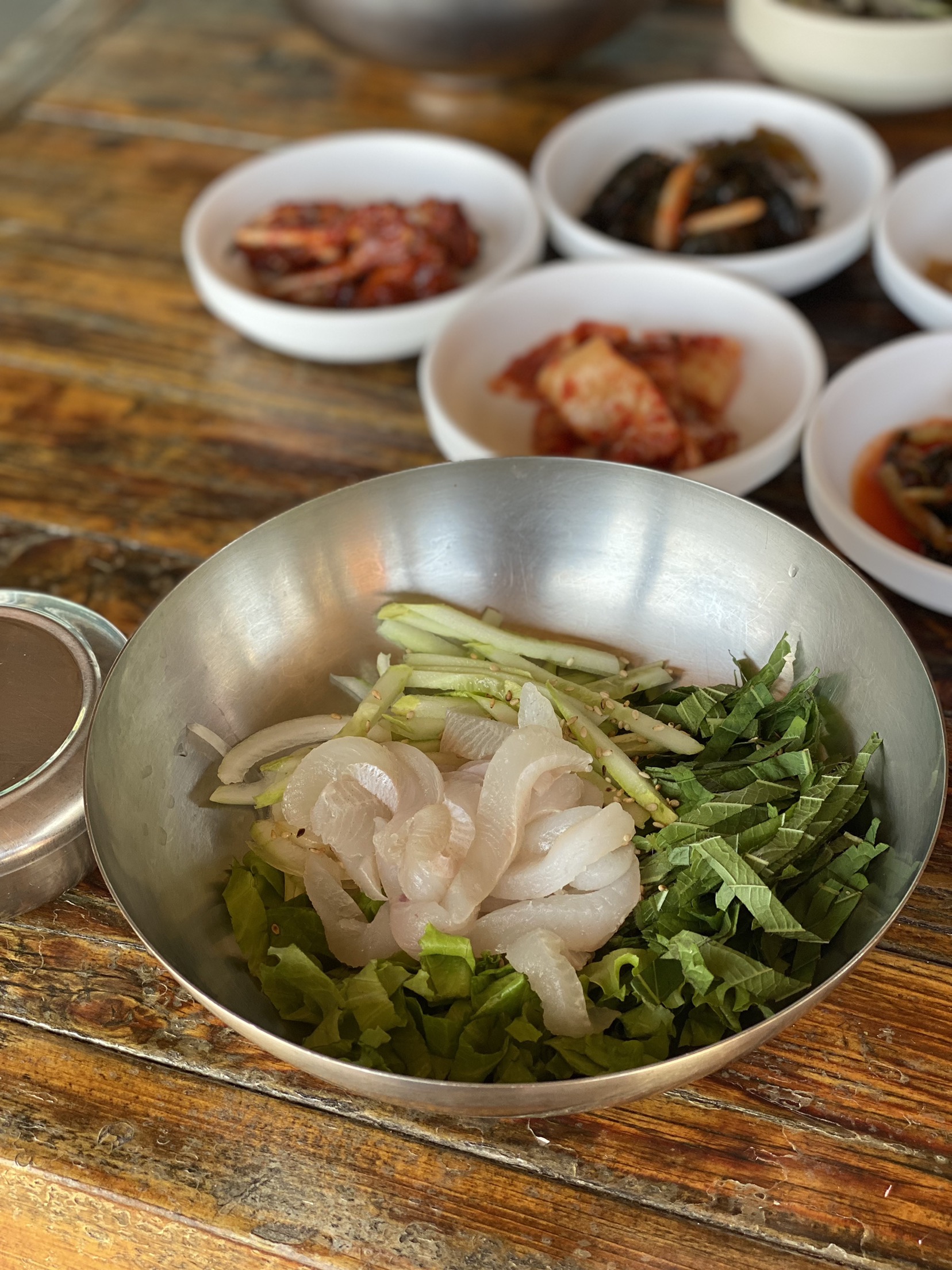 곁들여 나온 밑반찬들도 깔끔했고, 특히 겉절이나 백김치 같은 신선한 김치류가 회덮밥과 어우러져 자극적이지 않은 반찬들로 구성돼 있어 계속 입맛이 당겼습니다. 국물도 무척 시원한 멸치 육수 베이스인지, 해산물 베이스인지 맑고 담백했어요.