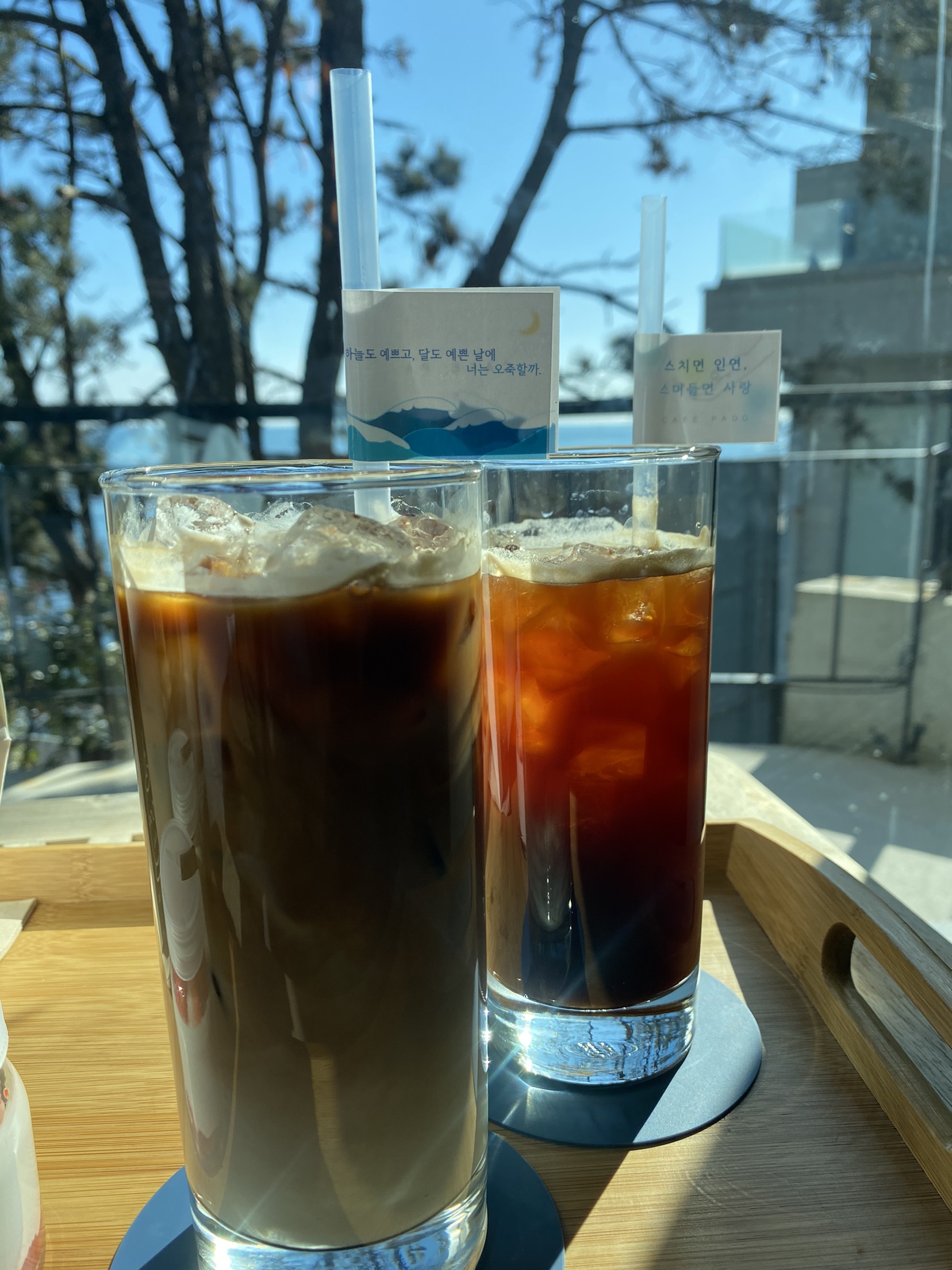 얼마 지나지 않아 받은 아이스 아메리카노는 얼음이 듬뿍 들어 있어, 비주얼부터 청량감이 넘쳤어요. 첫 모금에서 느낀 인상은 중간 정도의 로스팅으로 산미와 쌉싸름함이 균형을 이루고, 물맛이 느껴지지 않을 만큼 적당히 진한 편이었습니다. 중간중간 바다를 바라보며 호로록 마시니, 커피 본연의 향이 바닷바람과 묘하게 어울려 더 감미롭게 느껴졌달까요.