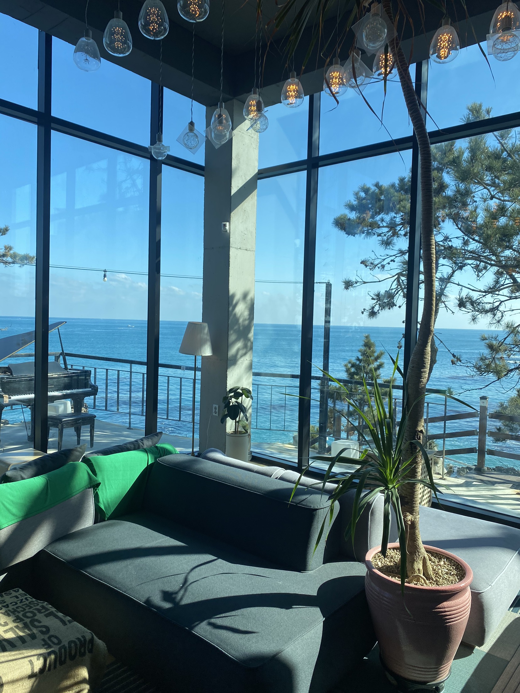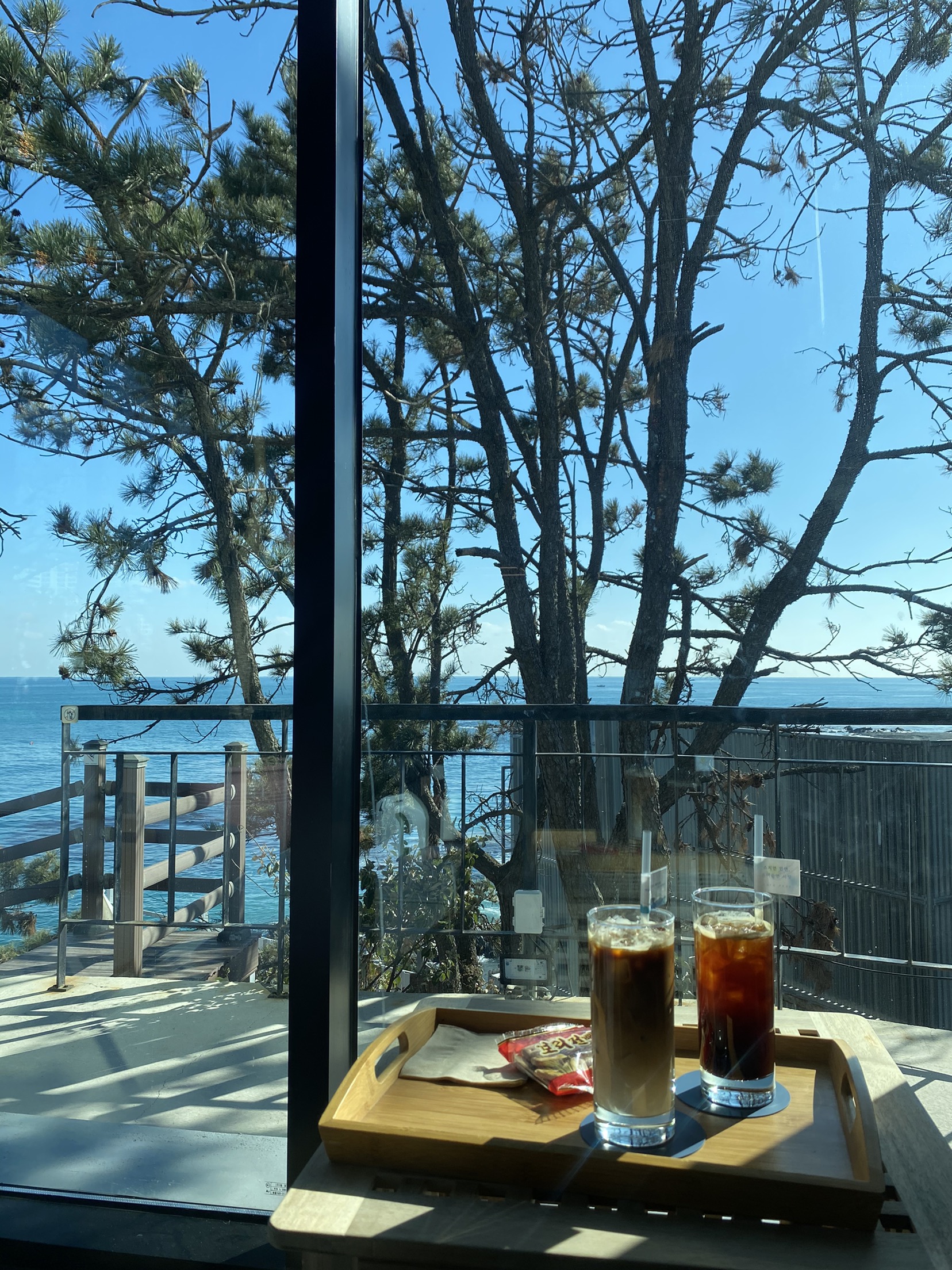 저는 약 한 시간가량 앉아서 커피를 마시며 일행과 대화를 나눴는데, 어느새 시간 가는 줄 몰랐어요. 파도 소리가 자그마하게 들려오는 가운데, 눈앞에 펼쳐진 바다가 마음의 안정과 평화를 전해준달까요. 오션뷰 카페들이 주는 심리적 효과가 이런 것이겠구나, 라는 생각이 들더군요.