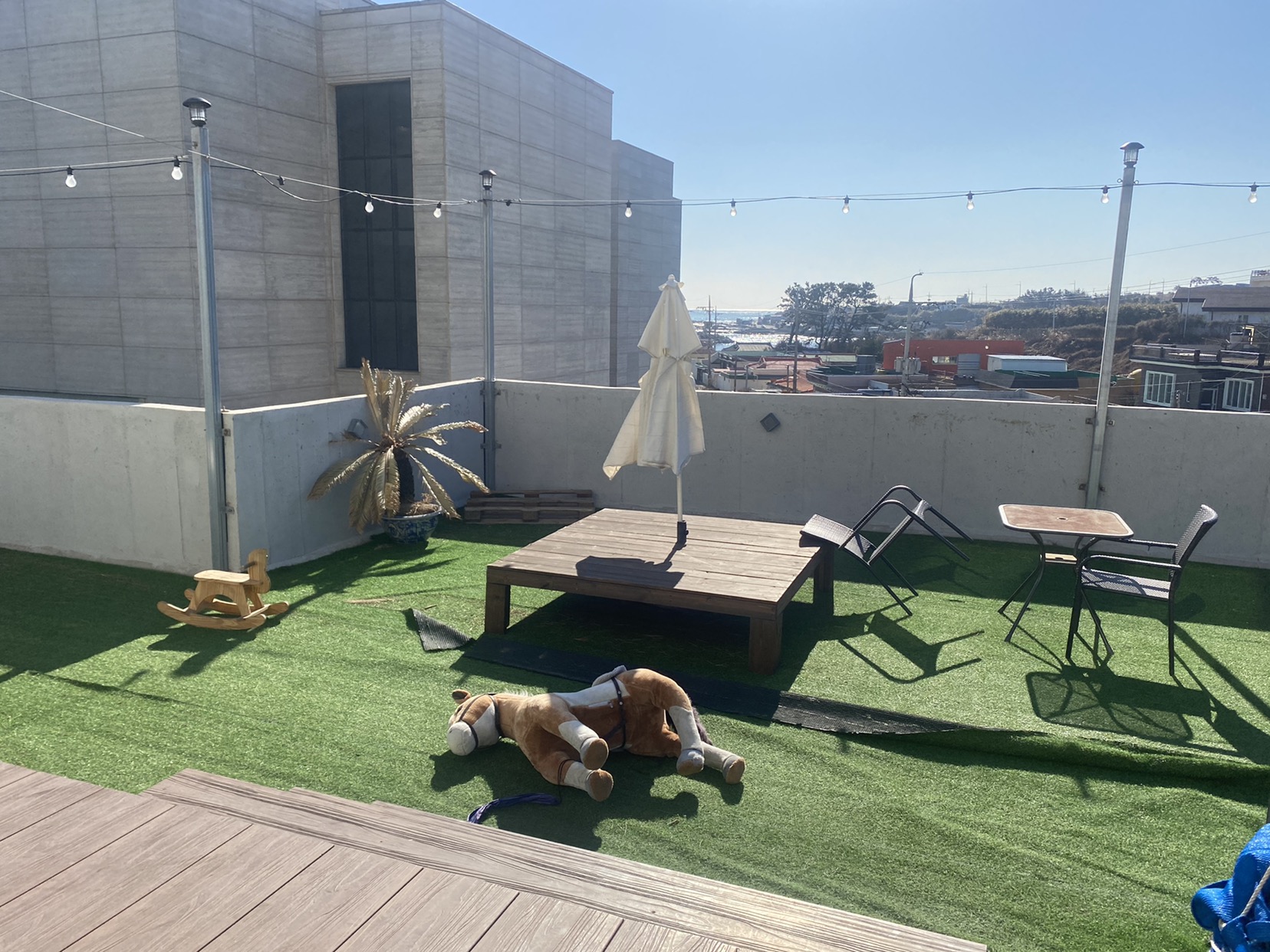 테라스(혹은 작은 야외 공간)가 있다면 가볍게 바다 소리를 듣거나 사진 찍기에 좋을 텐데, 한여름 오후라 잠시 서 있어도 땀이 나더라고요. 그럼에도 인생샷을 건지려는 방문객들이 잠깐씩 나가서 포즈를 취하는 모습이 많았습니다. 바다와 하늘을 배경으로 사진을 남기고 싶다면, 해 질 녘이 훨씬 그림 같으리라 짐작이 됐습니다.