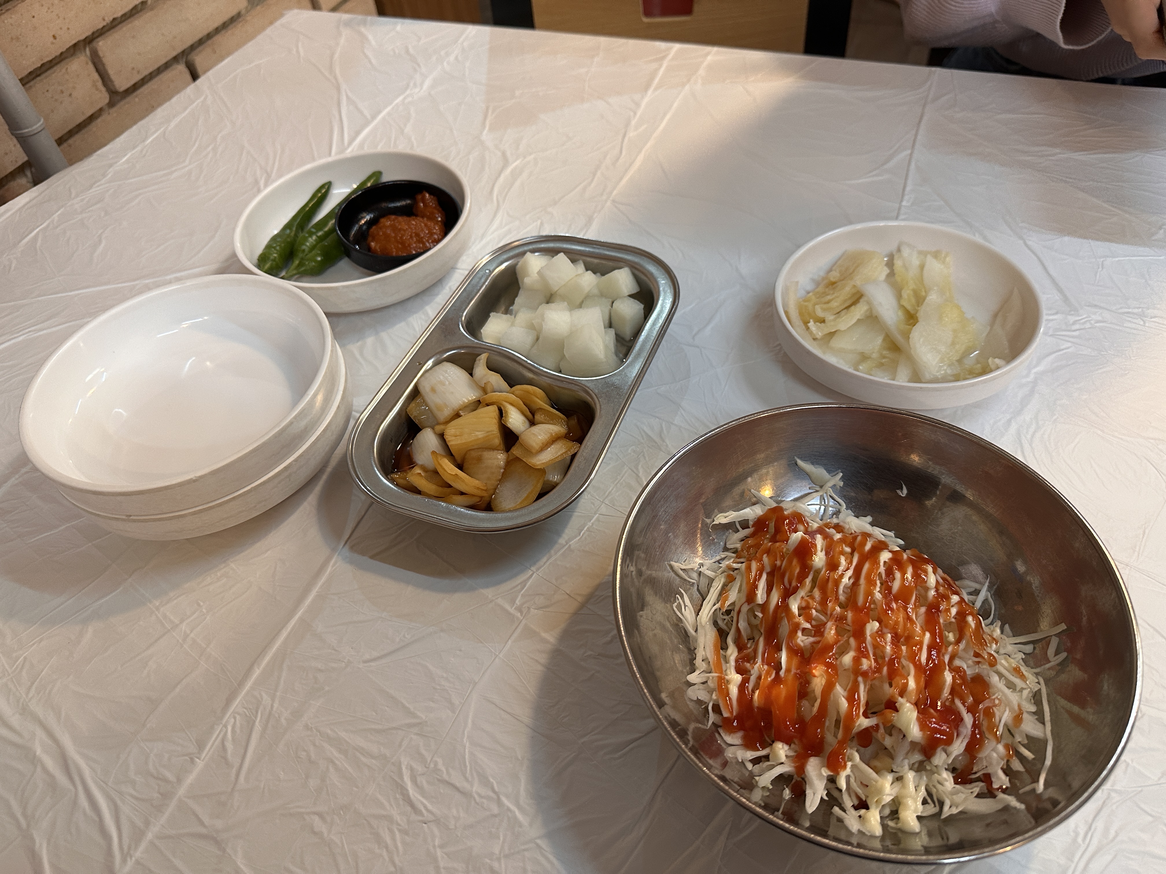 솥뚜껑 위에 큼직한 닭과 다양한 채소(감자, 양파, 대파, 떡사리 등)가 어우러져 자작하게 끓여지는 방식이고, 기본 반찬은 깍두기, 배추김치, 무생채 등으로 구성되어 있습니다. 반찬 리필은 자유롭게 요청할 수 있어 식사 내내 부족함이 없었습니다.