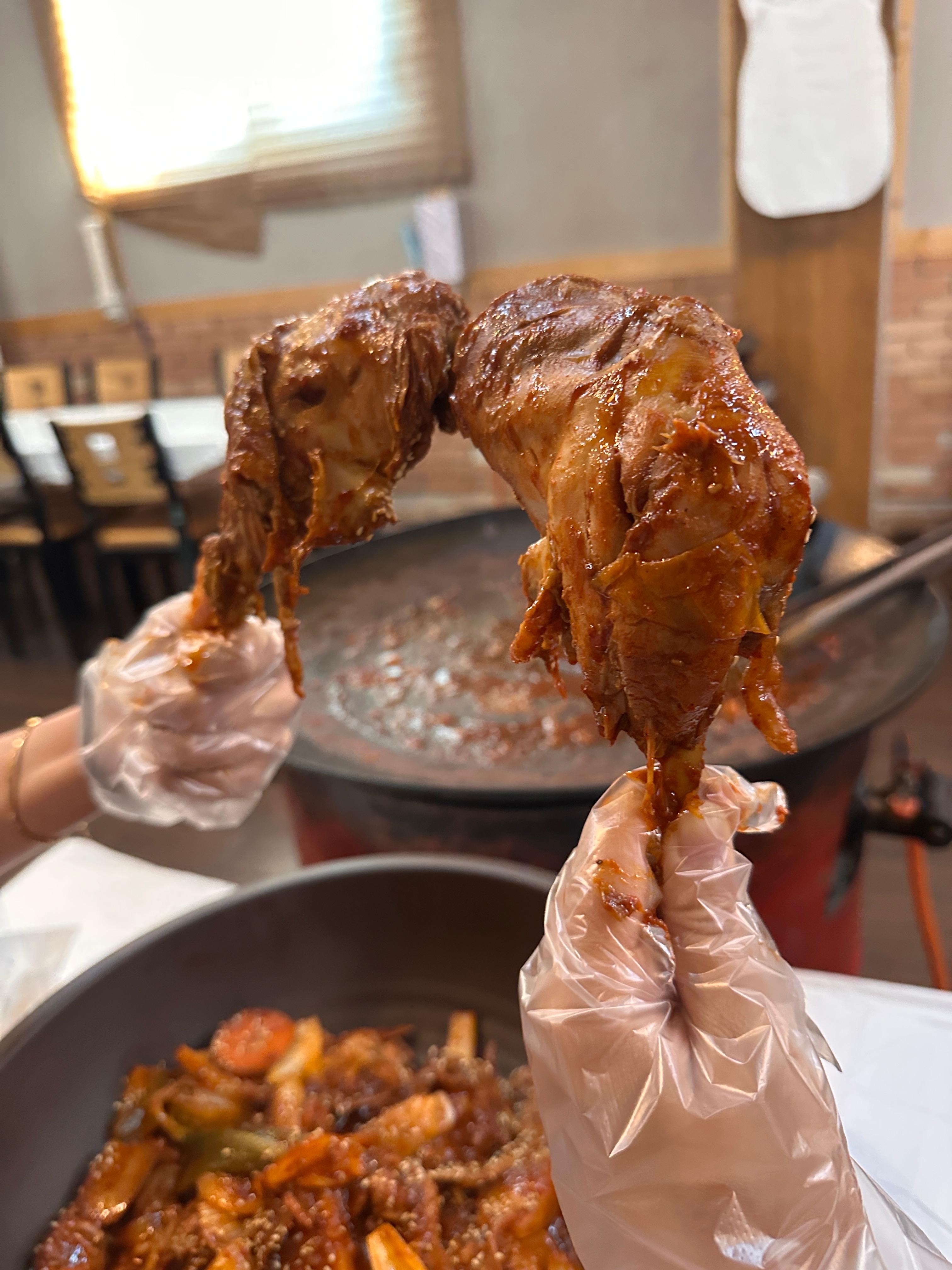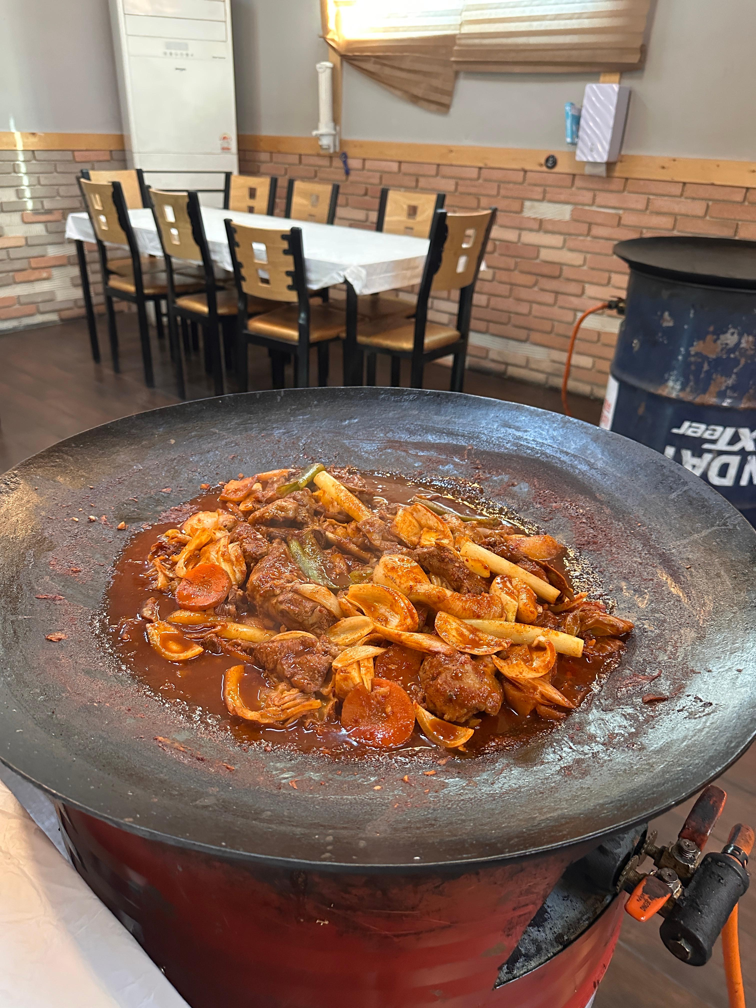 여자 둘이서 소자 닭볶음탕을 주문했습니다. 주문 후 약 10분 정도 기다리자, 커다란 솥뚜껑에 끓고 있는 붉은 닭볶음탕이 등장했습니다. 큼직한 닭고기 조각들과 채소, 빨갛고 진한 국물 비주얼이 식욕을 한껏 자극했습니다.