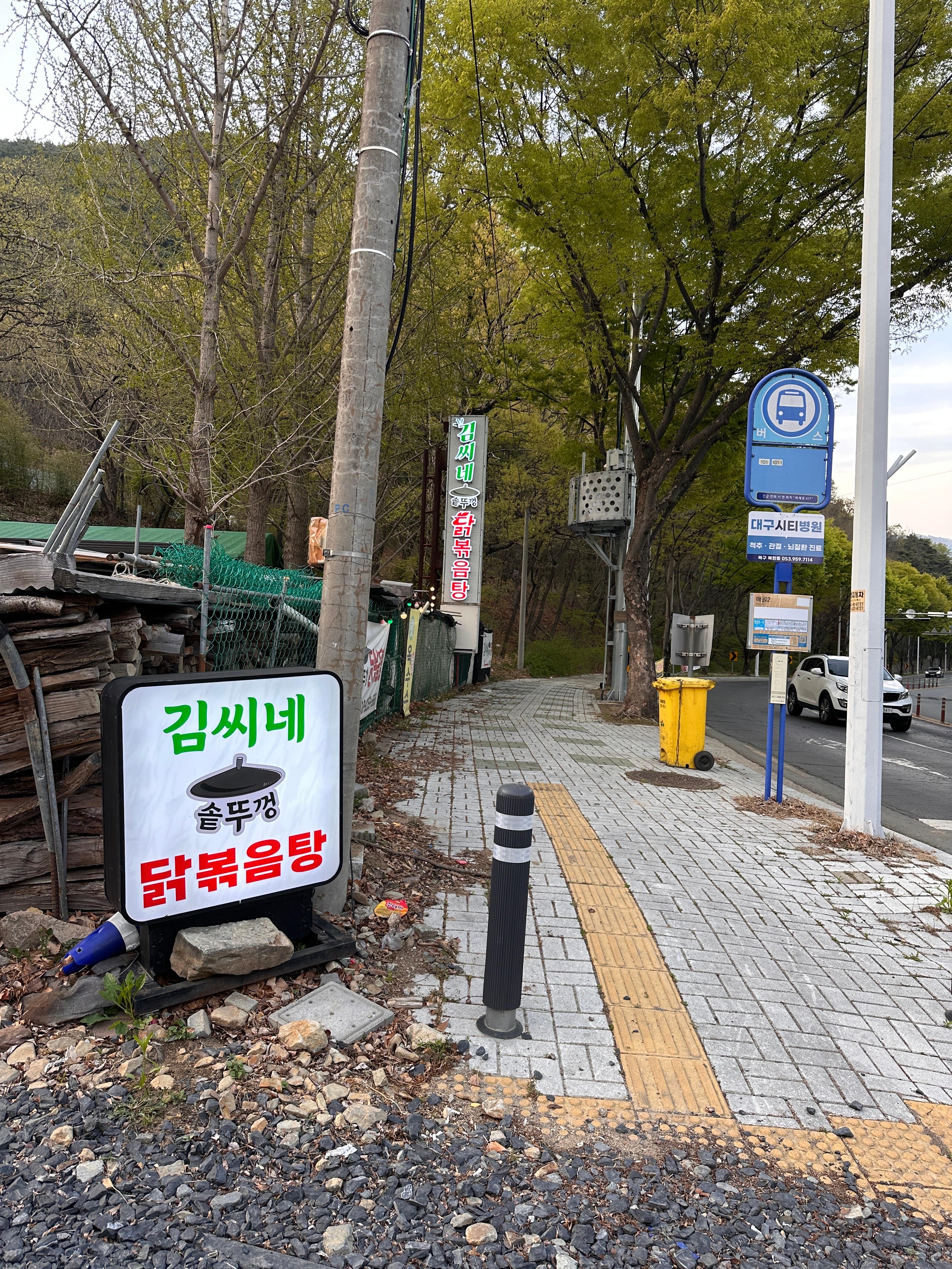 김씨네 솥뚜껑 닭볶음탕은 팔공산 드라이브 코스 초입 부분에 자리하고 있습니다. 도로변에 위치해 있어 접근성이 좋고, 초행길이어도 내비게이션을 따라 쉽게 찾을 수 있습니다.
