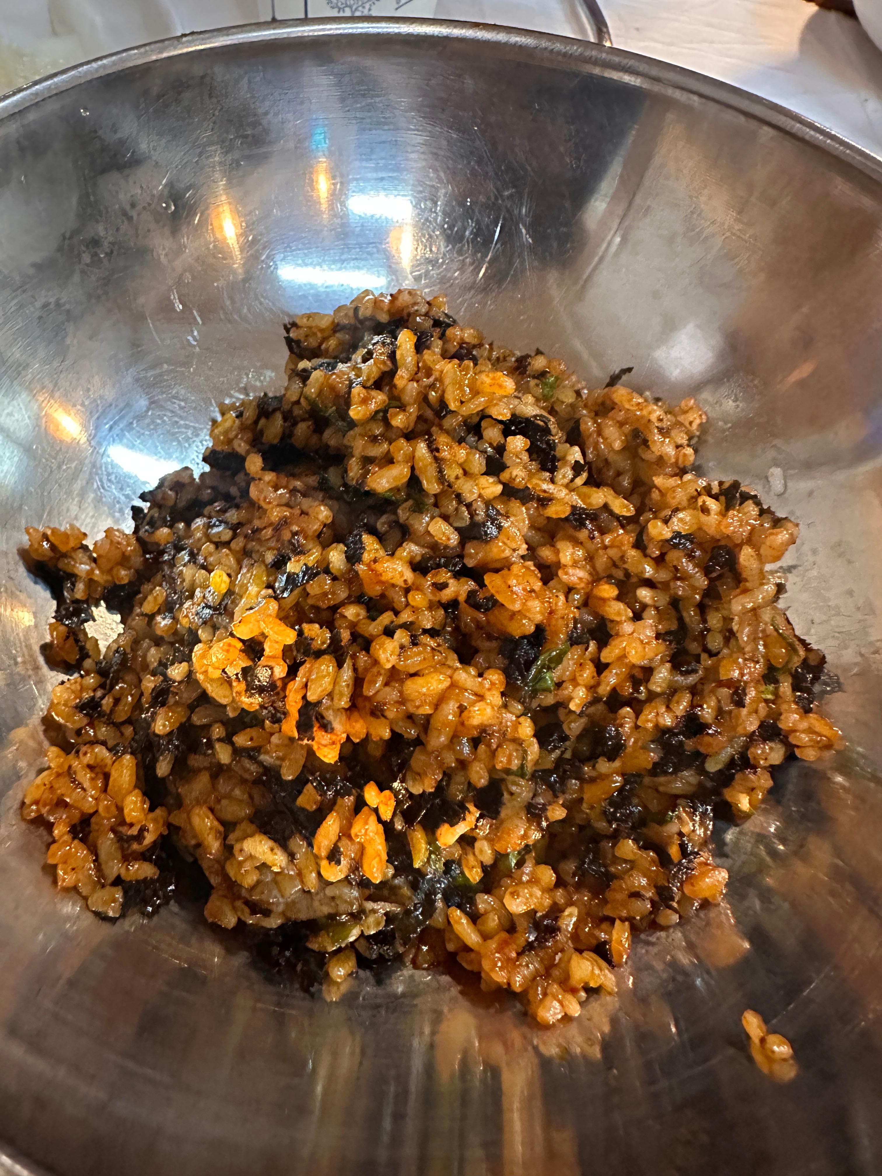 국물과 함께 닭고기와 채소를 실컷 먹고 나니, 남은 양념이 아까워 볶음밥을 주문했습니다. 볶음밥은 직원분이 직접 솥뚜껑에 밥, 김가루, 다진 김치 등을 넣고 정성껏 볶아주셨습니다. 마지막에 얇게 펴서 눌려주셔서 살짝 누룽지가 생겼고, 고소한 냄새가 폭발했습니다.