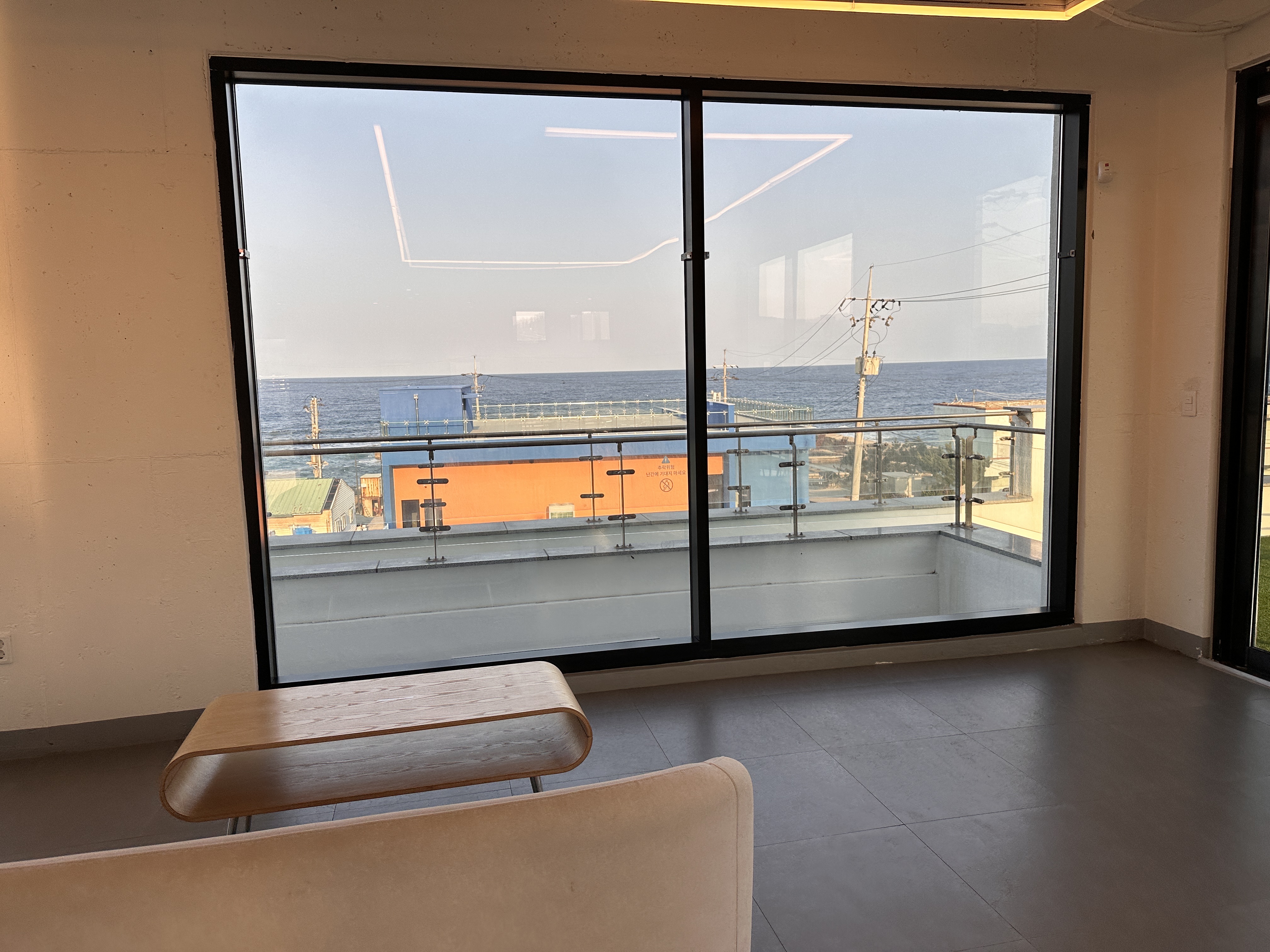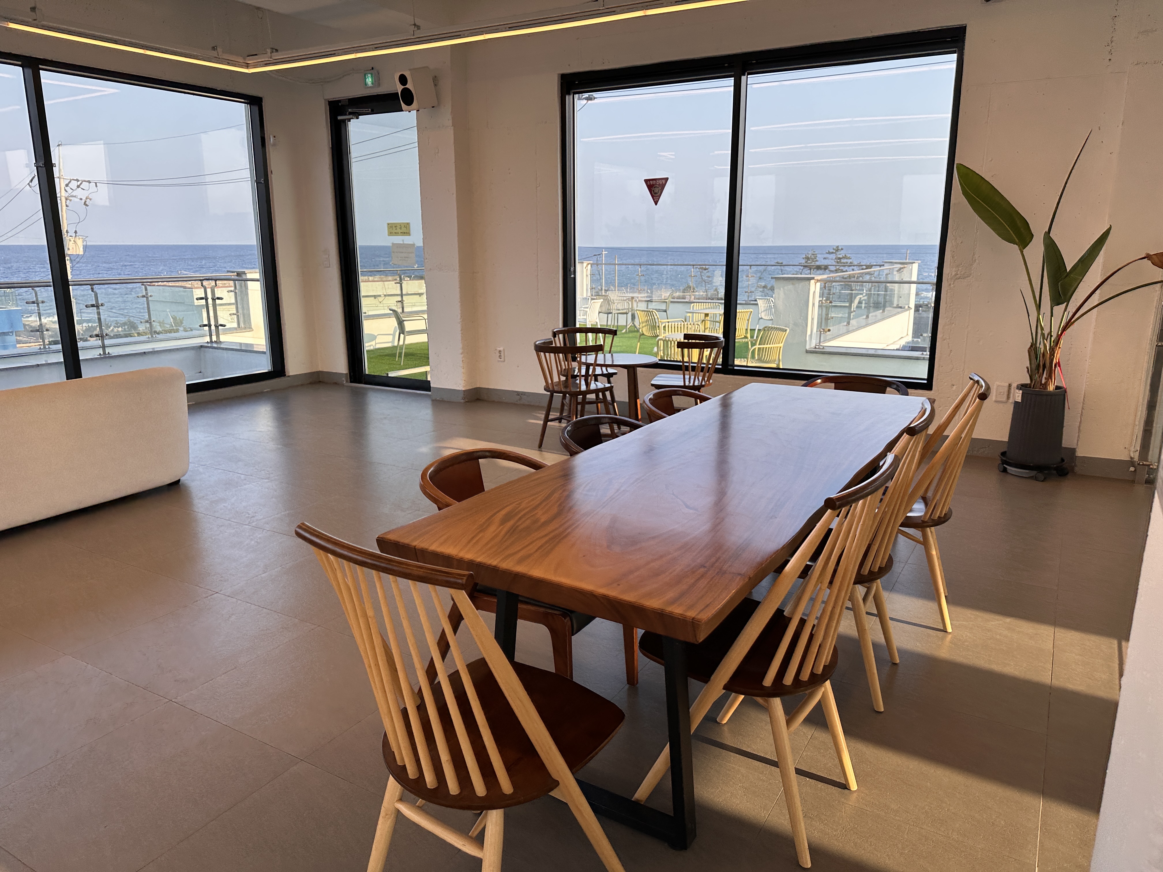 이제 막 메뉴들을 가져다 테이블에 세팅하고 둘러보니, 내부 인테리어가 깔끔하고 따뜻한 느낌이었어요. 특히 원목 테이블과 의자가 자연스럽게 배치돼 있고, 큰 창문 너머로 바다 풍경을 살짝 볼 수 있었습니다. 손님들은 적당히 있었는데, 너무 시끄럽진 않고 조용히 대화를 나누거나 책 읽는 분들도 보이더군요.