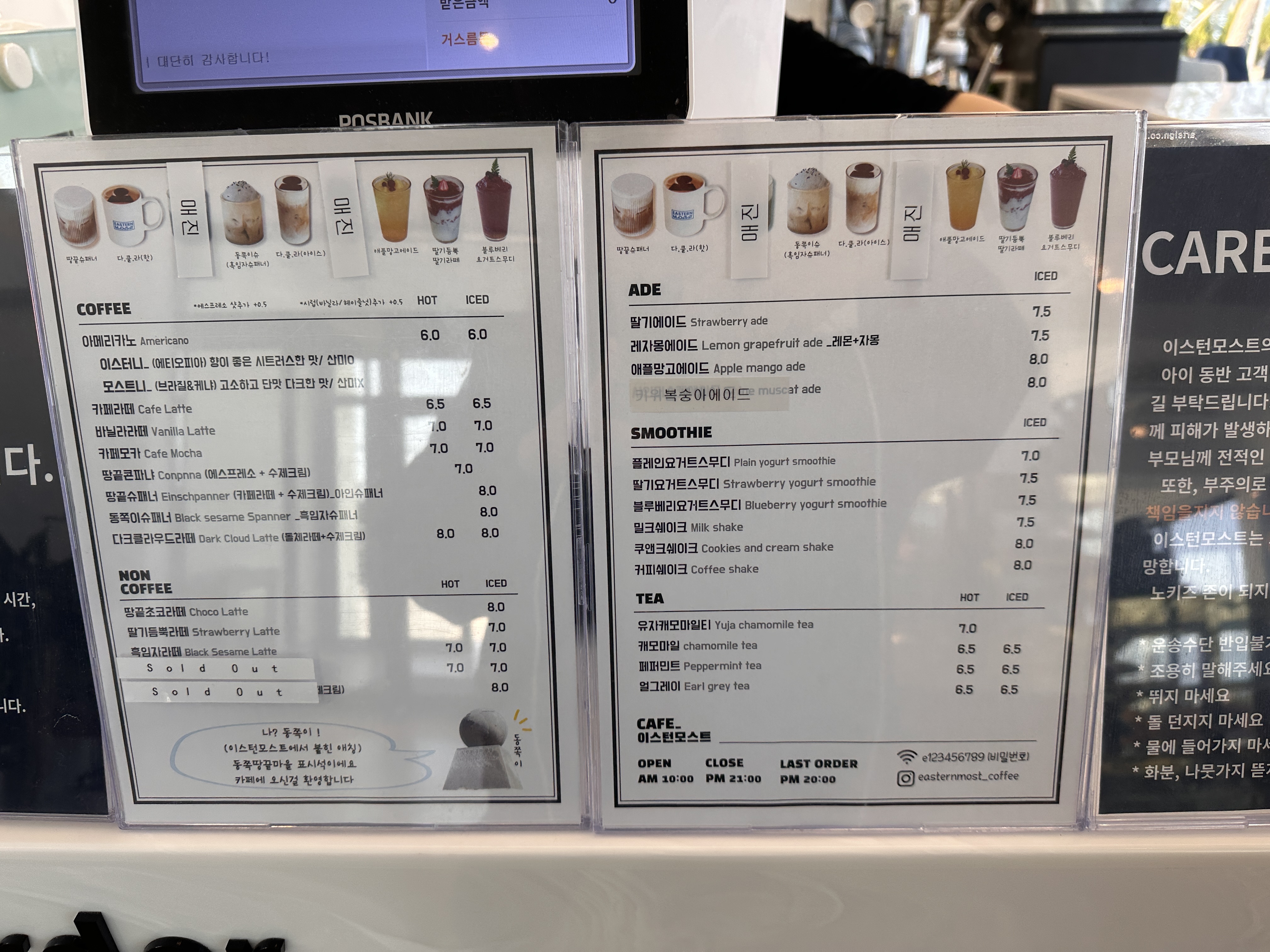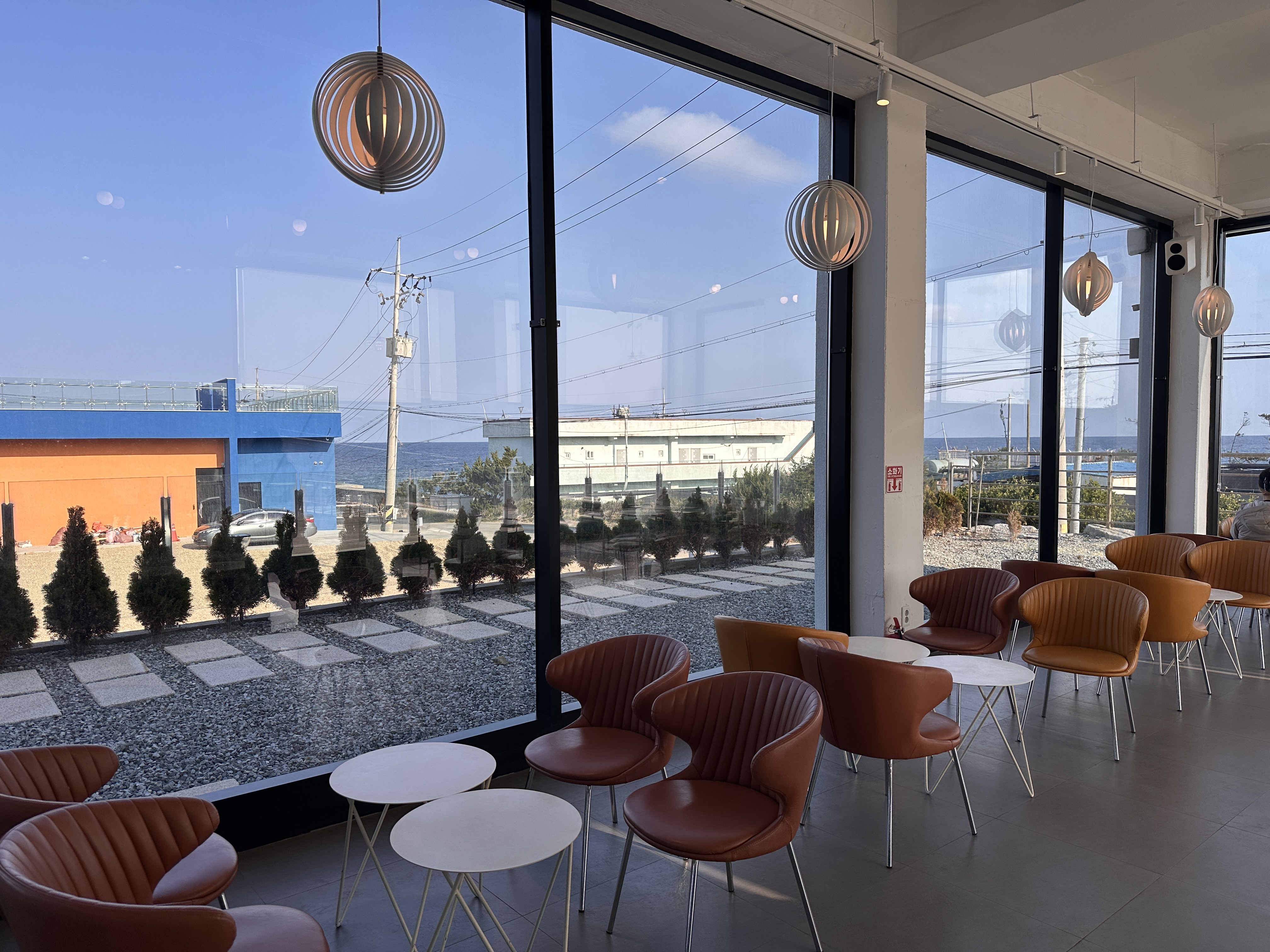 주변에 바다 전망이 펼쳐져 있어서, 가게 입구에 서 있는 순간부터 이미 여행 기분이 물씬 났습니다. 거기에 이스턴모스트라는 가게 이름처럼, 뭔가 동쪽 바다를 바라보며 ‘가장 동쪽에 있는 감성 카페에 온 것 같은’ 느낌이랄까요. 아담한 골목길에 조용한 분위기가 감돌고, 날씨 맑을 때는 구룡포 항구 쪽 풍경도 함께 감상할 수 있었습니다.