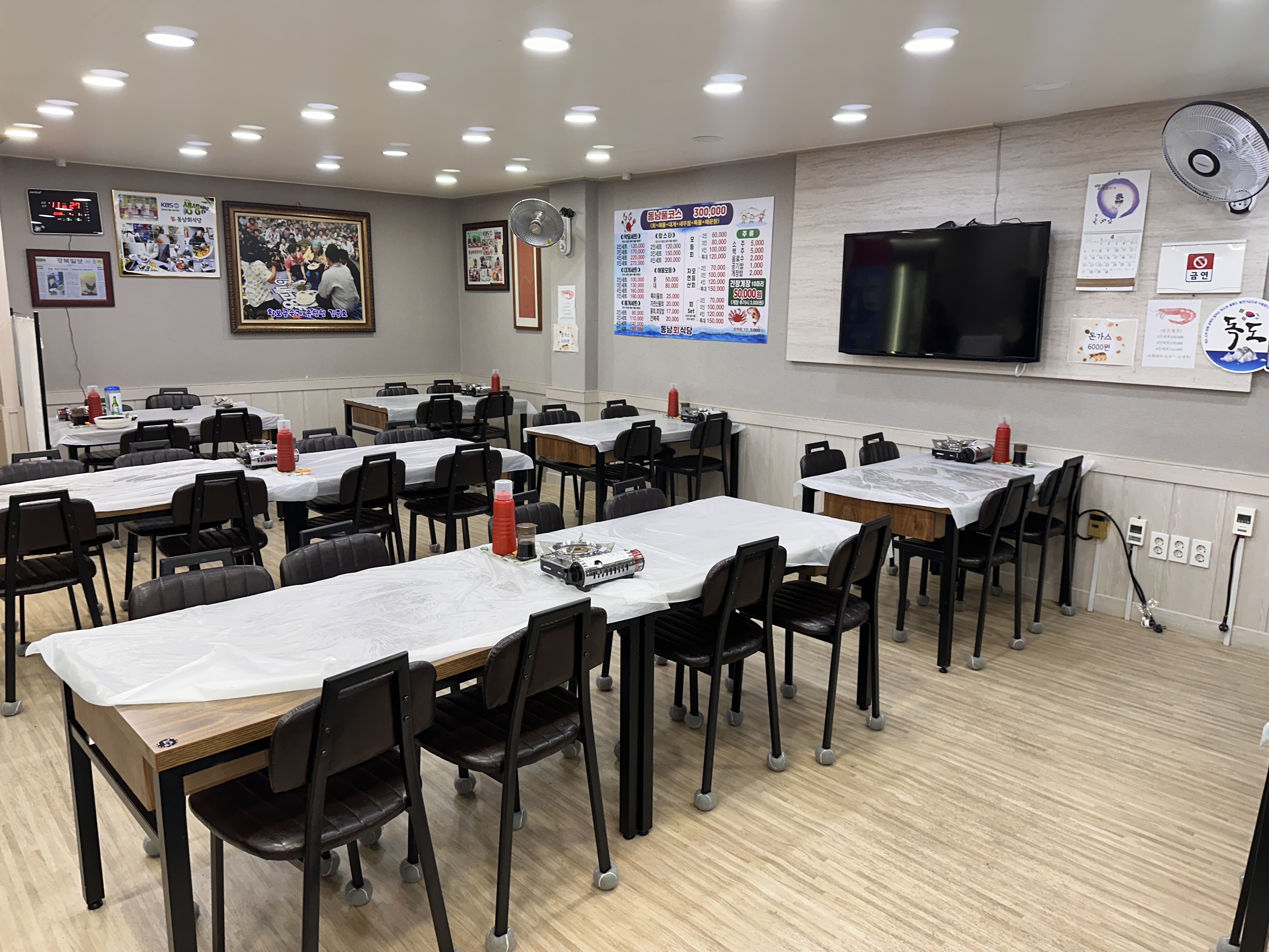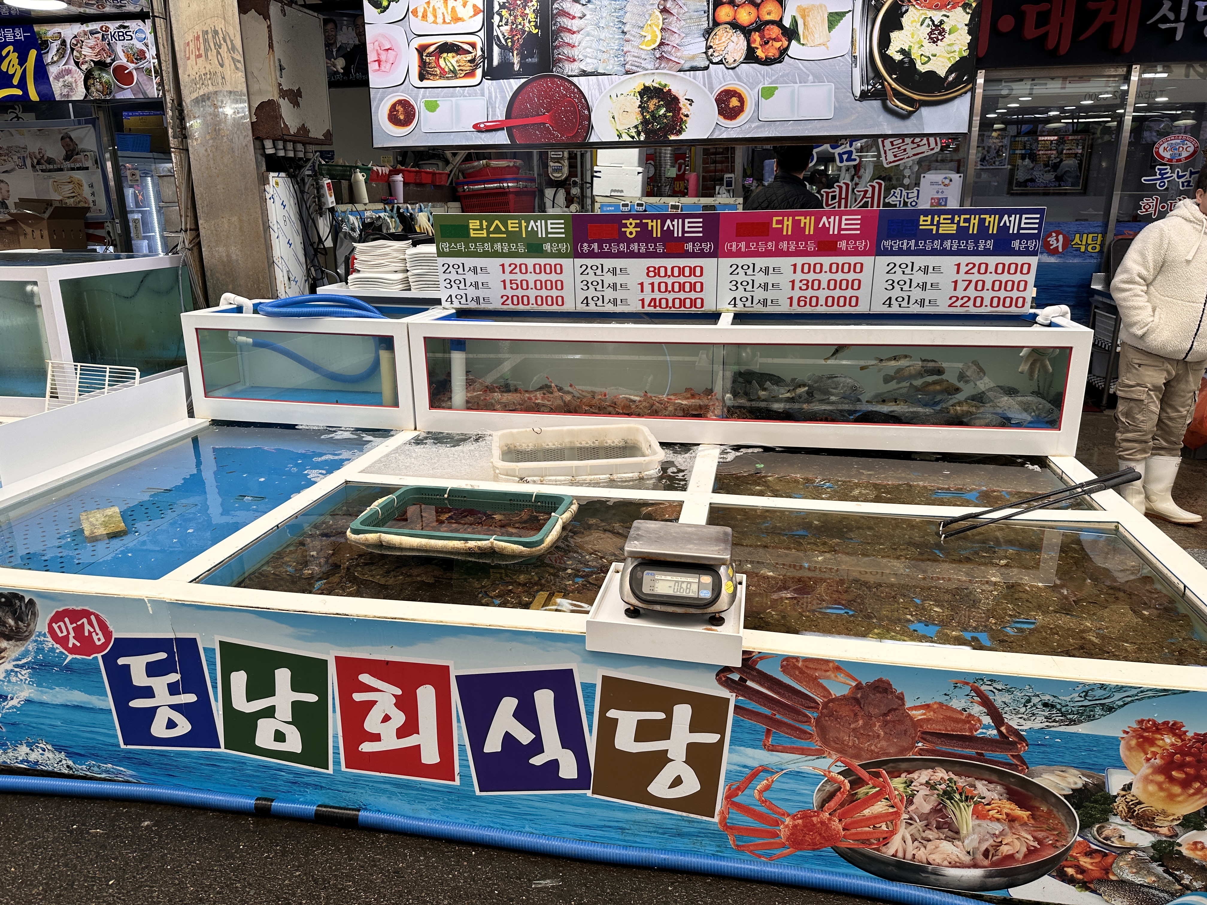 동남회식당은 죽도시장 중심부에서 살짝 안쪽으로 들어간 곳에 있었습니다. 워낙 가게가 많아 길을 헷갈릴 수도 있는데, 시장 입구에서 간판을 잘 찾아가면 어렵지 않게 발견할 수 있어요. 포항 대게 맛집이라는 문구를 걸어 놓은 간판도 보이고, 가게 앞에 홍게나 대게를 쌓아두어 지나가다 보면 자연스럽게 시선을 사로잡습니다. 친구가 미리 알아둔 정보를 토대로 찾아갔지만, 길에 헤매지 않고 무난히 도착할 수 있었습니다.