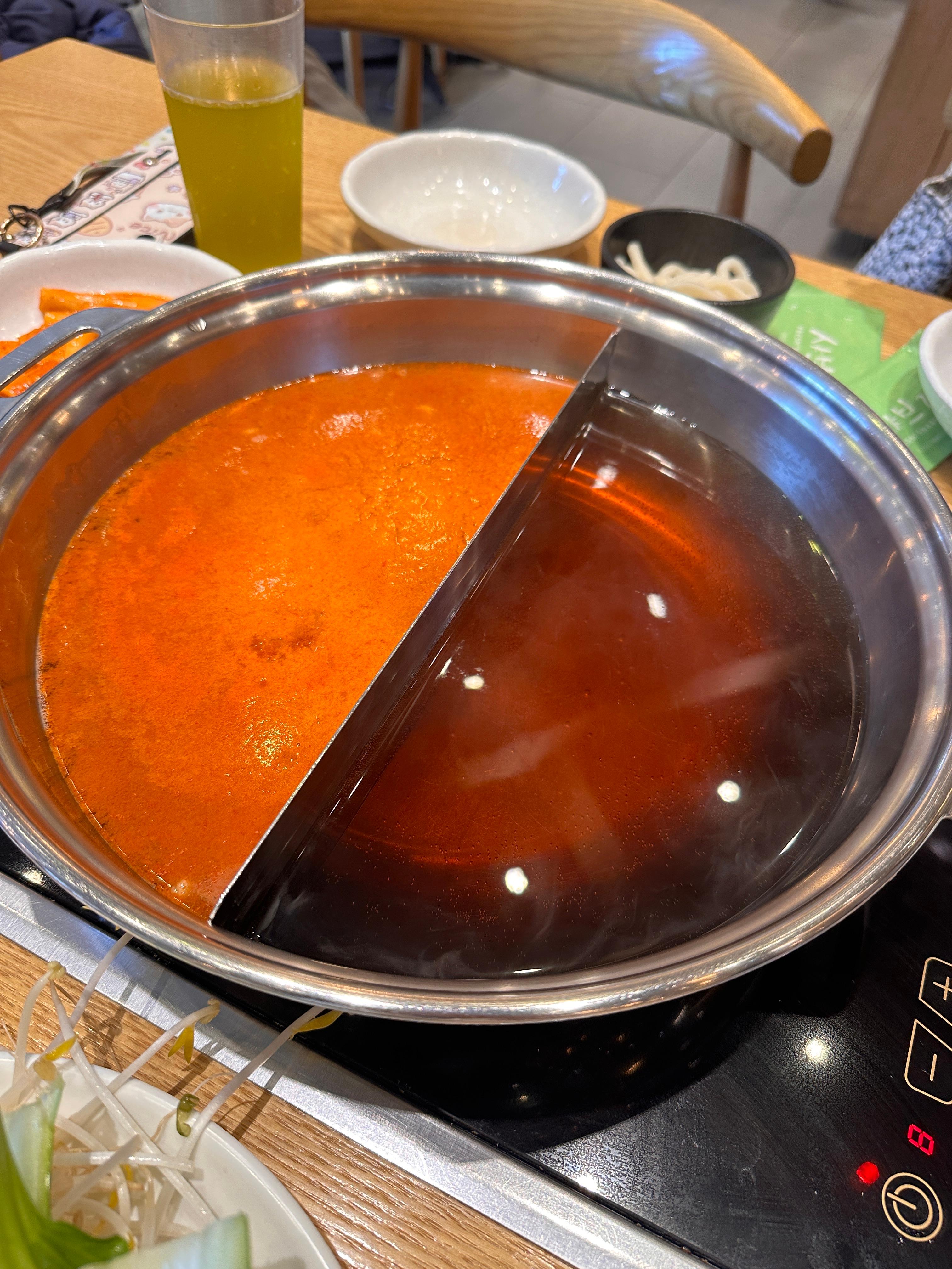 주문 후 곧바로 육수와 야채, 고기가 세팅됐는데, 야채 구성이 알차더군요. 각종 버섯부터 청경채, 배추, 호박 등 신선한 채소들이 접시에 가득 담겨 나왔습니다. 육수는 맑은 육수와 매운 육수 중 선택할 수 있었는데, 저희는 반반으로 나눠서 두 가지 맛을 동시에 즐기는 쪽을 택했습니다.