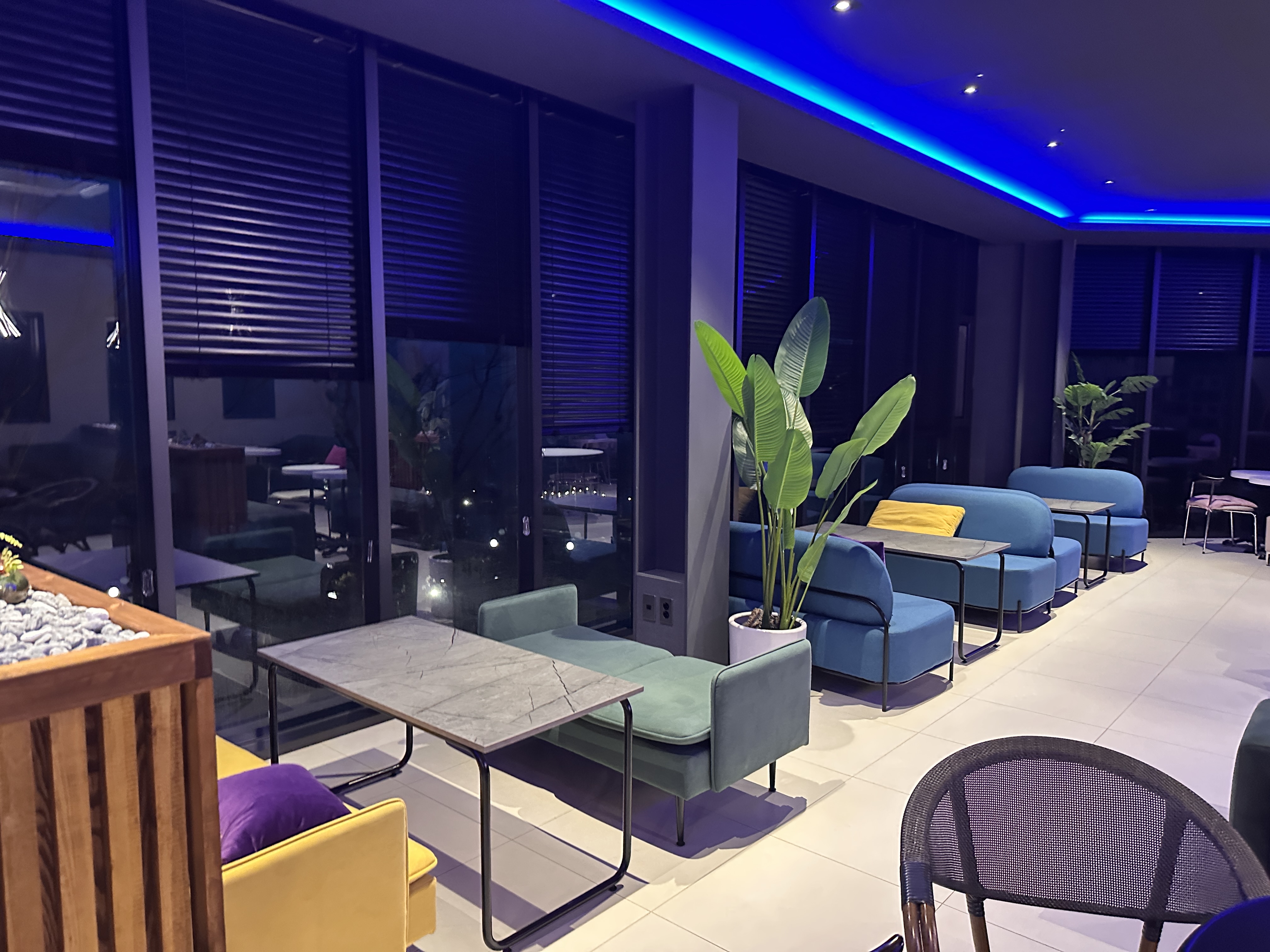 건물 외관이 심플하고 모던한 느낌이었는데, 야외에 은은한 조명 장식이 되어 있어서 밤 풍경을 더욱 아름답게 만들어줬습니다. 현풍 테크노폴리스 카페 특유의 여유로운 분위기도 한몫하는지, 대구 시내에서 느끼는 번잡함과는 다른 정취를 풍기더라고요. 주변에는 다른 음식점과 상가들도 보였지만, 시끄럽기보다는 차분한 분위기였습니다.
